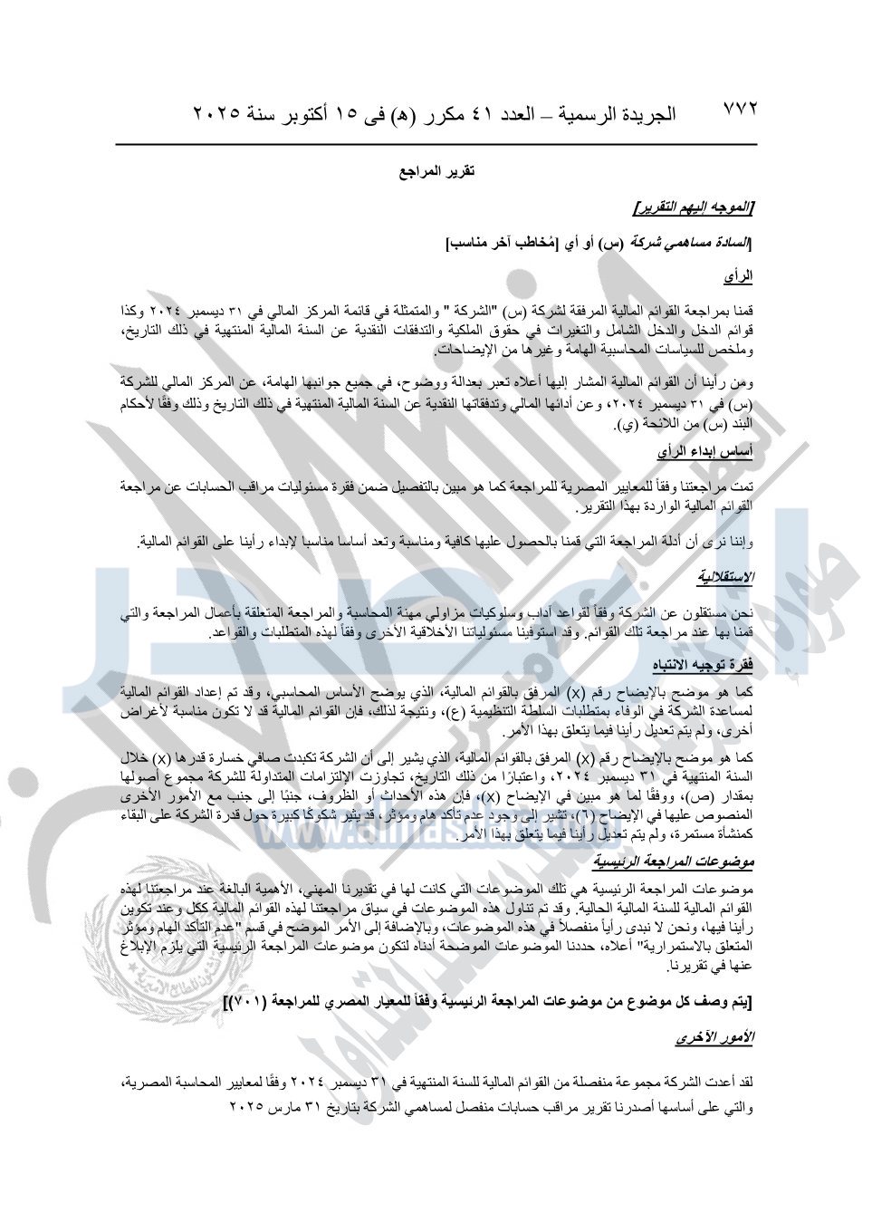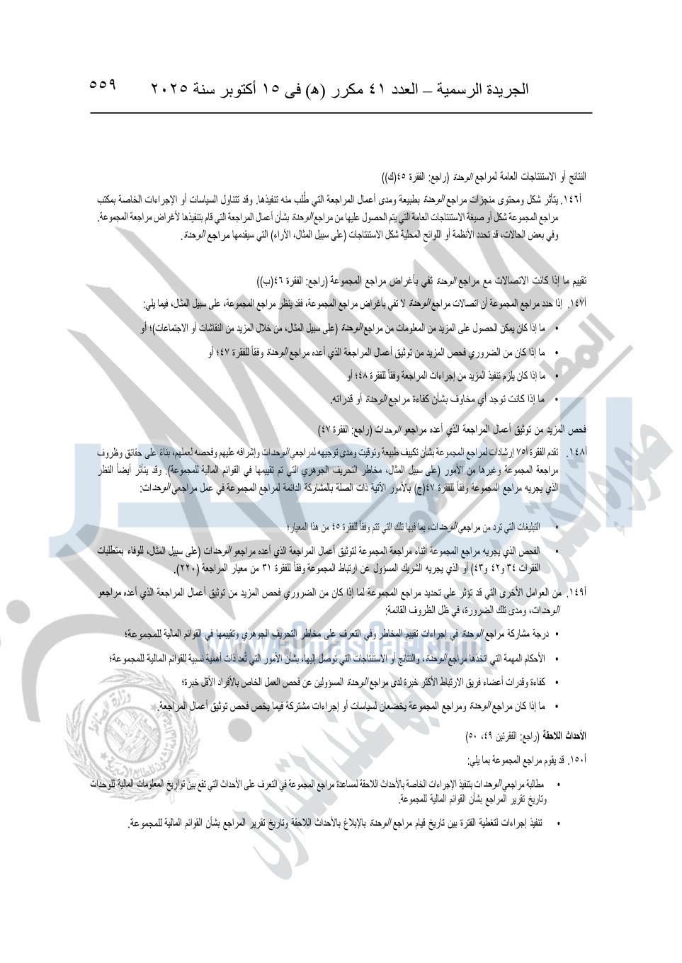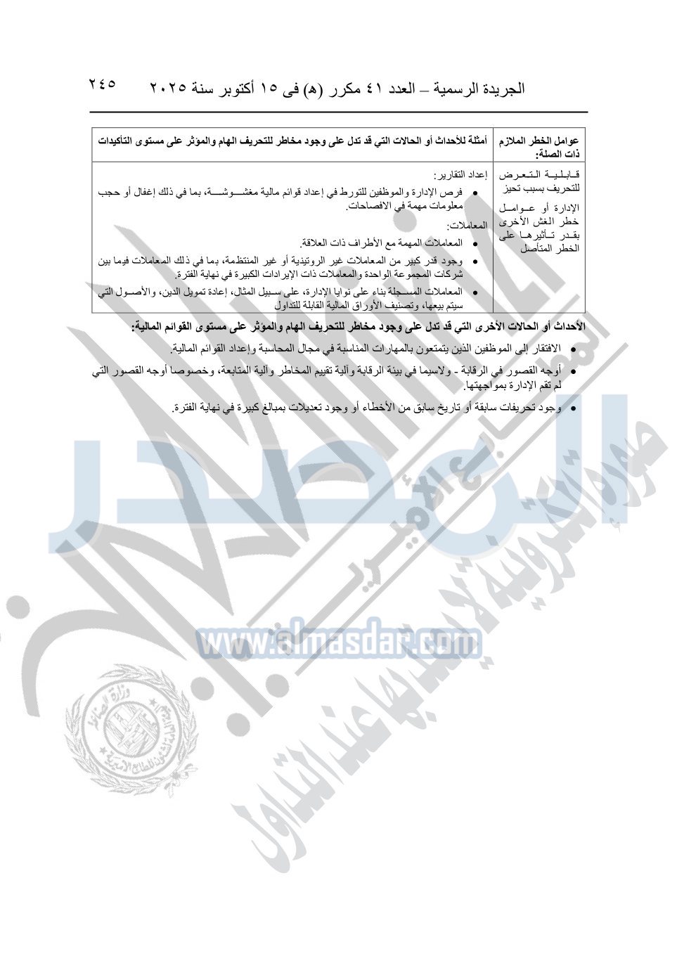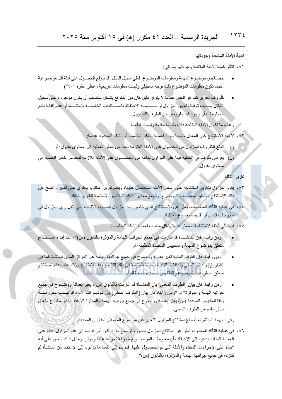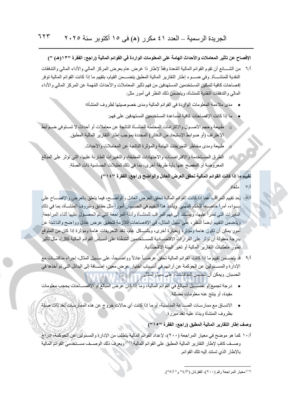 نشرت الجريدة الرسمية في العدد 41 مكرر "هـ" الصادر في 15 أكتوبر سنة 2025، قرار رئيس مجلس الوزراء رقم 3725 لسنة 2025، بشأن العمل بالمعايير المصرية للمراجعة والفحص المحدود ومهام التأكد الأخرى المرافقة لهذا القرار.