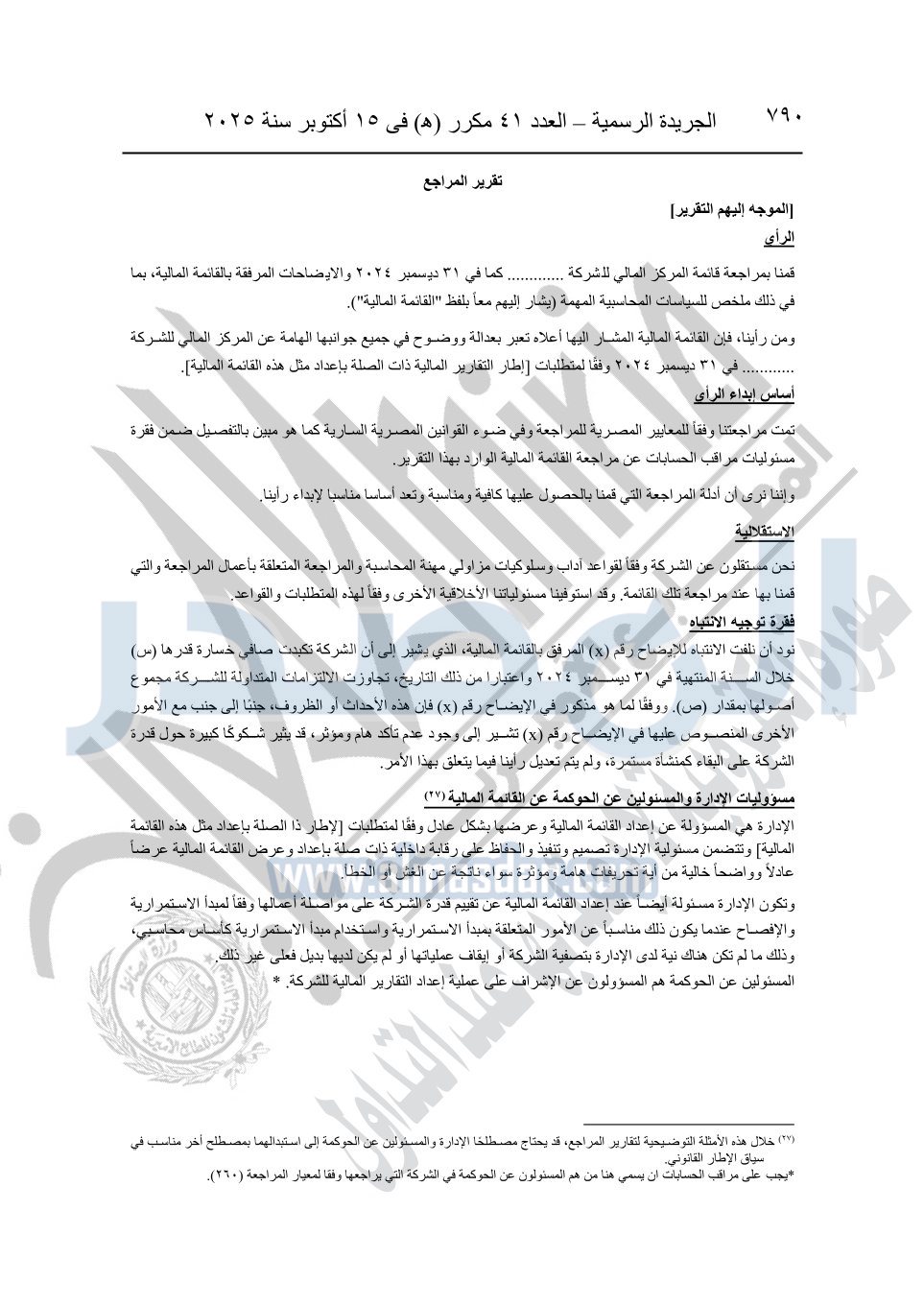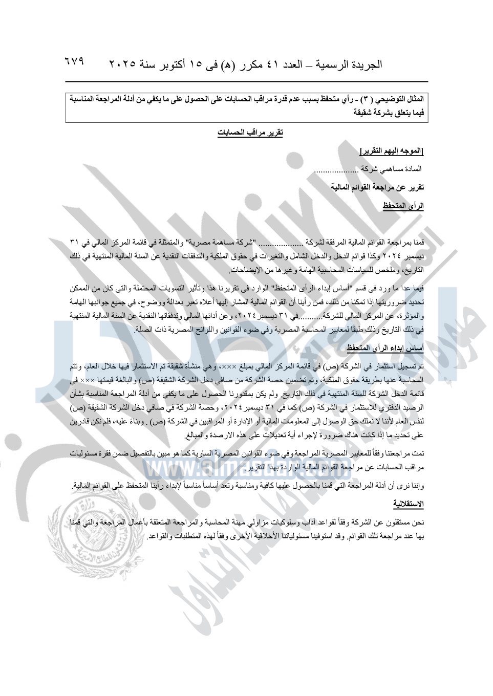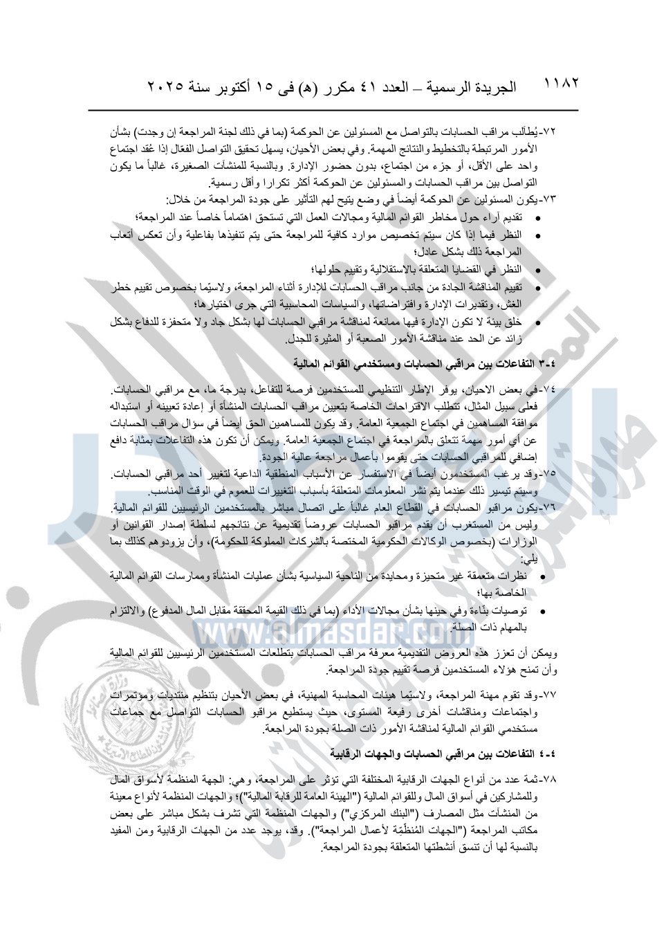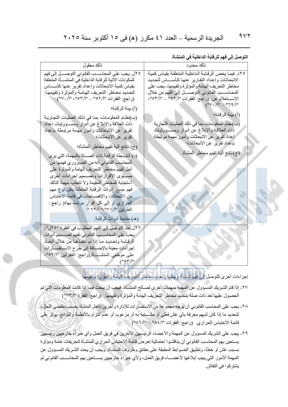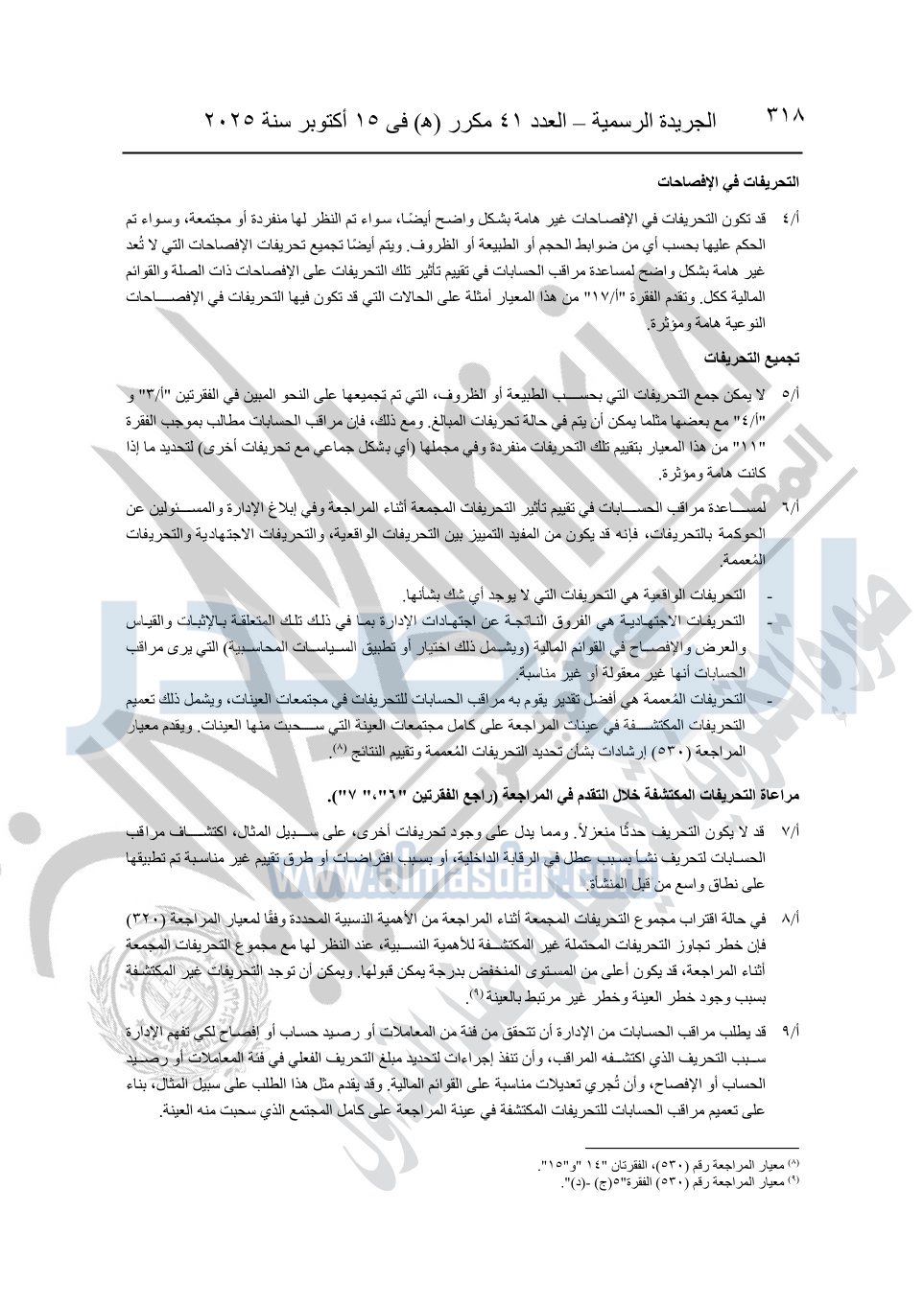 نشرت الجريدة الرسمية في العدد 41 مكرر "هـ" الصادر في 15 أكتوبر سنة 2025، قرار رئيس مجلس الوزراء رقم 3725 لسنة 2025، بشأن العمل بالمعايير المصرية للمراجعة والفحص المحدود ومهام التأكد الأخرى المرافقة لهذا القرار.