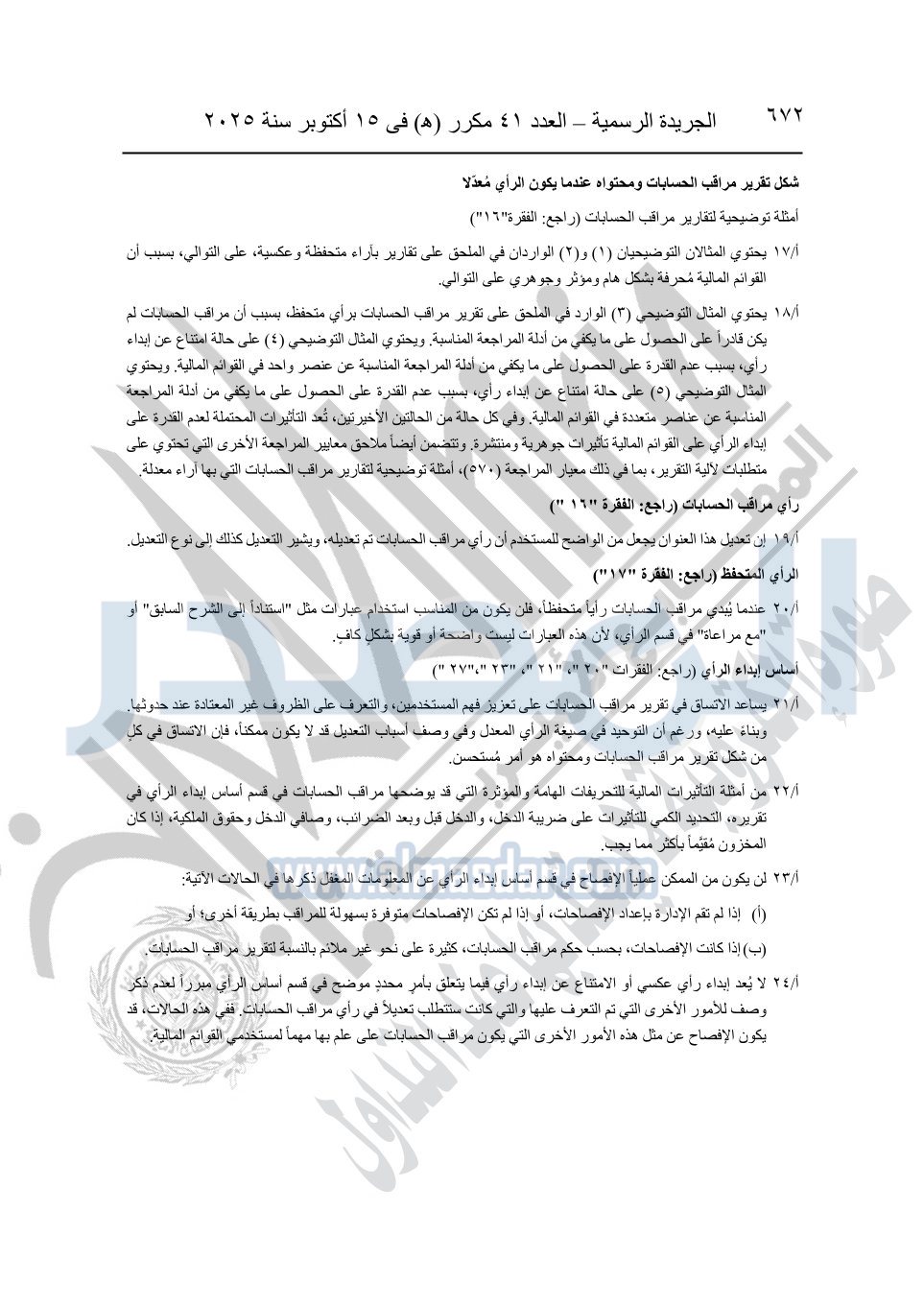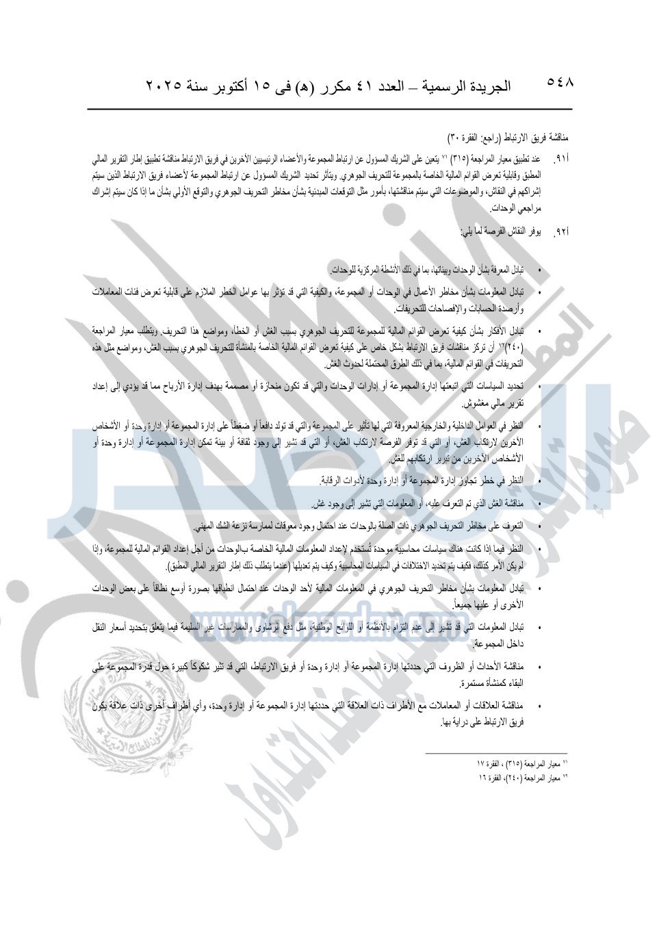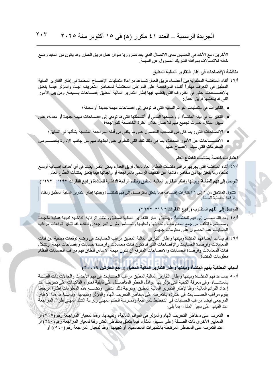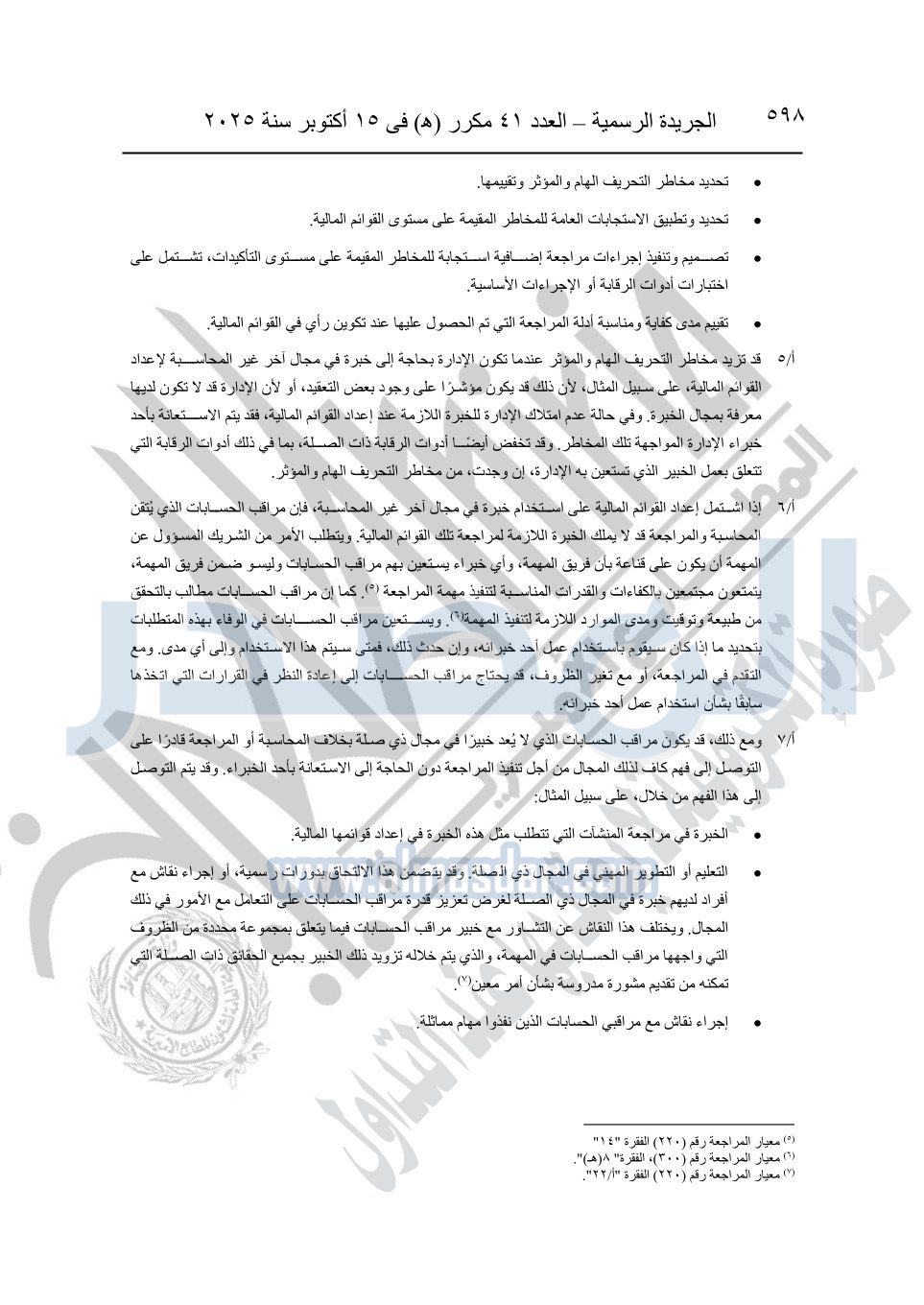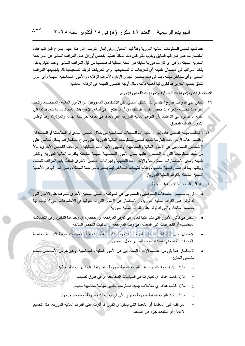 نشرت الجريدة الرسمية في العدد 41 مكرر "هـ" الصادر في 15 أكتوبر سنة 2025، قرار رئيس مجلس الوزراء رقم 3725 لسنة 2025، بشأن العمل بالمعايير المصرية للمراجعة والفحص المحدود ومهام التأكد الأخرى المرافقة لهذا القرار.