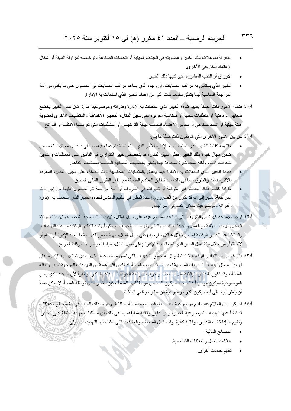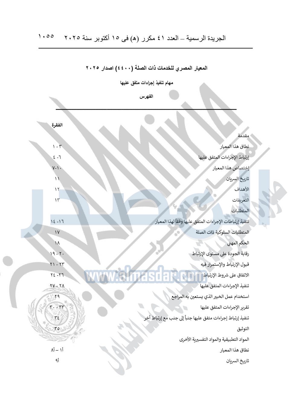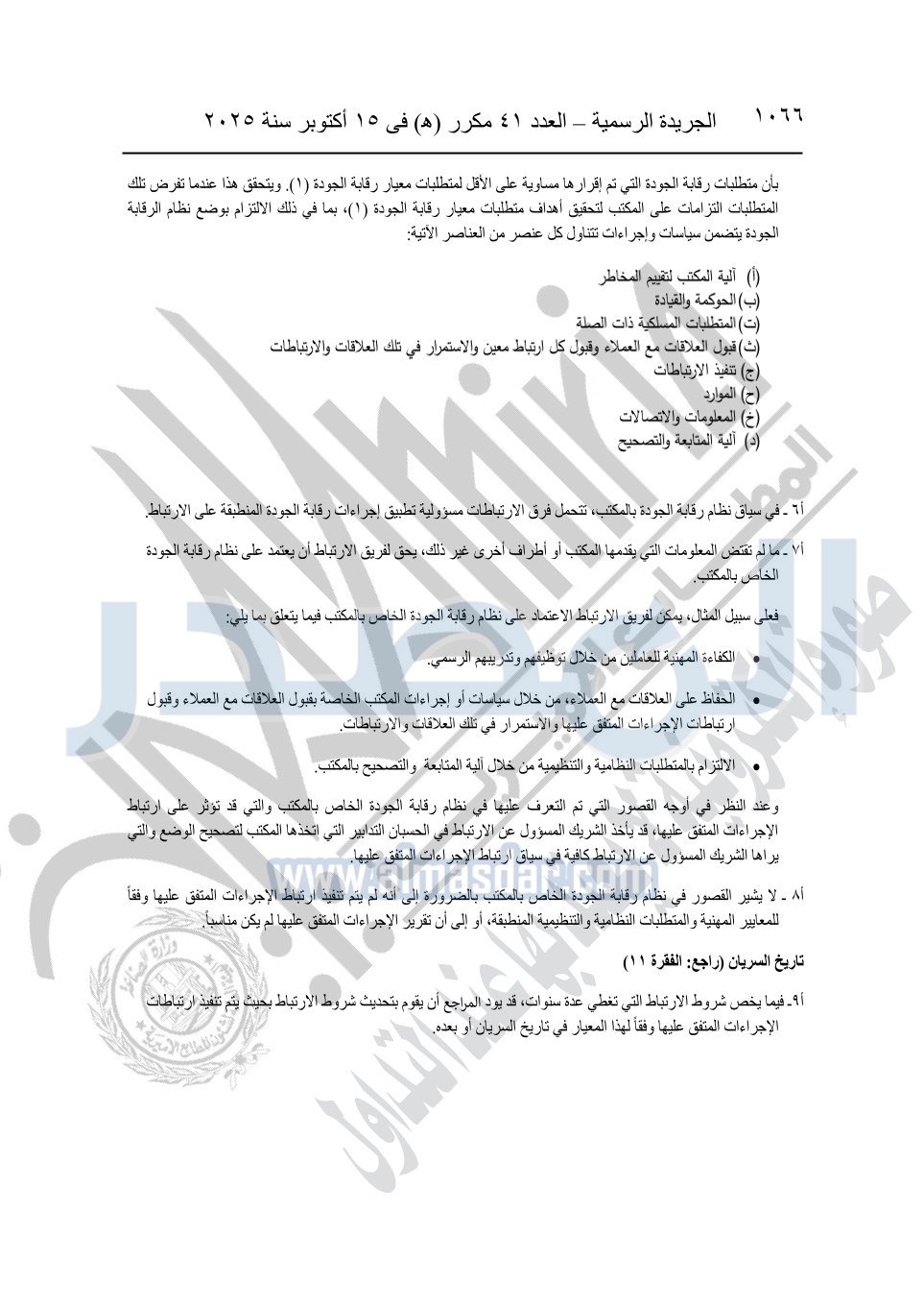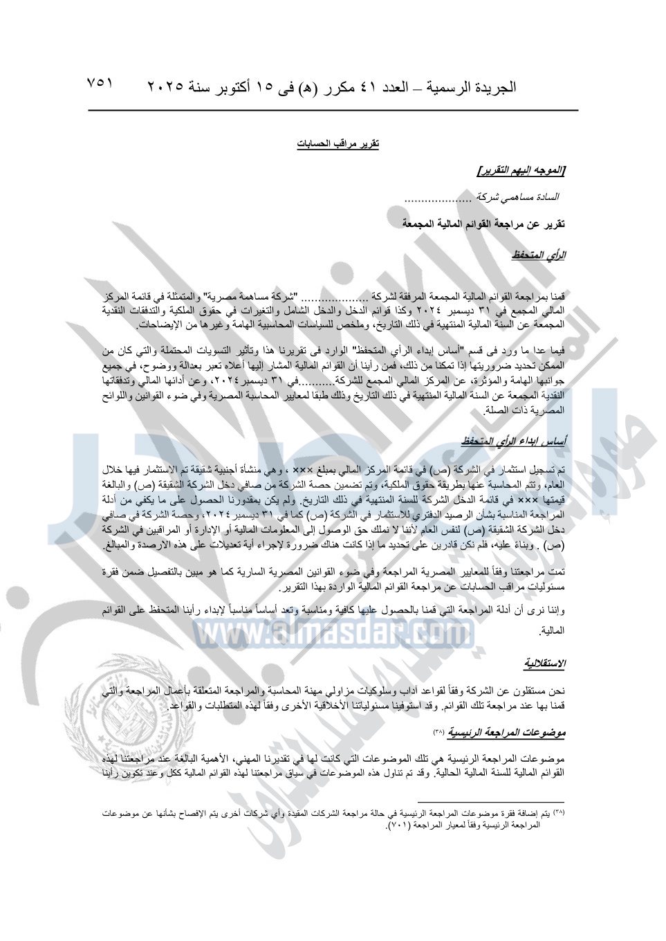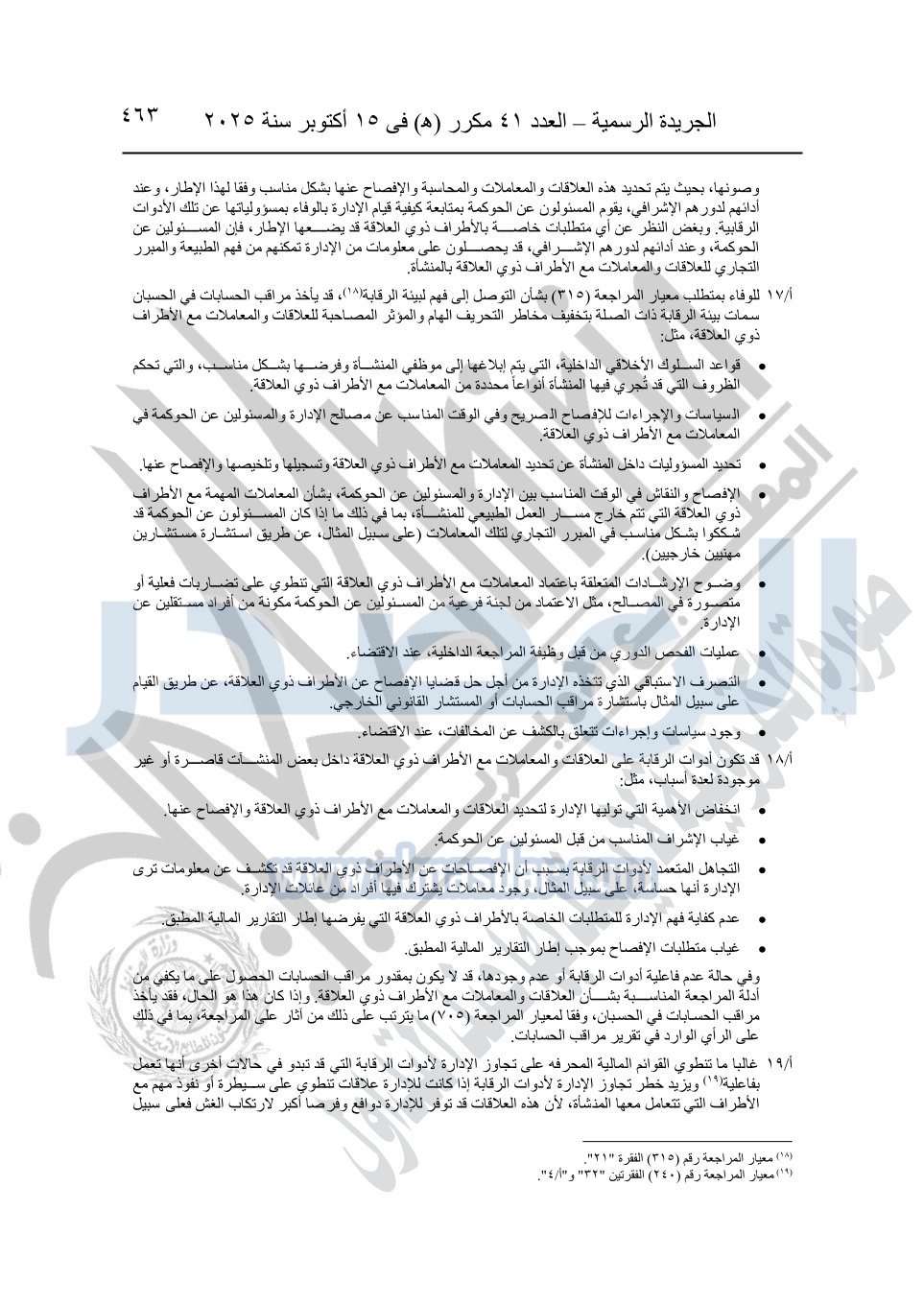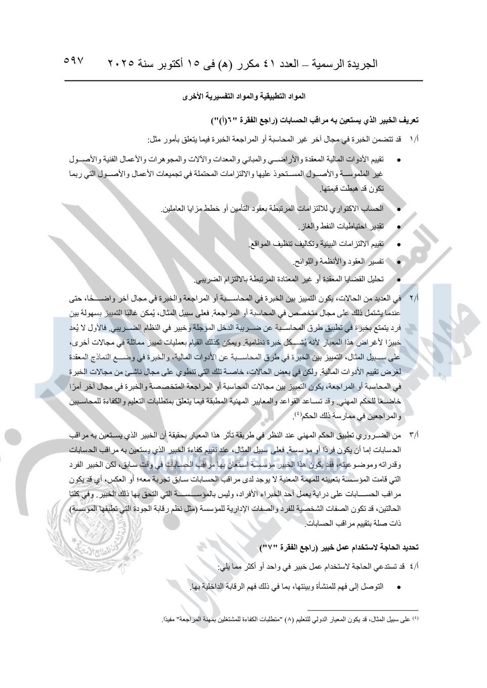 نشرت الجريدة الرسمية في العدد 41 مكرر "هـ" الصادر في 15 أكتوبر سنة 2025، قرار رئيس مجلس الوزراء رقم 3725 لسنة 2025، بشأن العمل بالمعايير المصرية للمراجعة والفحص المحدود ومهام التأكد الأخرى المرافقة لهذا القرار.