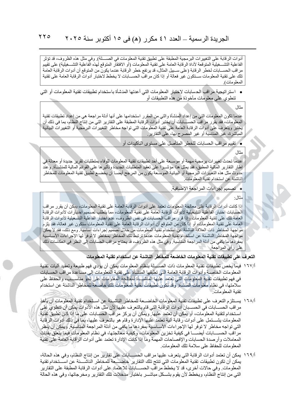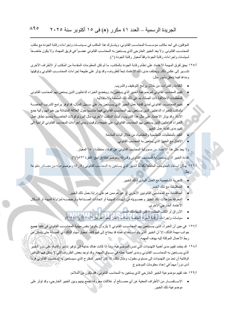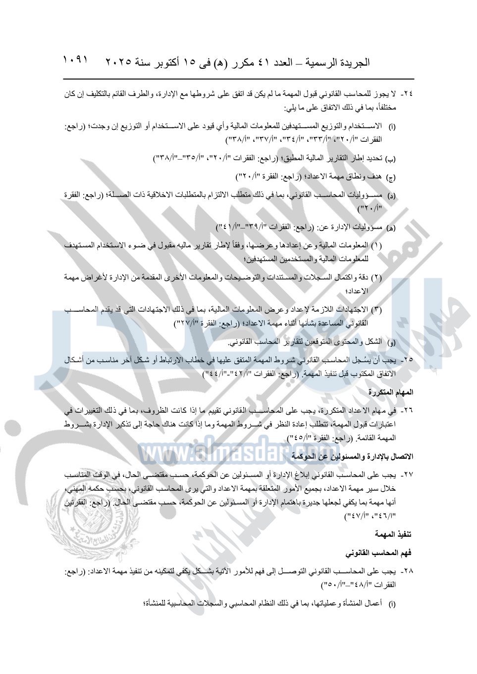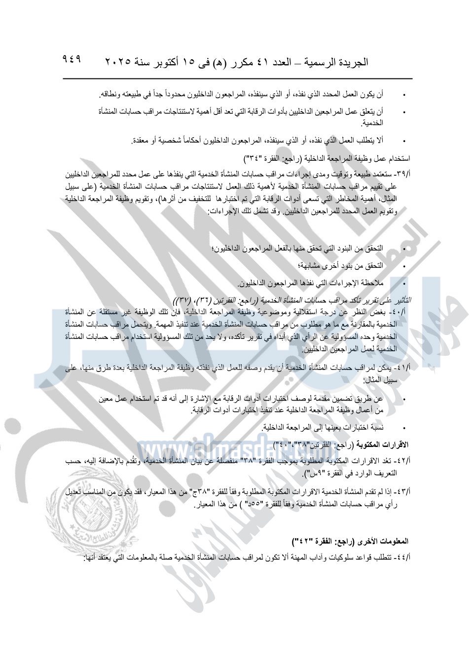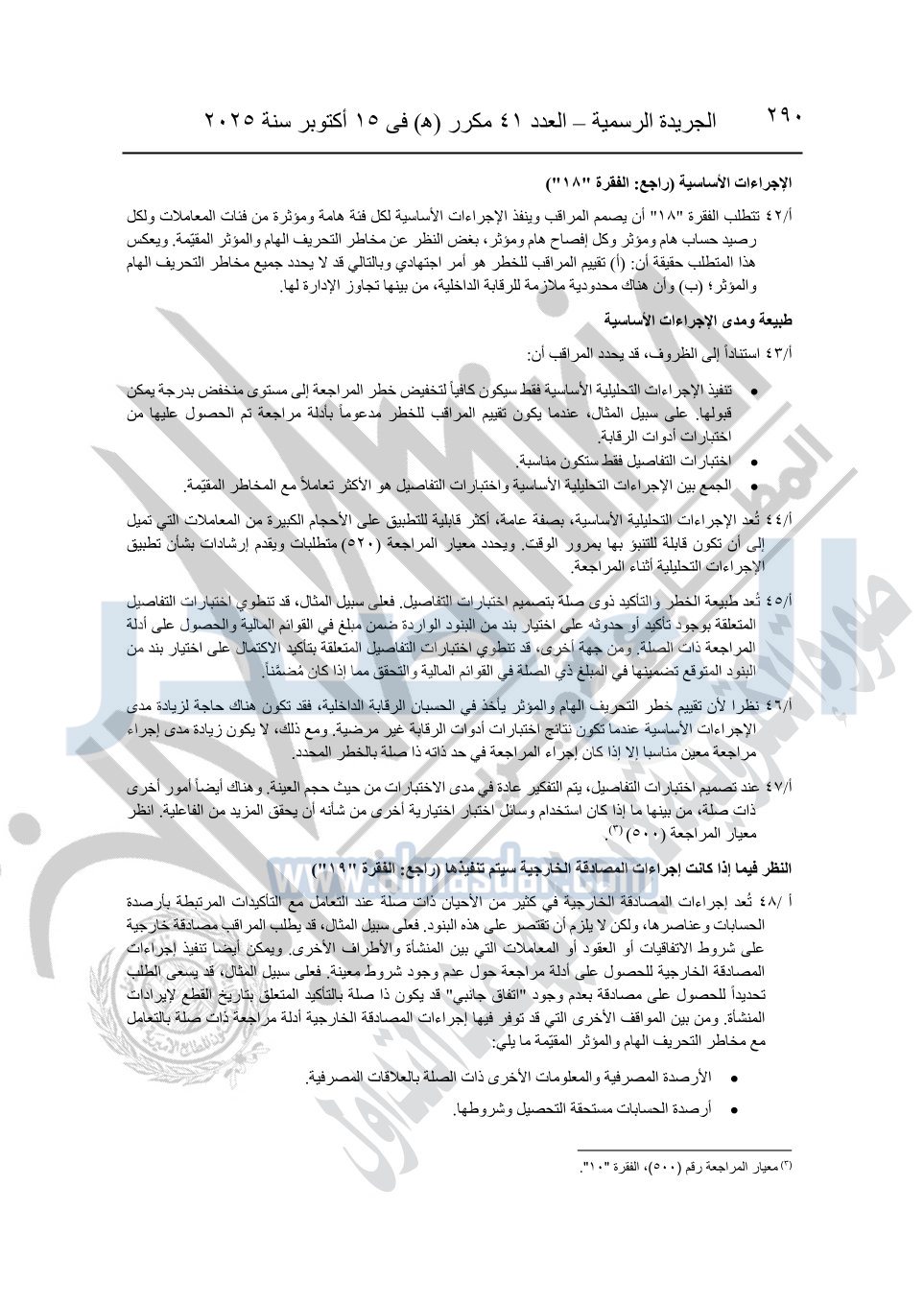 نشرت الجريدة الرسمية في العدد 41 مكرر "هـ" الصادر في 15 أكتوبر سنة 2025، قرار رئيس مجلس الوزراء رقم 3725 لسنة 2025، بشأن العمل بالمعايير المصرية للمراجعة والفحص المحدود ومهام التأكد الأخرى المرافقة لهذا القرار.