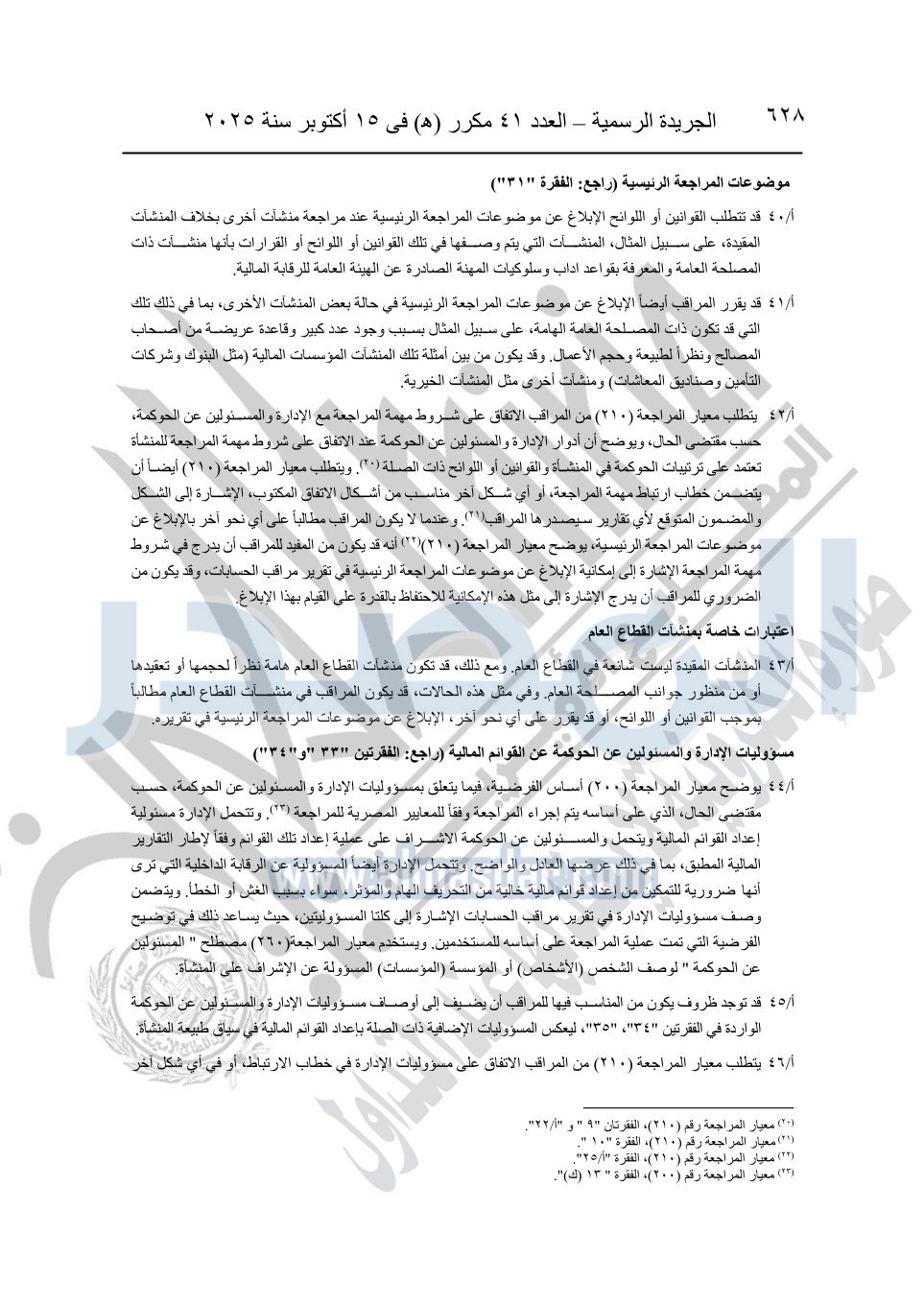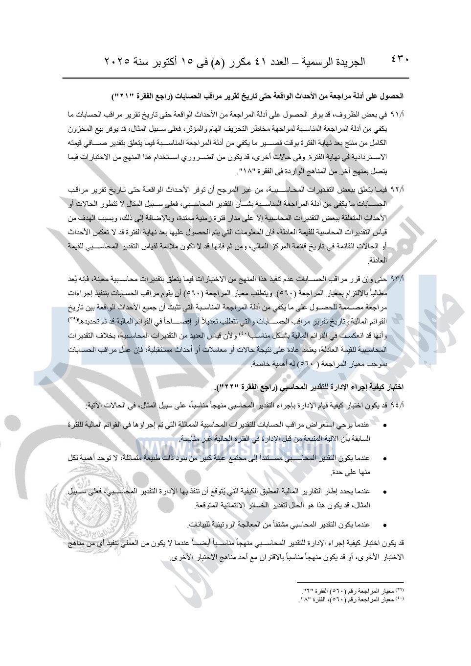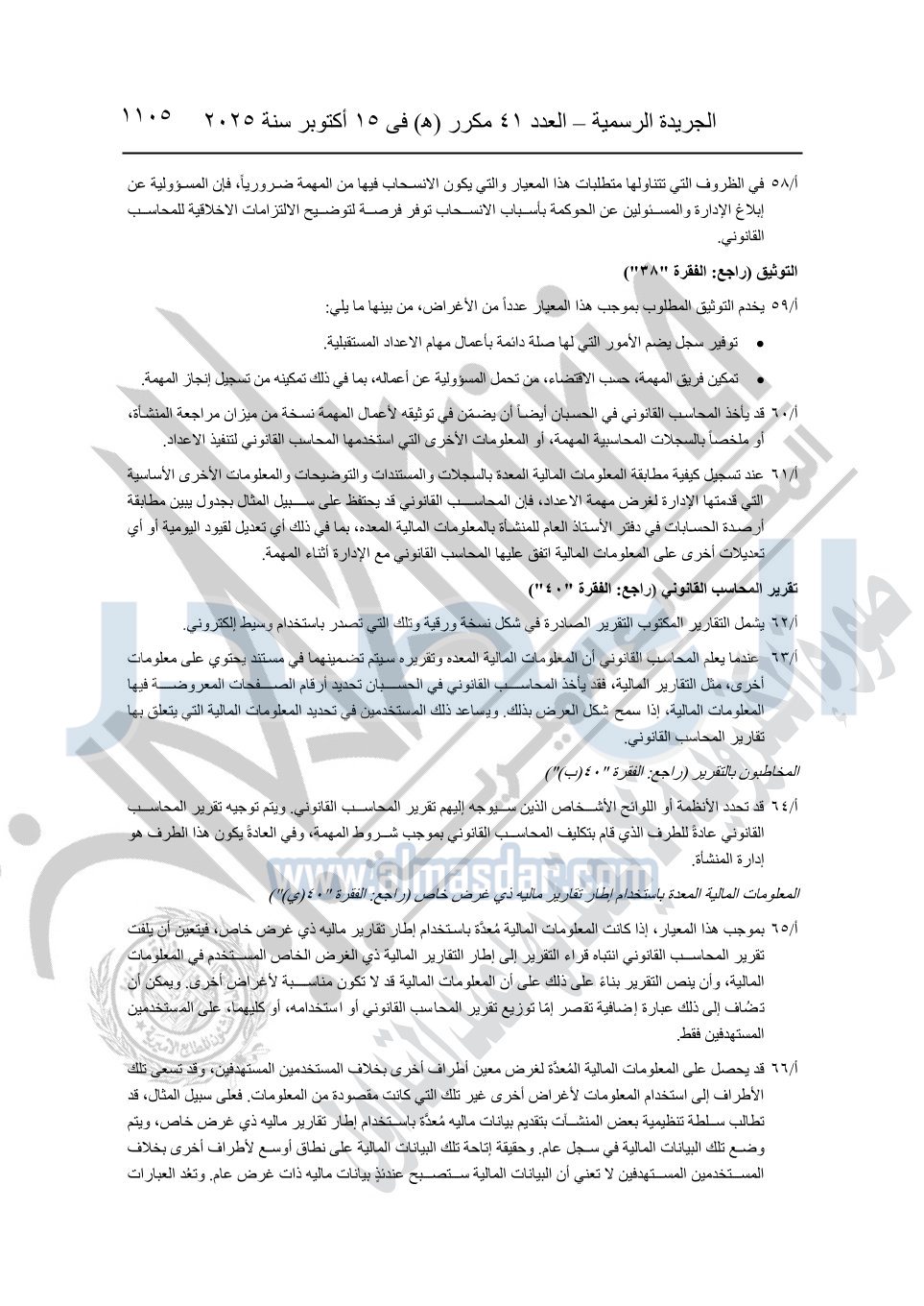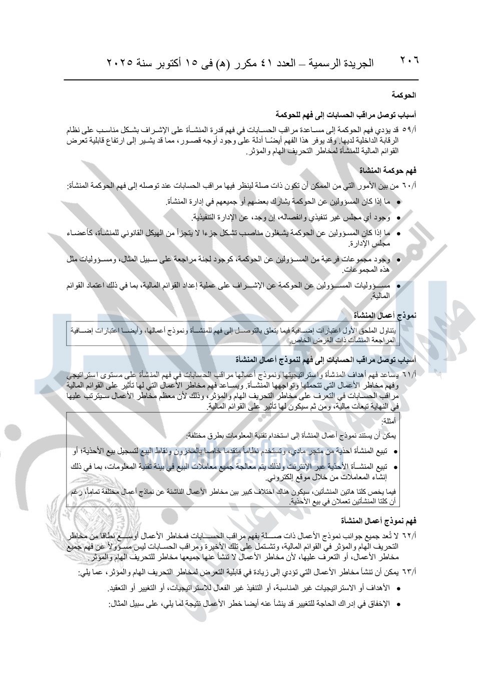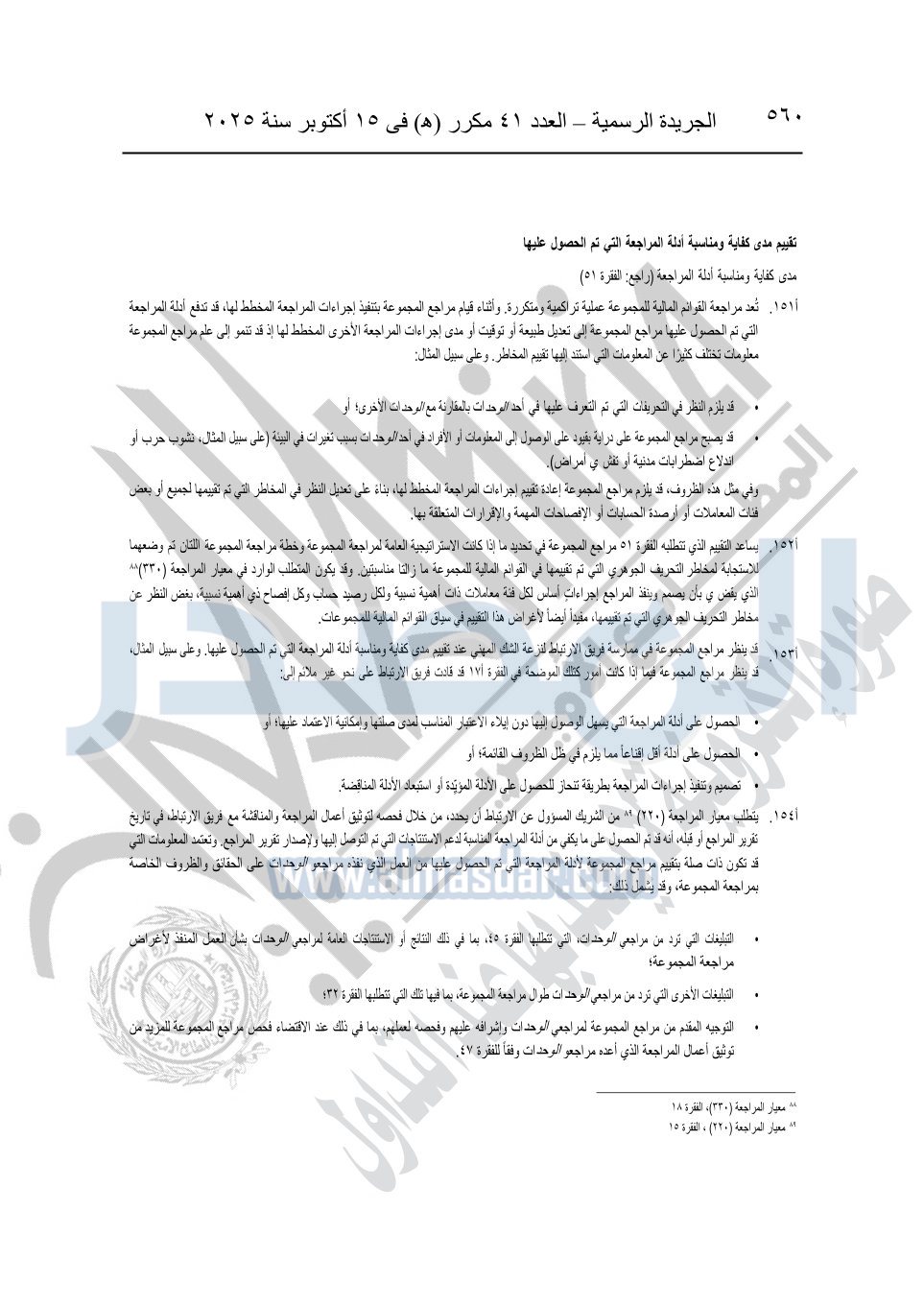 نشرت الجريدة الرسمية في العدد 41 مكرر "هـ" الصادر في 15 أكتوبر سنة 2025، قرار رئيس مجلس الوزراء رقم 3725 لسنة 2025، بشأن العمل بالمعايير المصرية للمراجعة والفحص المحدود ومهام التأكد الأخرى المرافقة لهذا القرار.