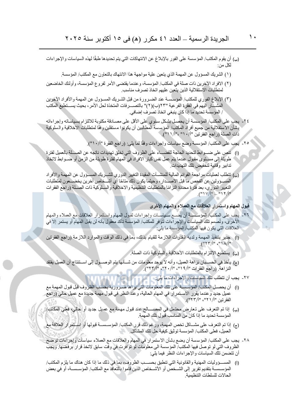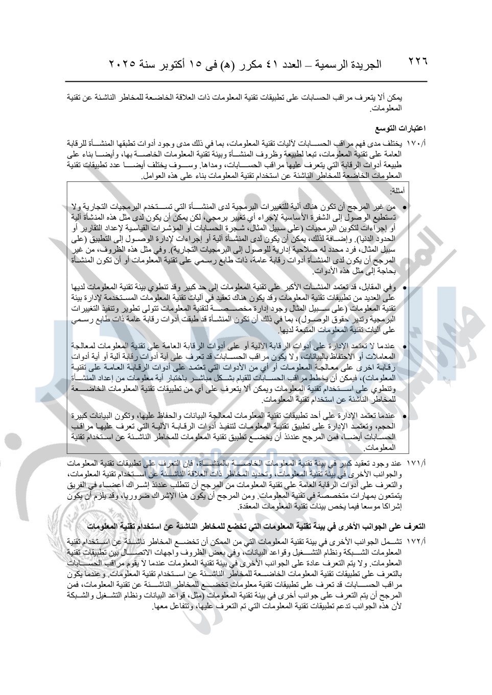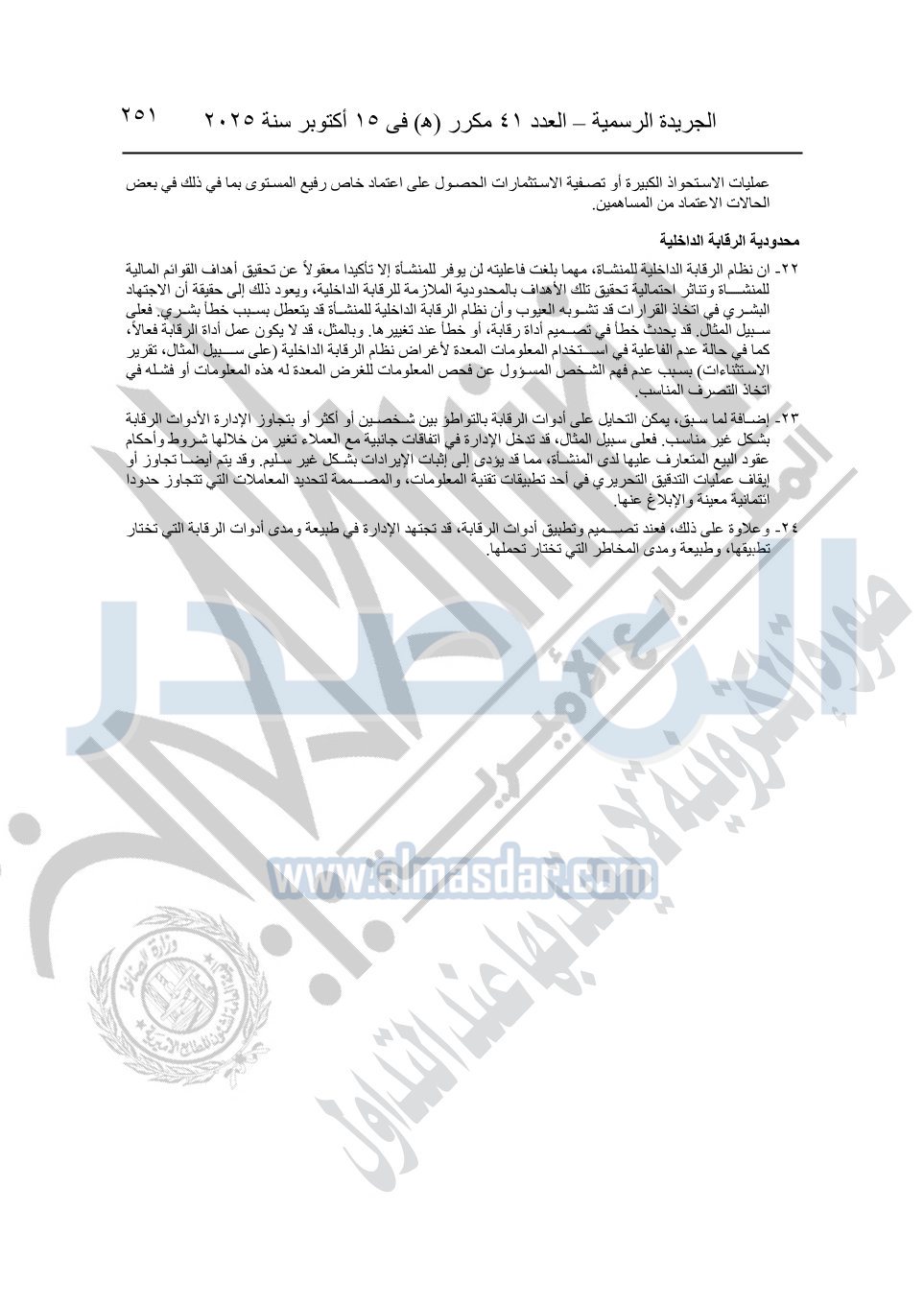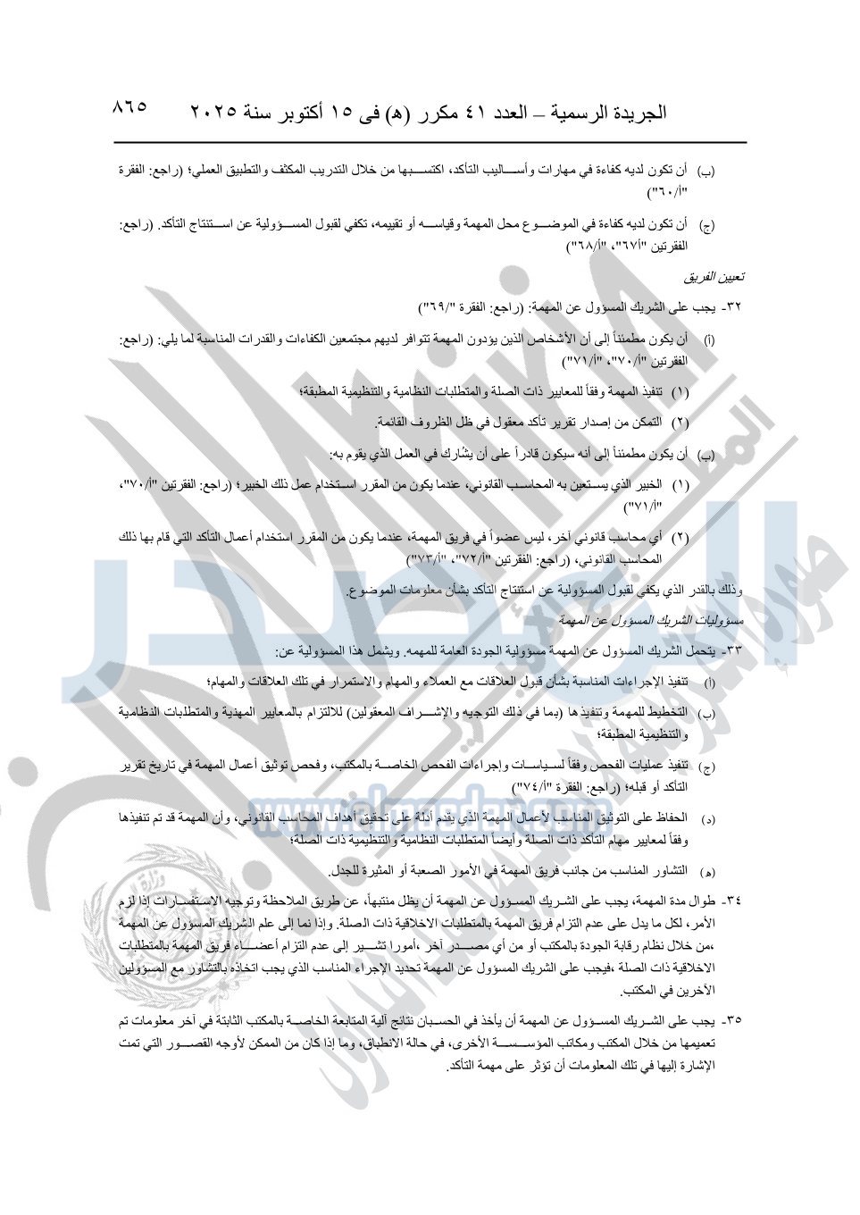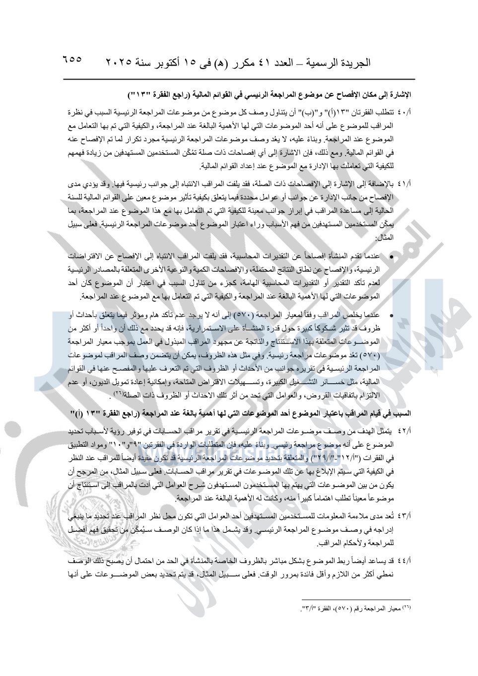 نشرت الجريدة الرسمية في العدد 41 مكرر "هـ" الصادر في 15 أكتوبر سنة 2025، قرار رئيس مجلس الوزراء رقم 3725 لسنة 2025، بشأن العمل بالمعايير المصرية للمراجعة والفحص المحدود ومهام التأكد الأخرى المرافقة لهذا القرار.