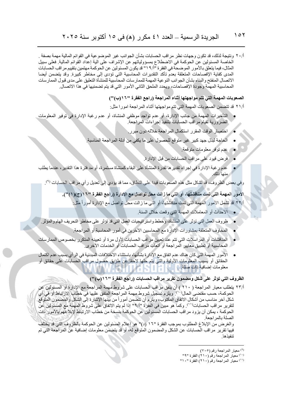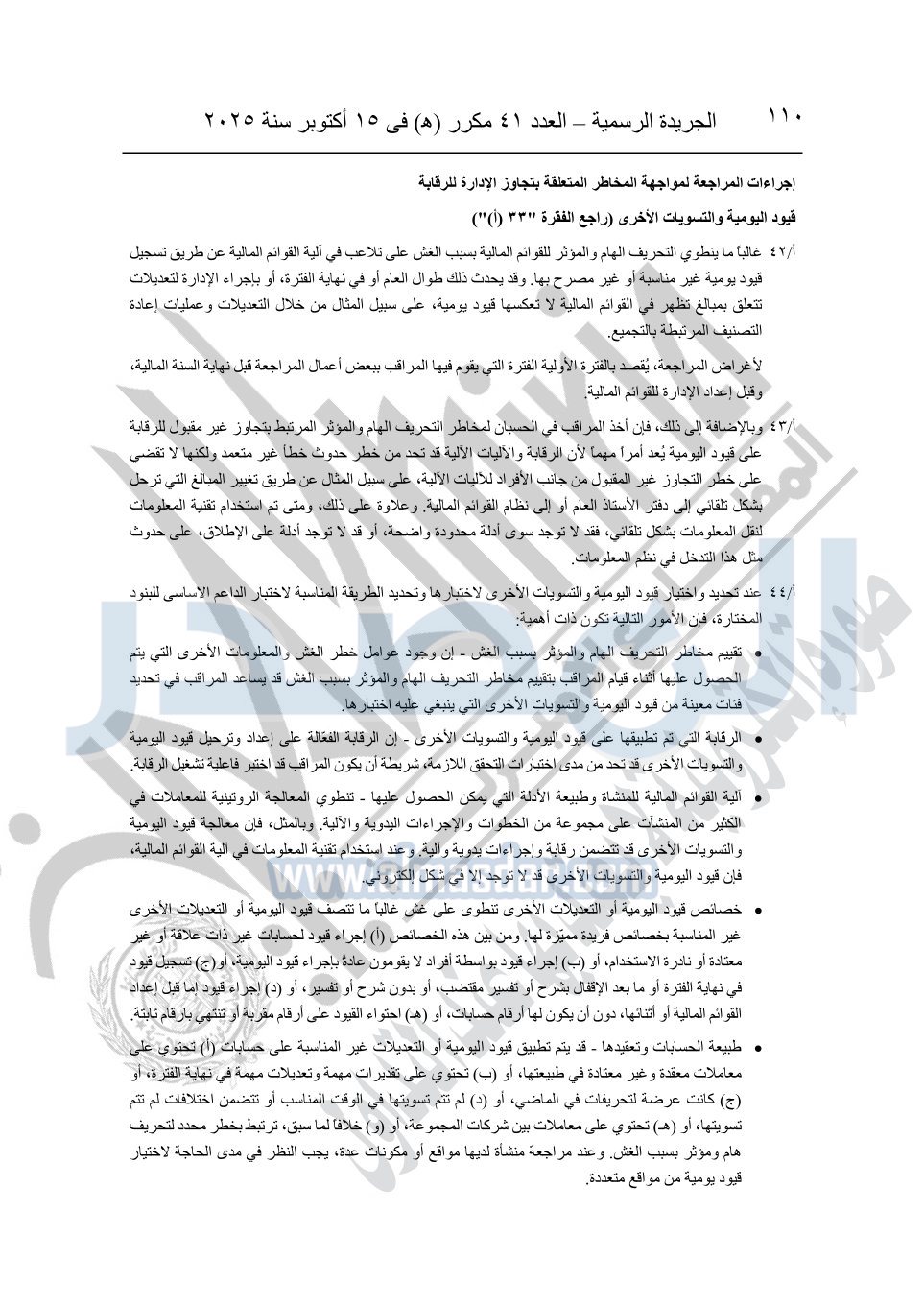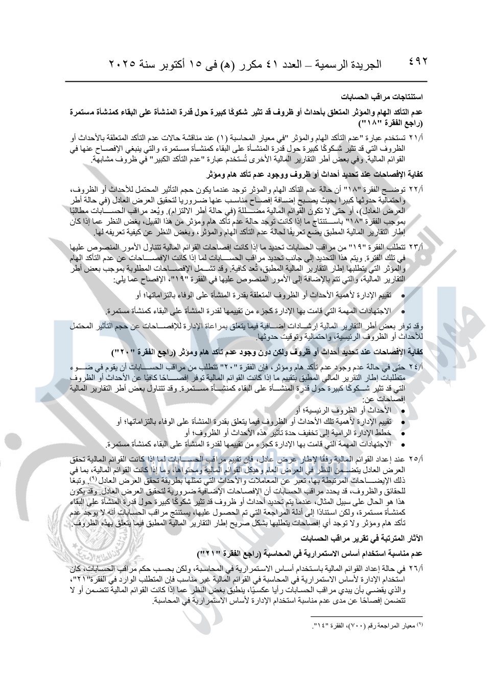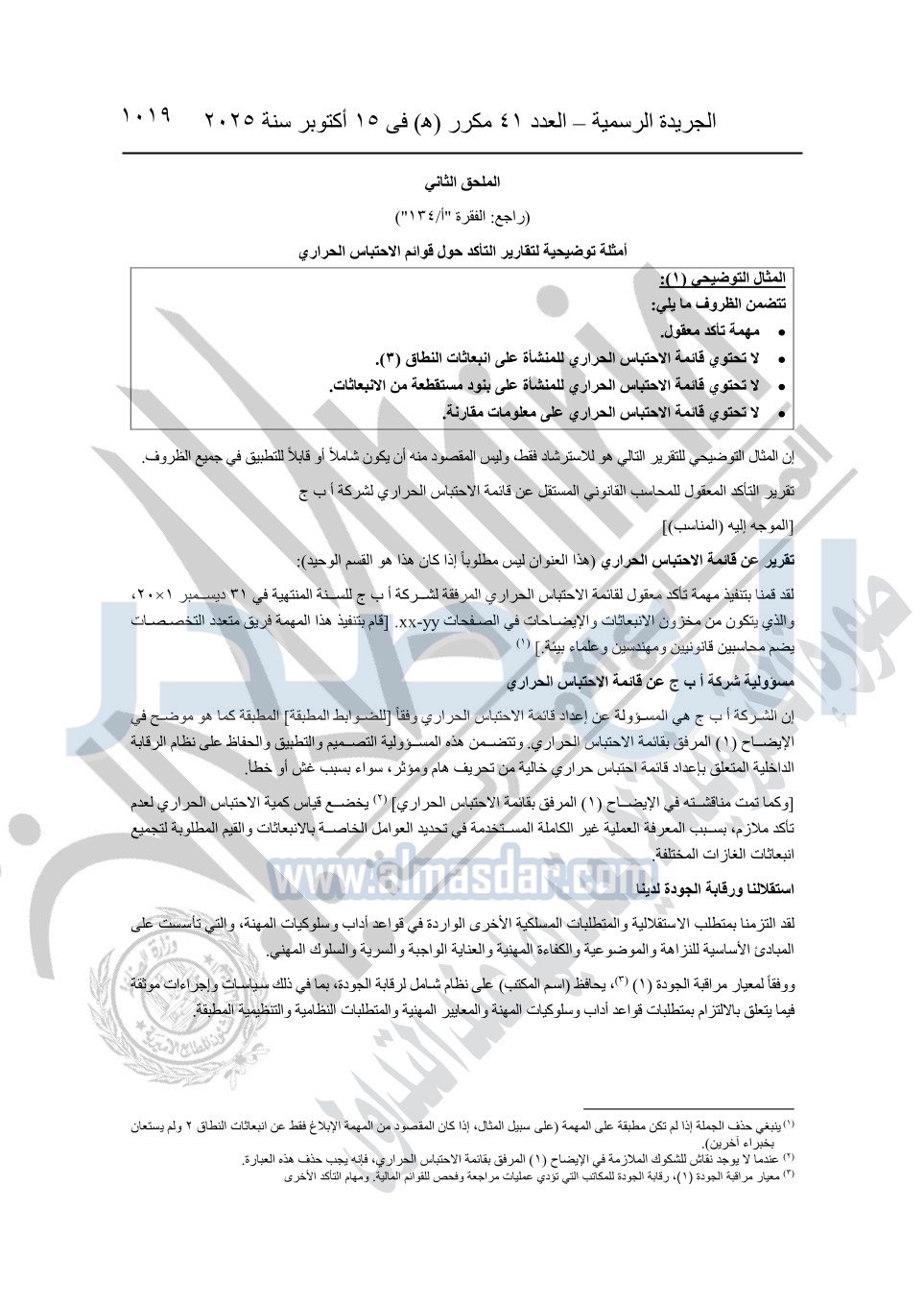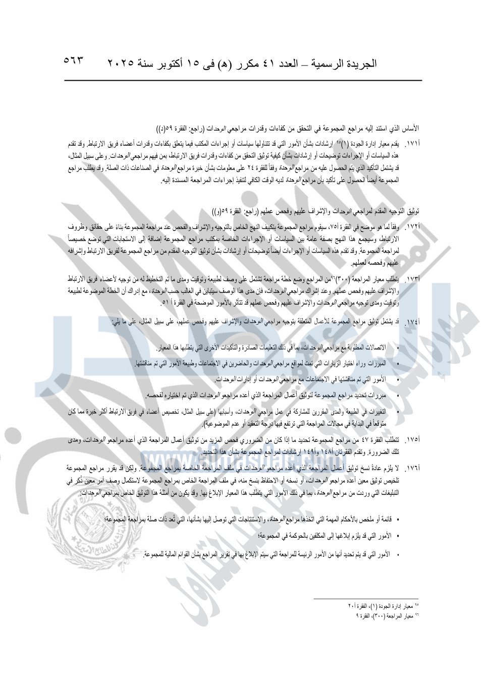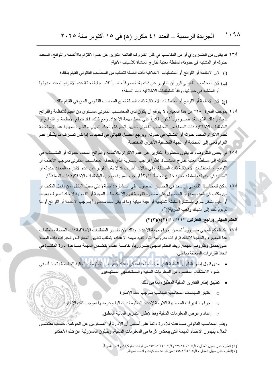 نشرت الجريدة الرسمية في العدد 41 مكرر "هـ" الصادر في 15 أكتوبر سنة 2025، قرار رئيس مجلس الوزراء رقم 3725 لسنة 2025، بشأن العمل بالمعايير المصرية للمراجعة والفحص المحدود ومهام التأكد الأخرى المرافقة لهذا القرار.
