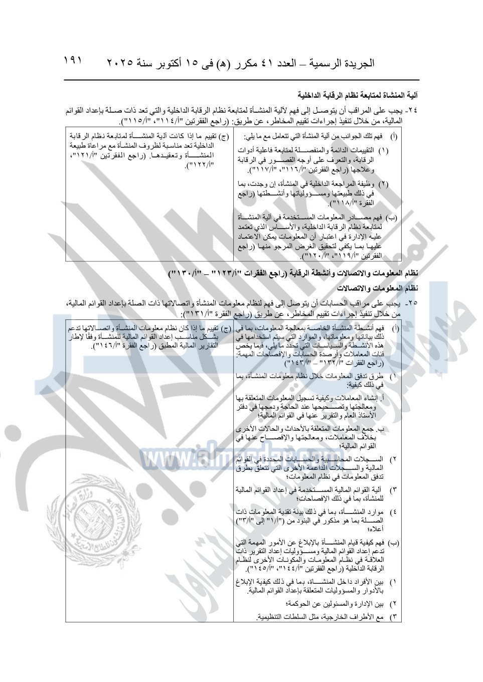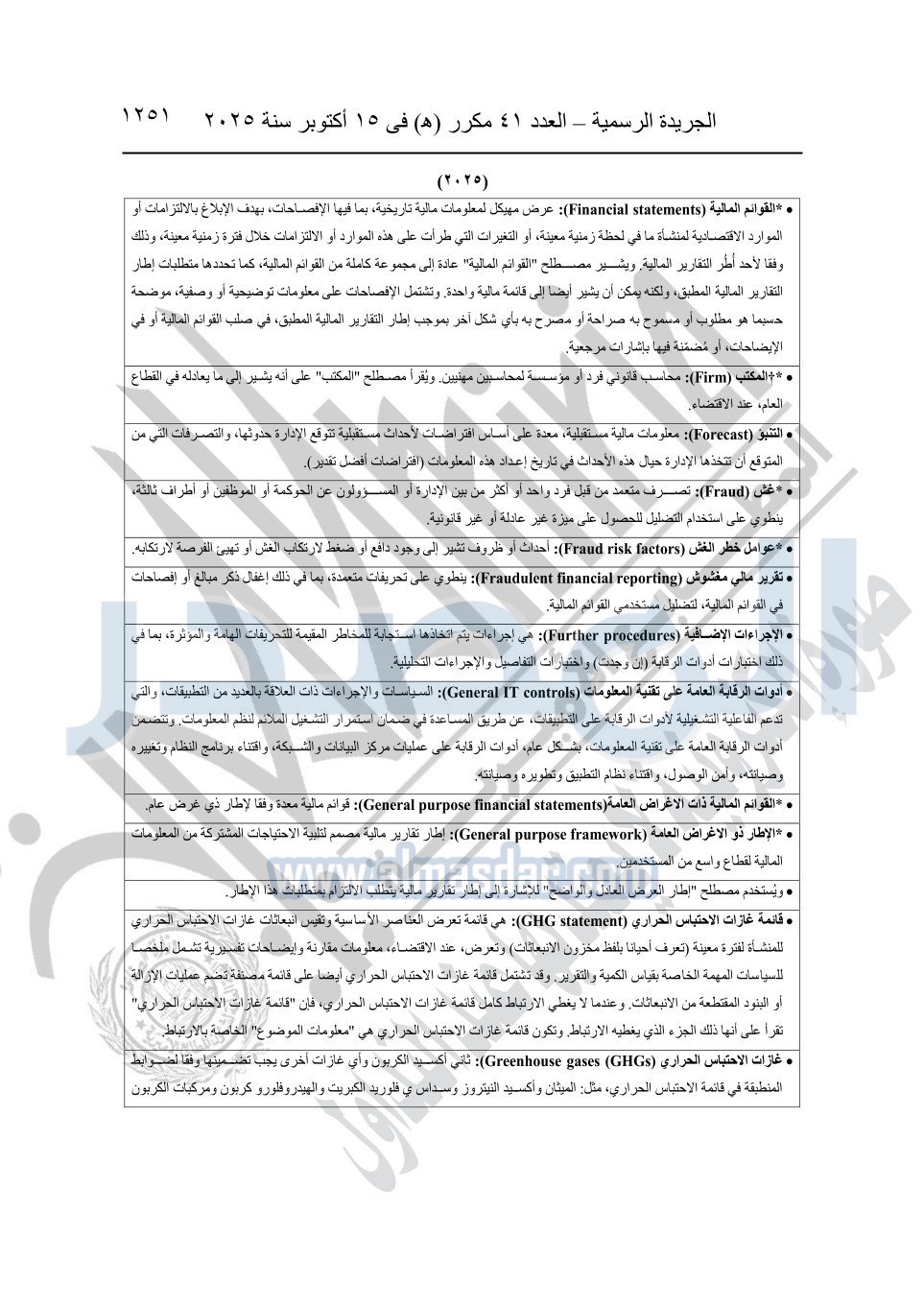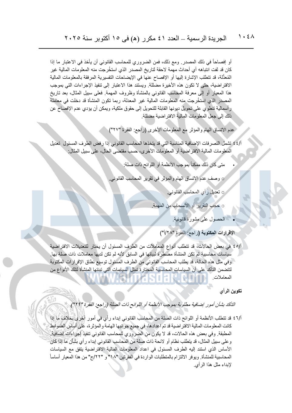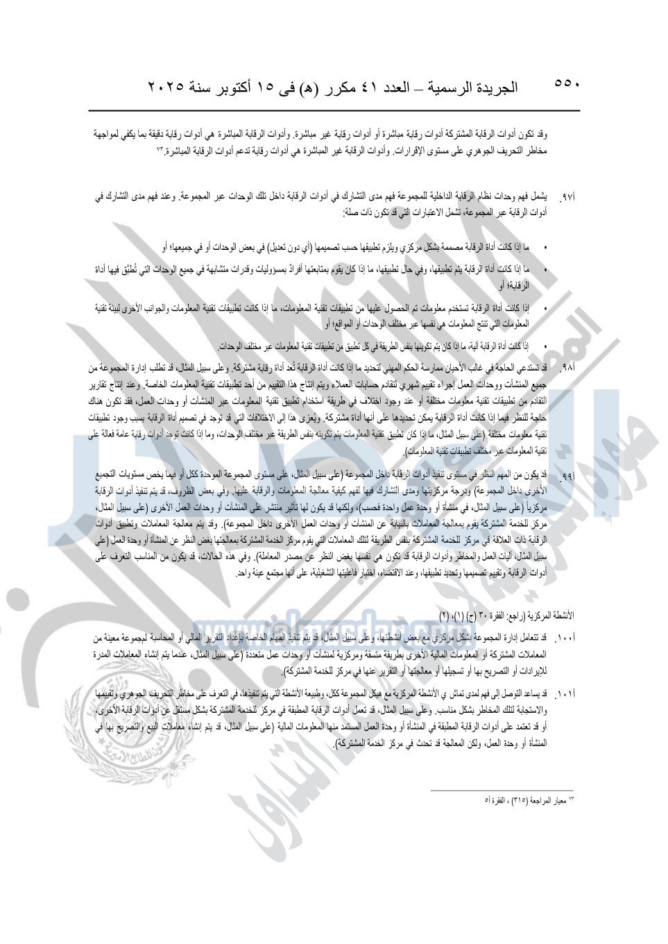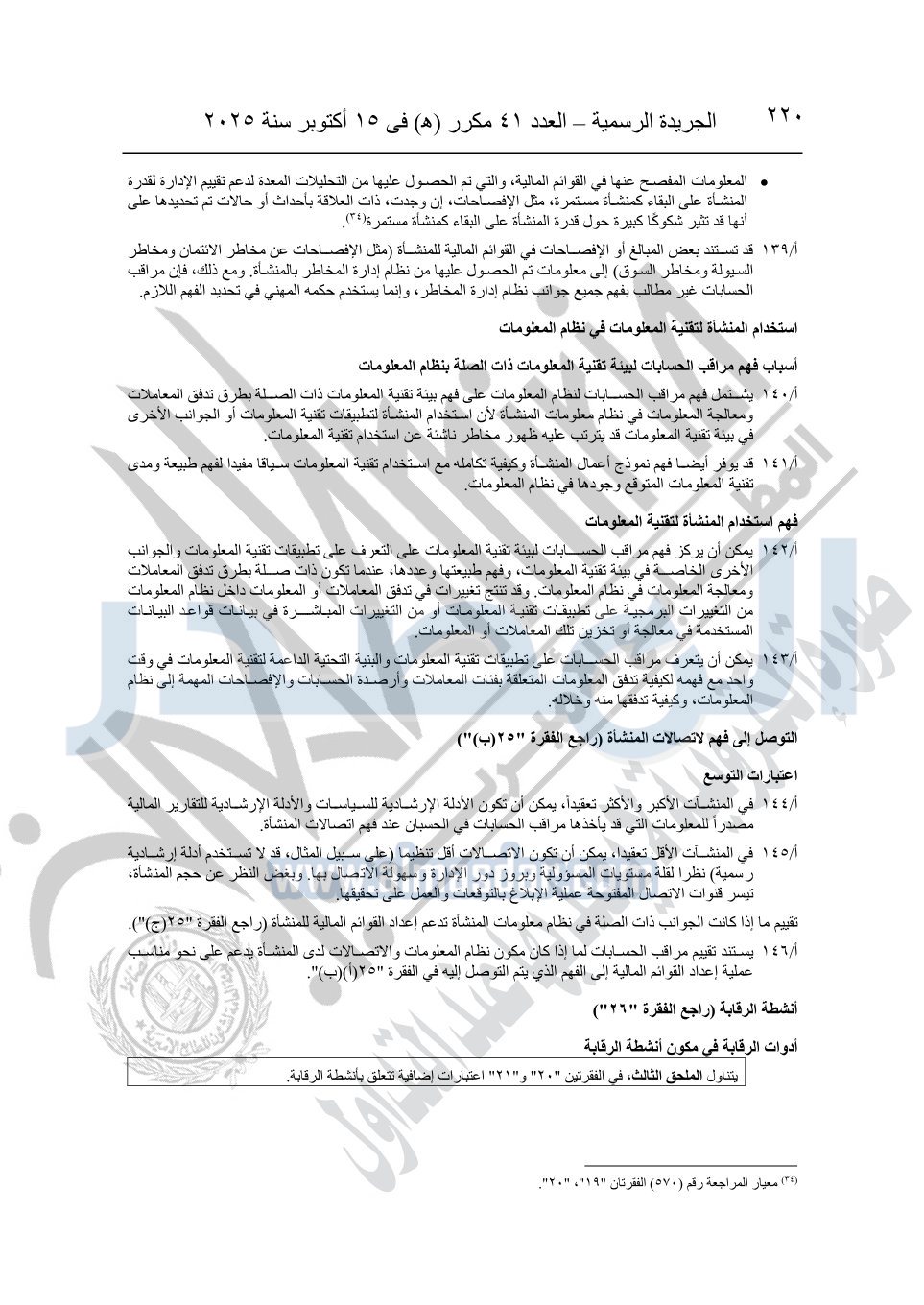 نشرت الجريدة الرسمية في العدد 41 مكرر "هـ" الصادر في 15 أكتوبر سنة 2025، قرار رئيس مجلس الوزراء رقم 3725 لسنة 2025، بشأن العمل بالمعايير المصرية للمراجعة والفحص المحدود ومهام التأكد الأخرى المرافقة لهذا القرار.