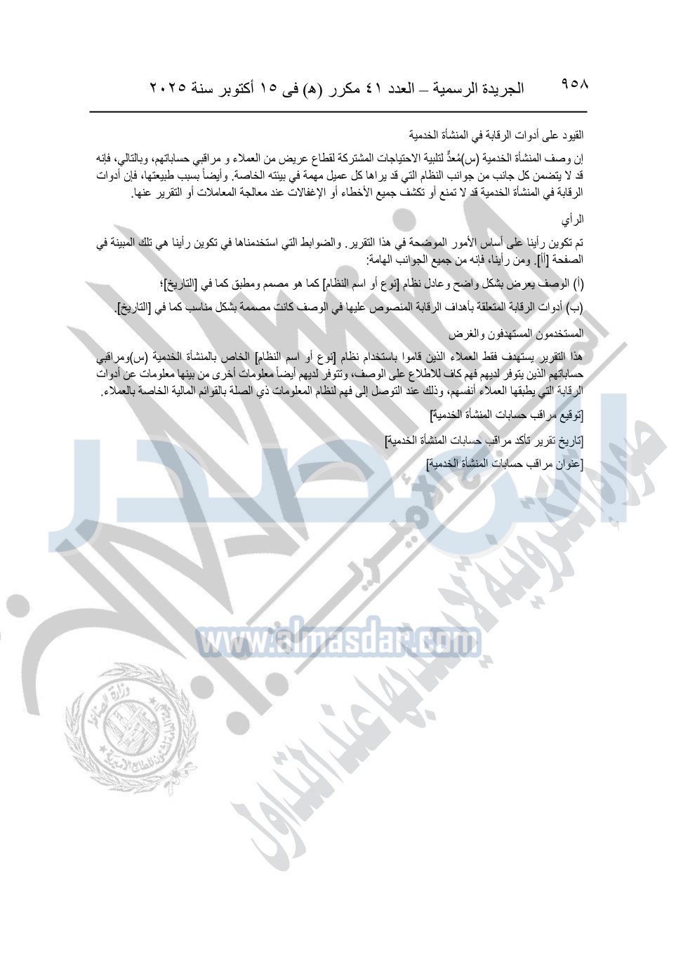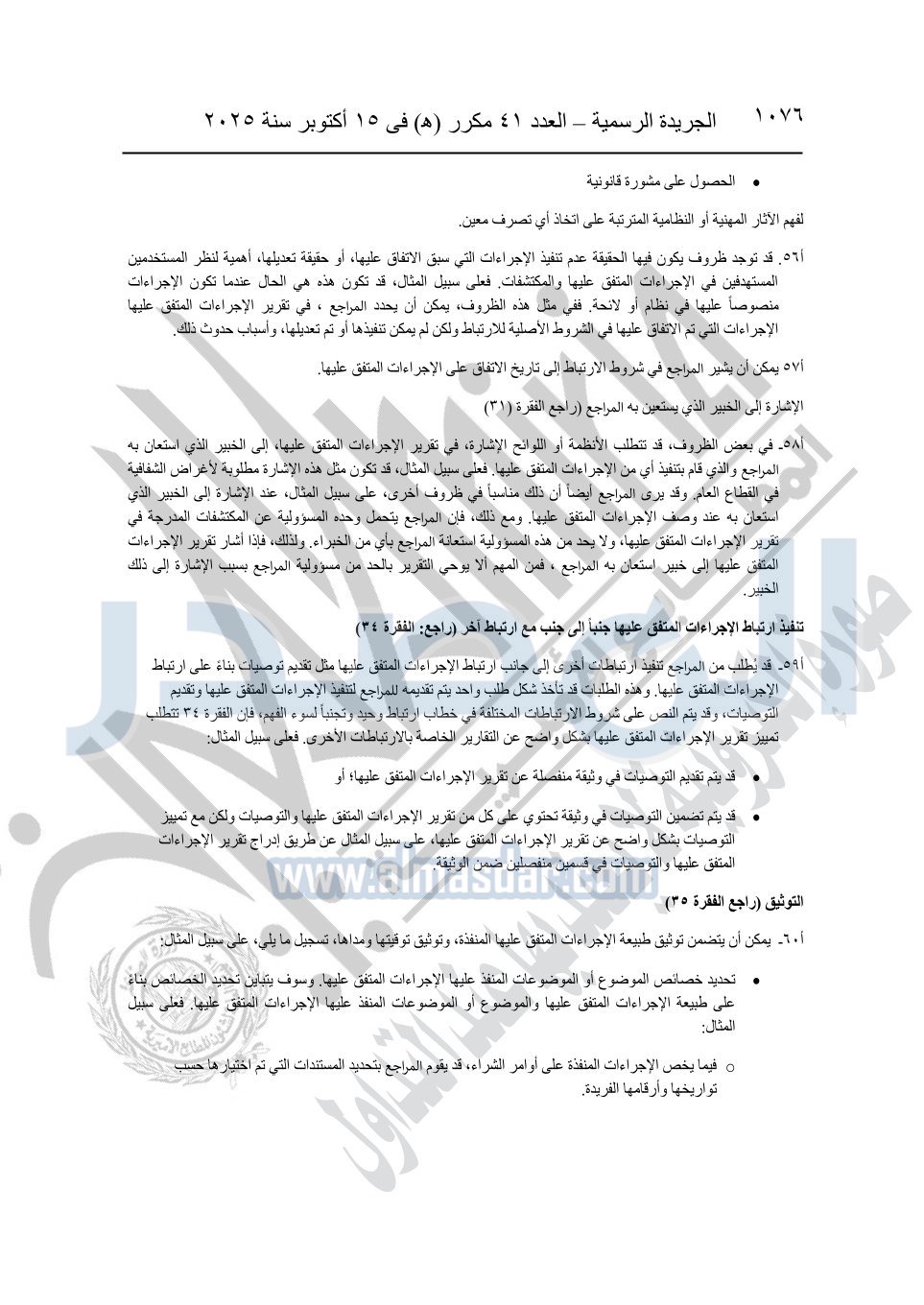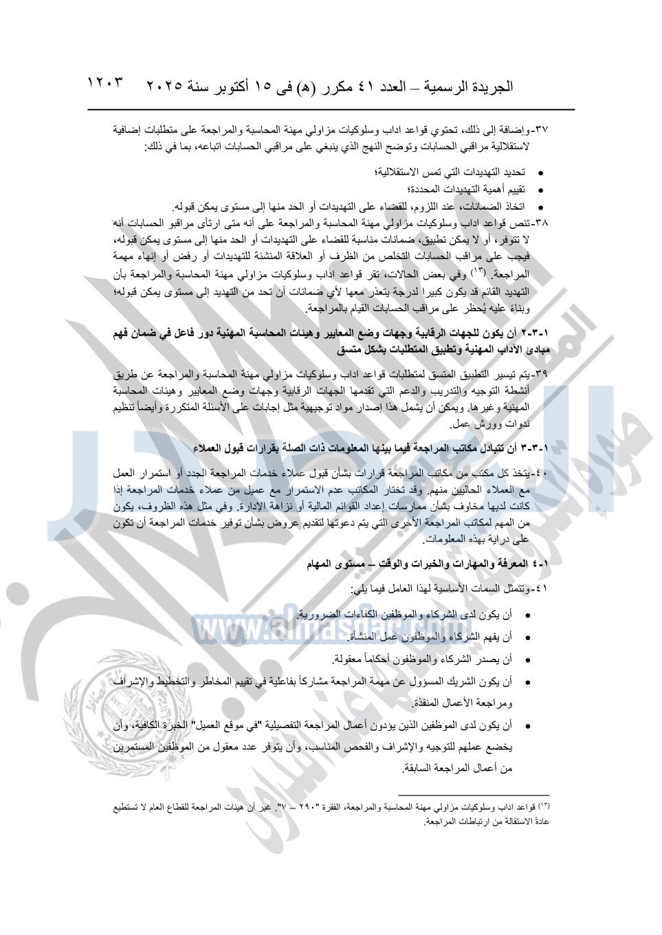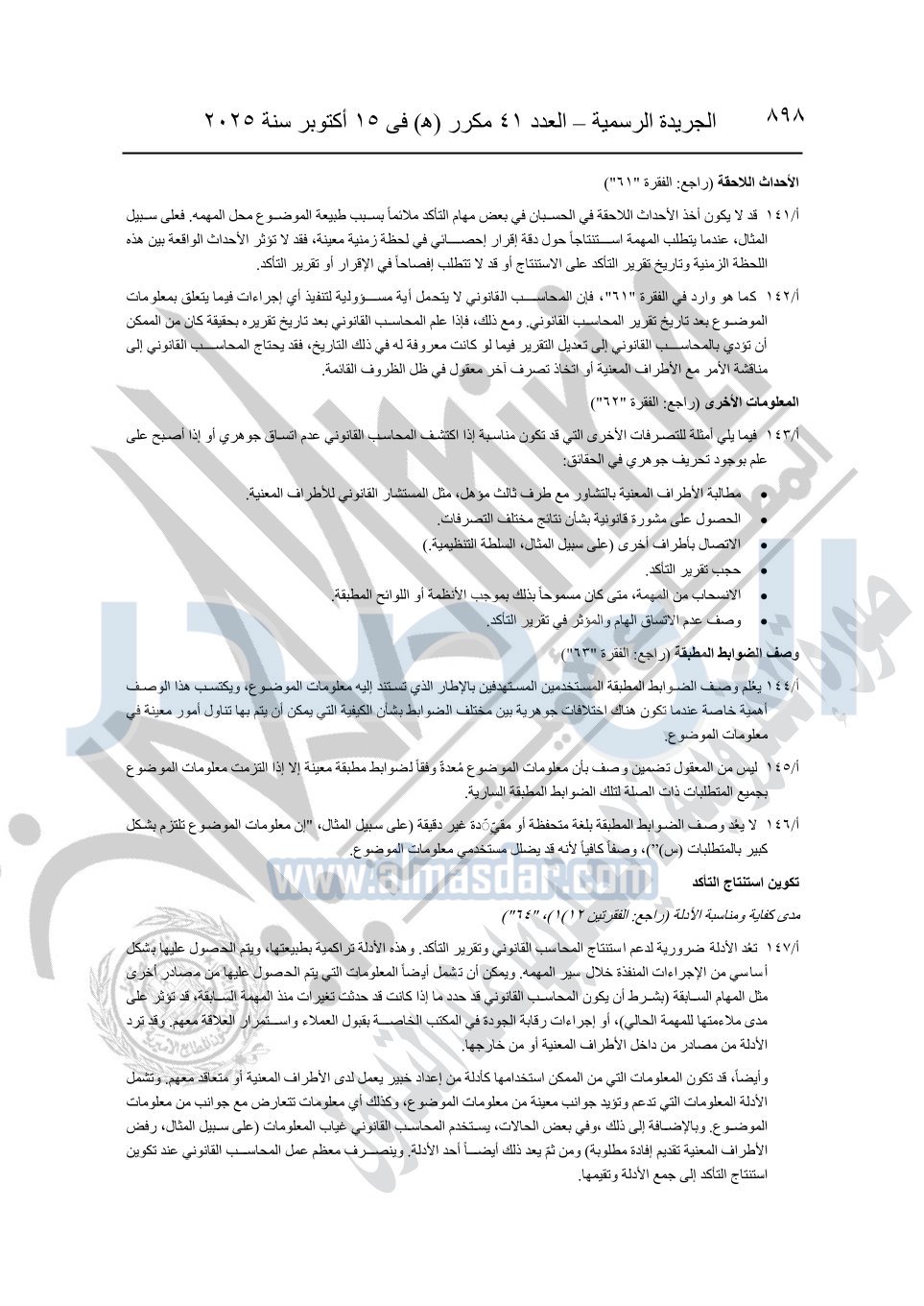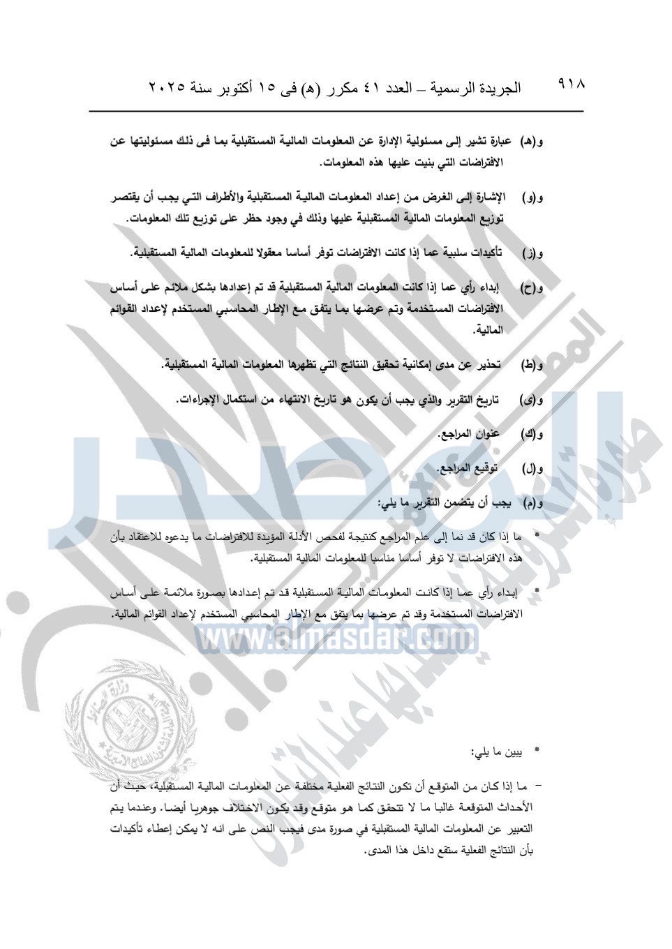 نشرت الجريدة الرسمية في العدد 41 مكرر "هـ" الصادر في 15 أكتوبر سنة 2025، قرار رئيس مجلس الوزراء رقم 3725 لسنة 2025، بشأن العمل بالمعايير المصرية للمراجعة والفحص المحدود ومهام التأكد الأخرى المرافقة لهذا القرار.