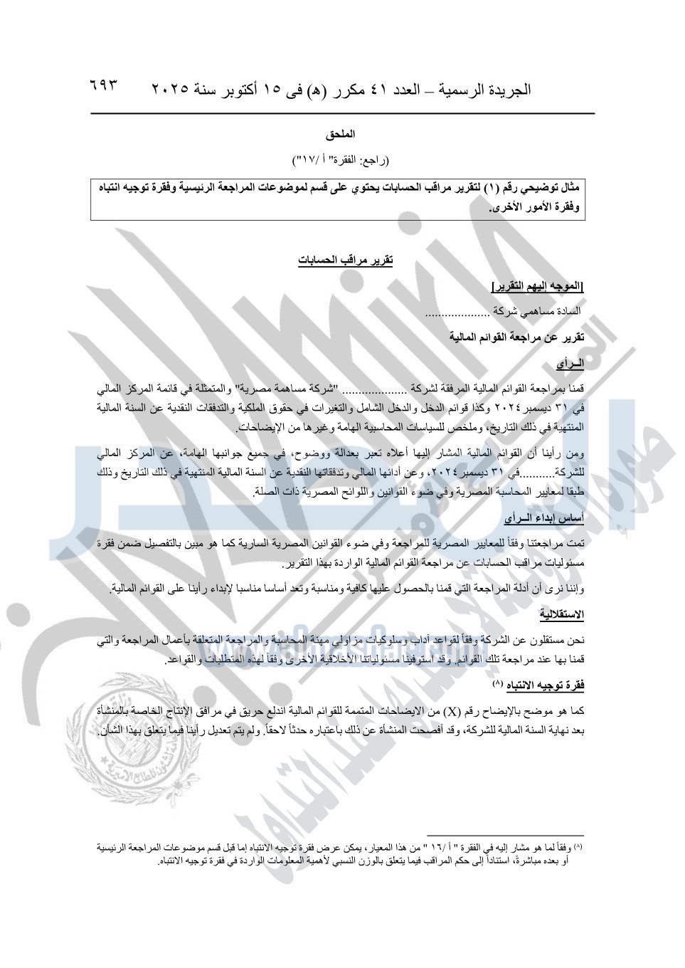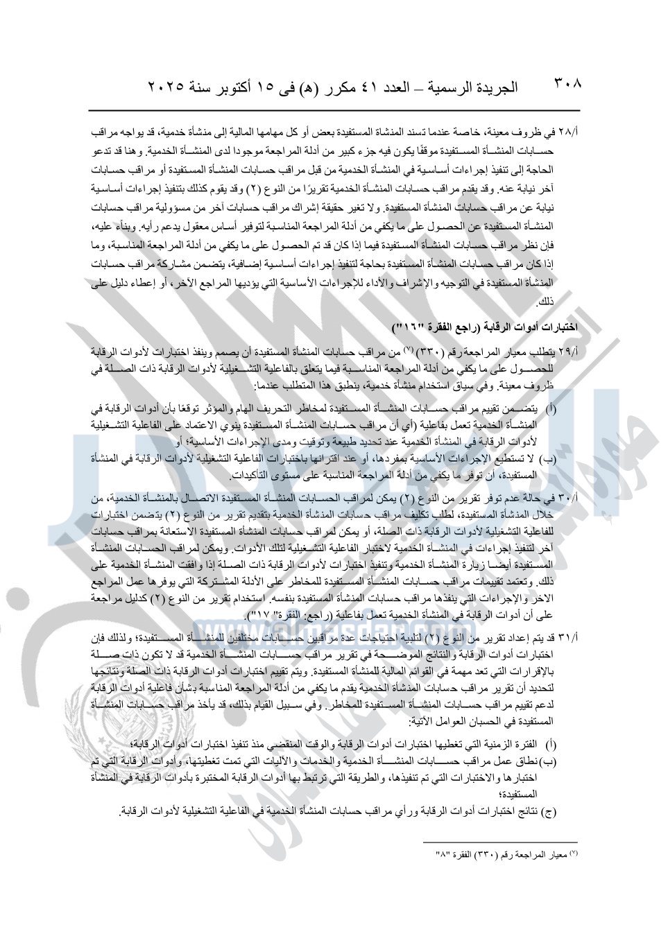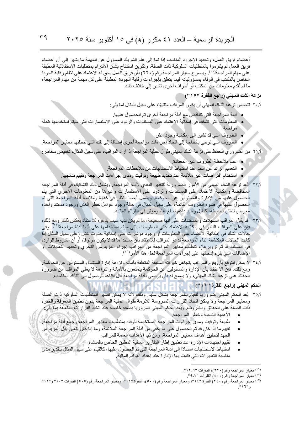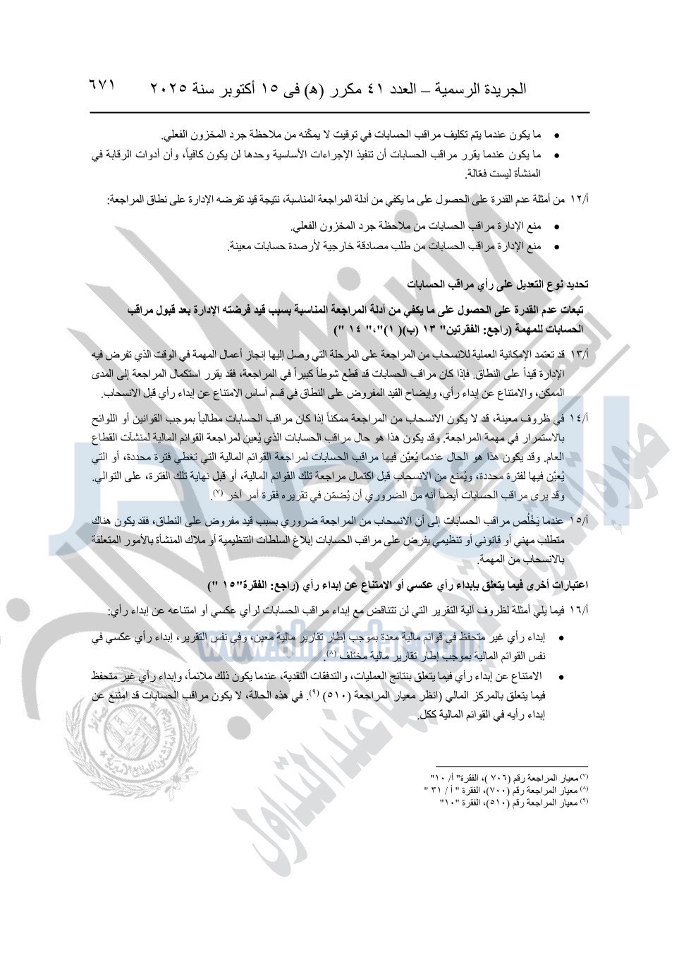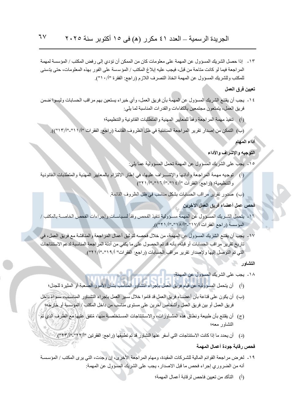 نشرت الجريدة الرسمية في العدد 41 مكرر "هـ" الصادر في 15 أكتوبر سنة 2025، قرار رئيس مجلس الوزراء رقم 3725 لسنة 2025، بشأن العمل بالمعايير المصرية للمراجعة والفحص المحدود ومهام التأكد الأخرى المرافقة لهذا القرار.