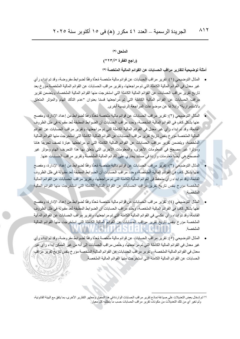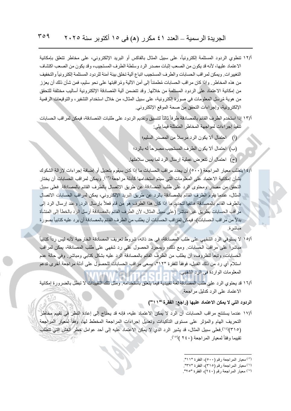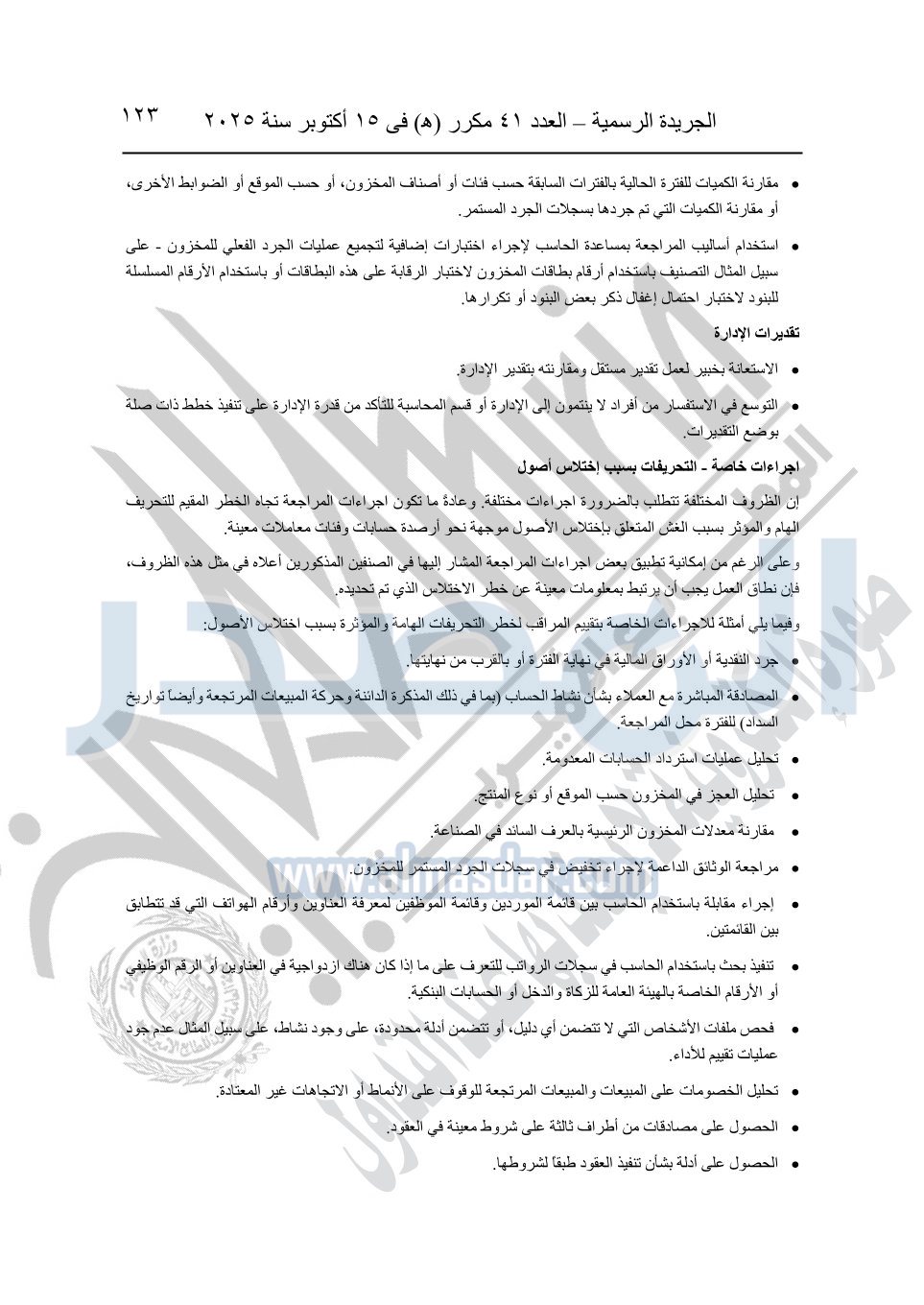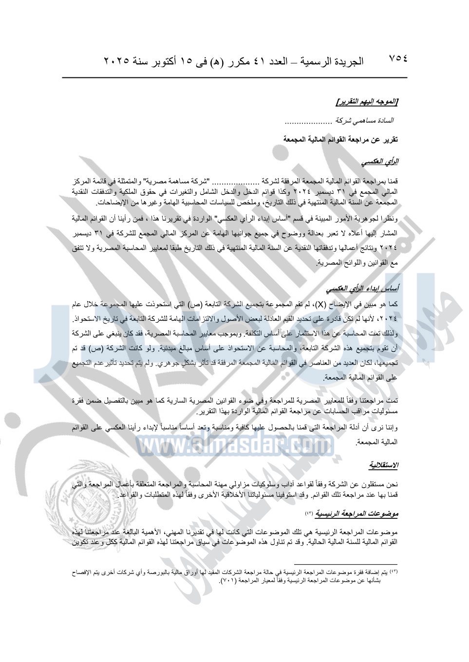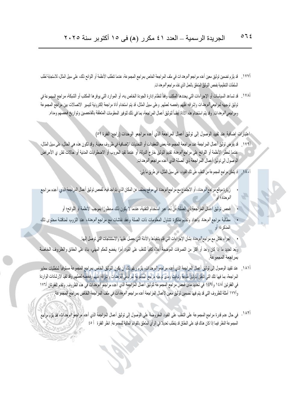 نشرت الجريدة الرسمية في العدد 41 مكرر "هـ" الصادر في 15 أكتوبر سنة 2025، قرار رئيس مجلس الوزراء رقم 3725 لسنة 2025، بشأن العمل بالمعايير المصرية للمراجعة والفحص المحدود ومهام التأكد الأخرى المرافقة لهذا القرار.