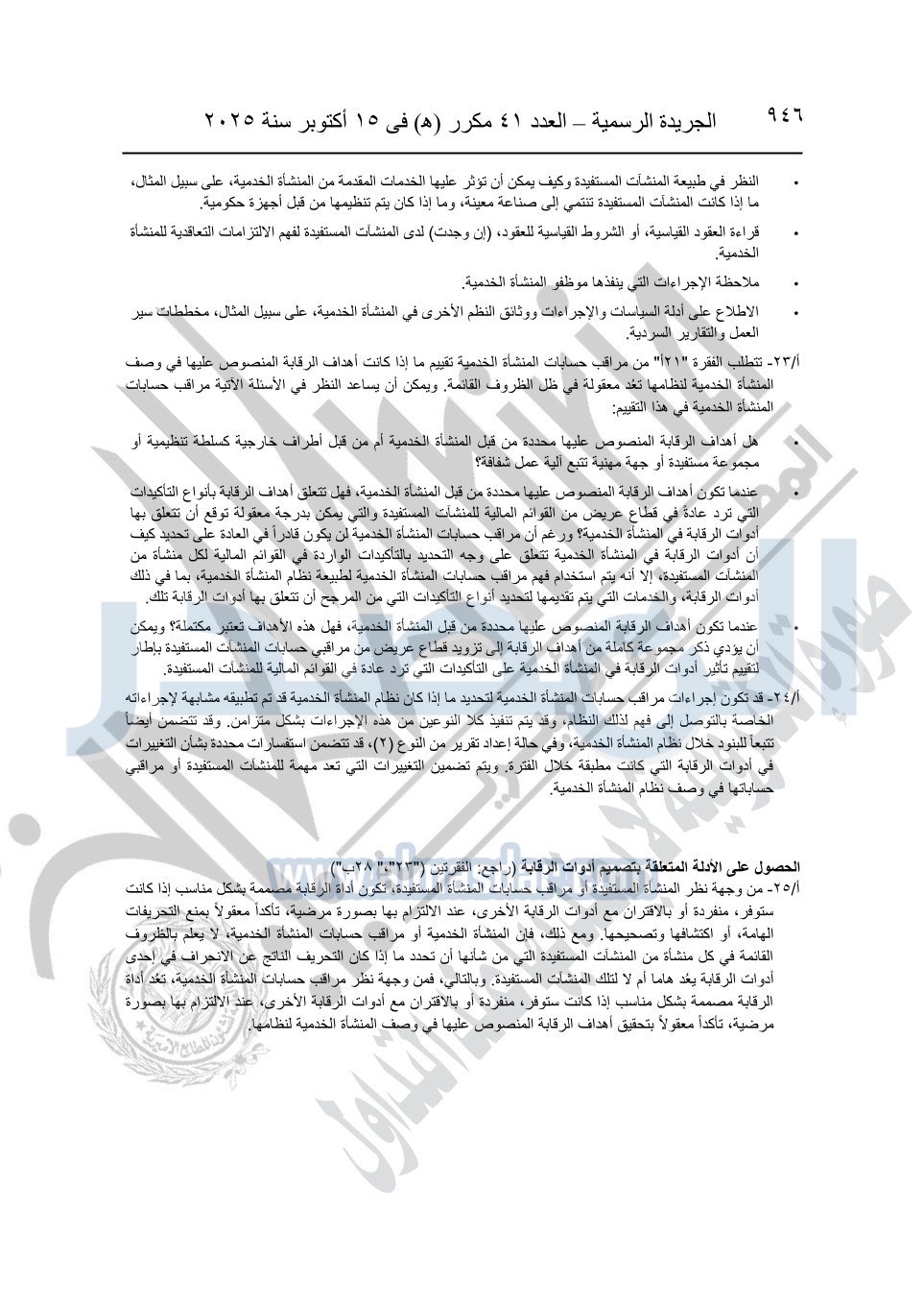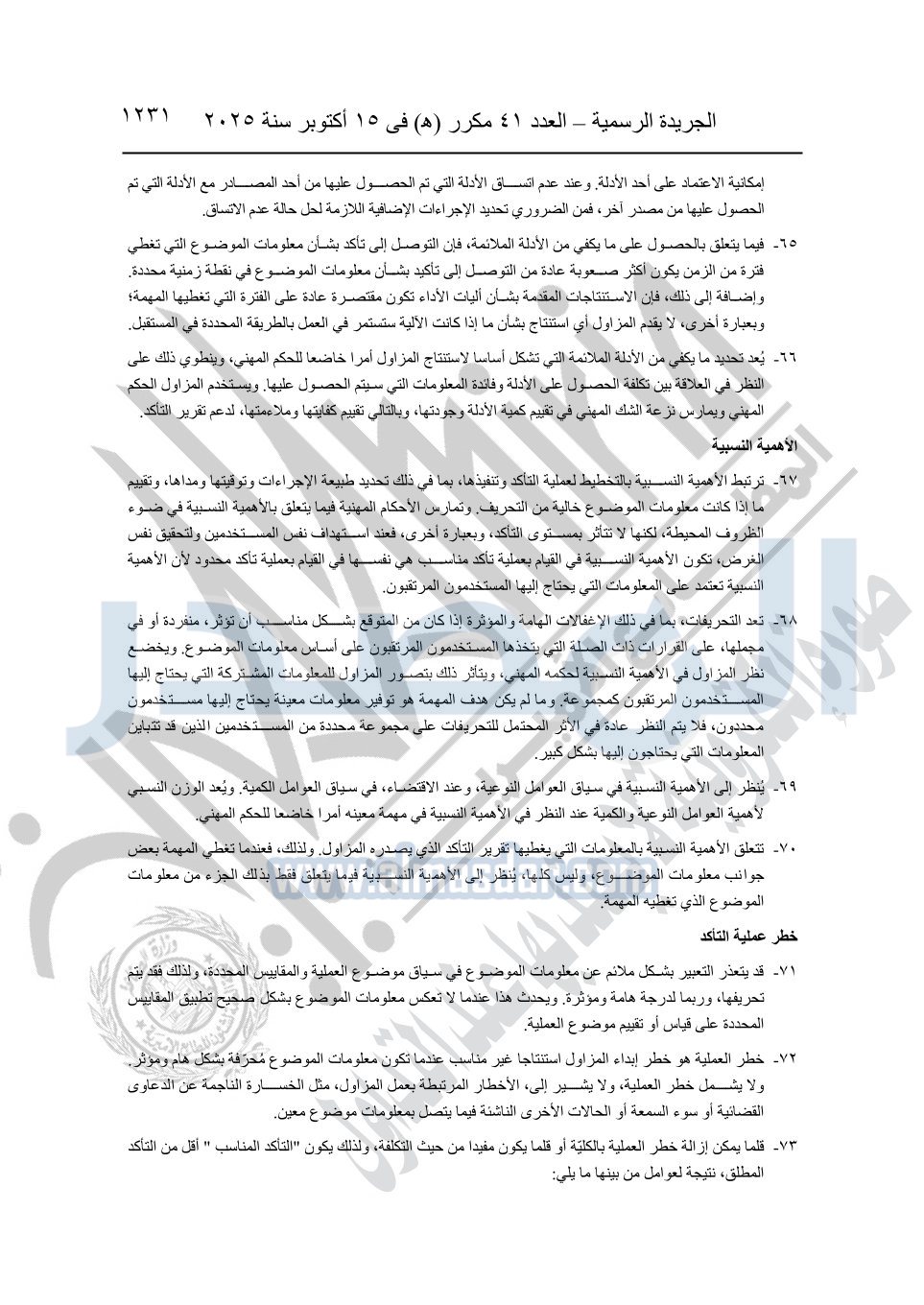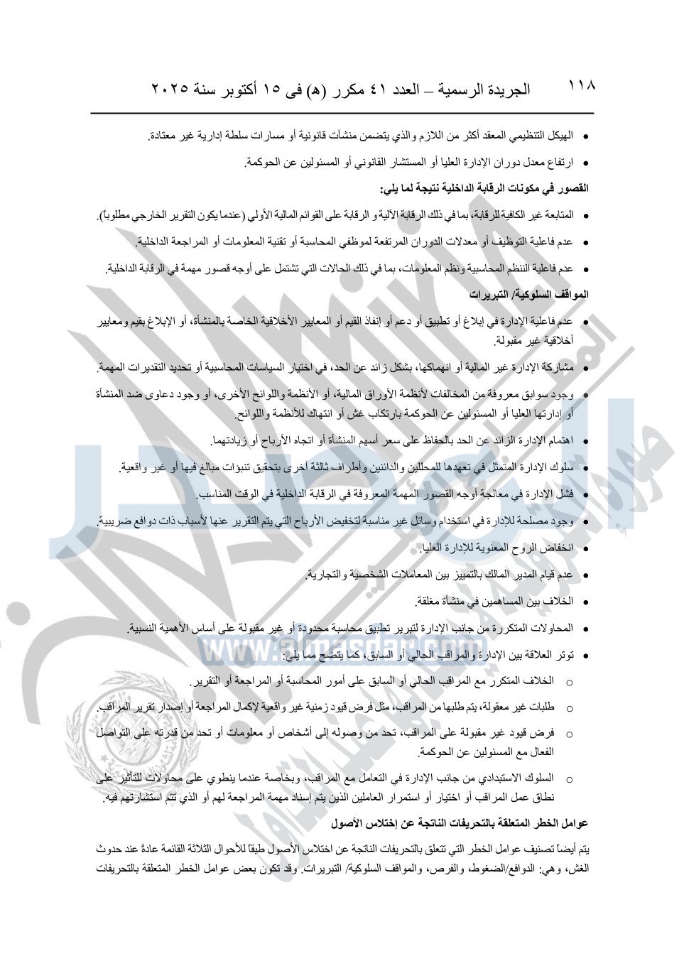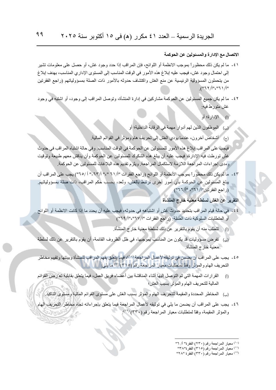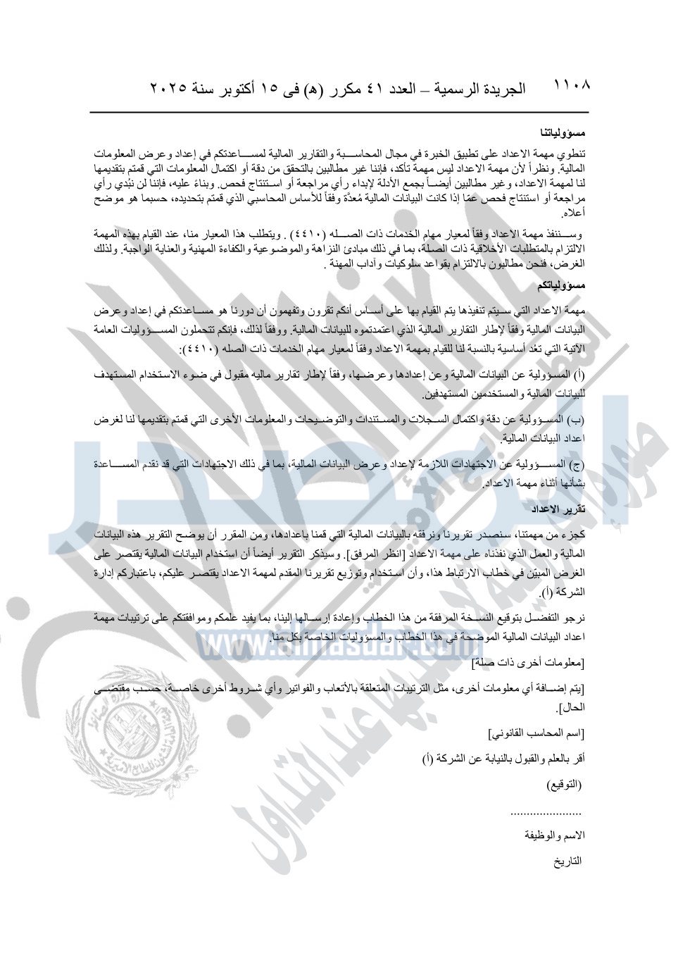 نشرت الجريدة الرسمية في العدد 41 مكرر "هـ" الصادر في 15 أكتوبر سنة 2025، قرار رئيس مجلس الوزراء رقم 3725 لسنة 2025، بشأن العمل بالمعايير المصرية للمراجعة والفحص المحدود ومهام التأكد الأخرى المرافقة لهذا القرار.
