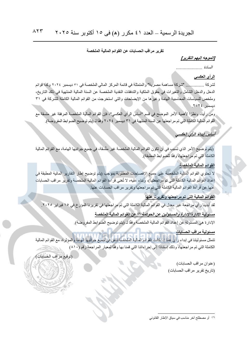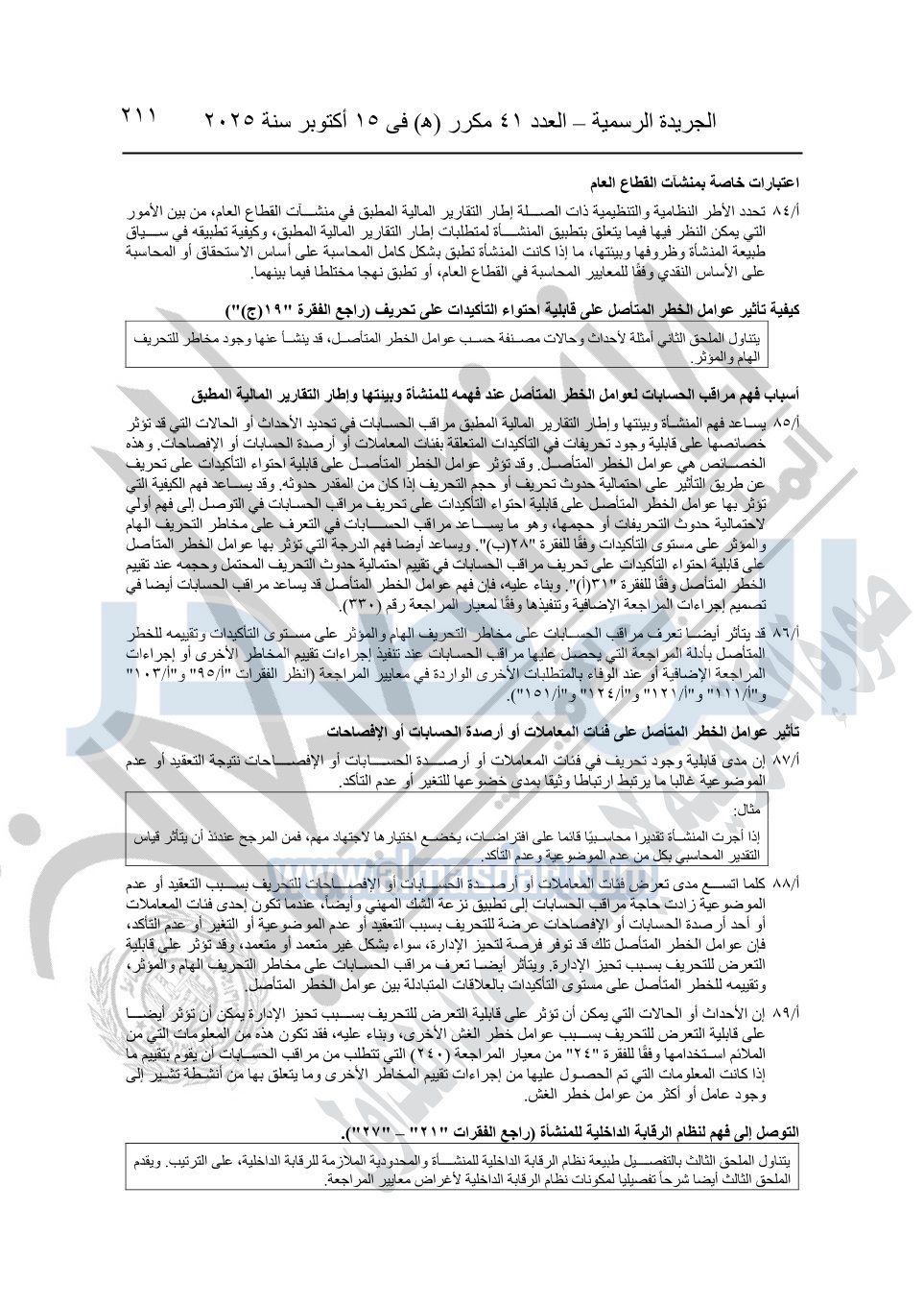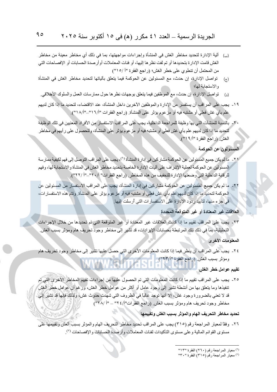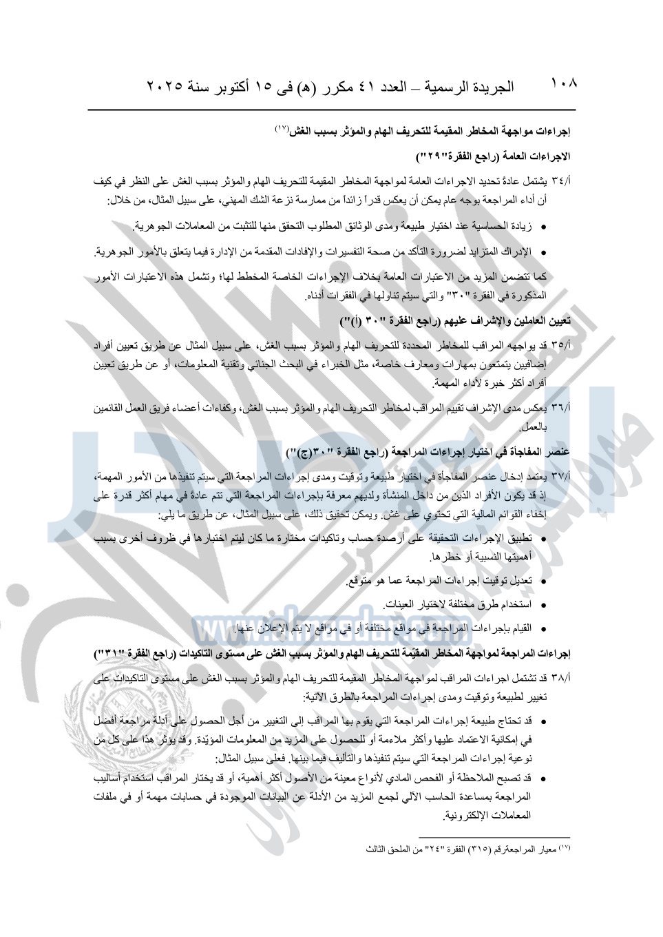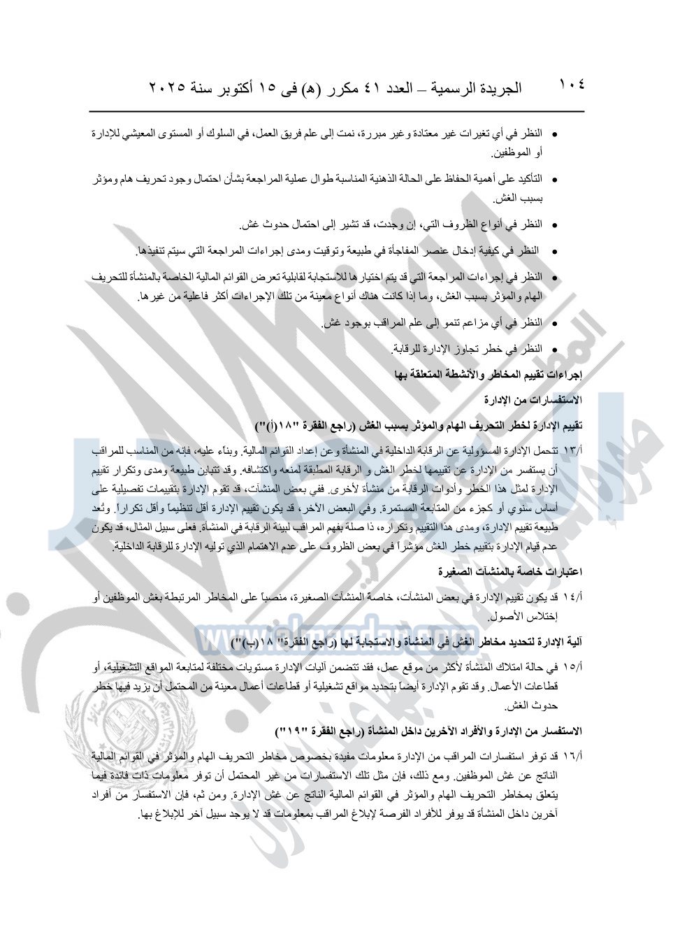 نشرت الجريدة الرسمية في العدد 41 مكرر "هـ" الصادر في 15 أكتوبر سنة 2025، قرار رئيس مجلس الوزراء رقم 3725 لسنة 2025، بشأن العمل بالمعايير المصرية للمراجعة والفحص المحدود ومهام التأكد الأخرى المرافقة لهذا القرار.