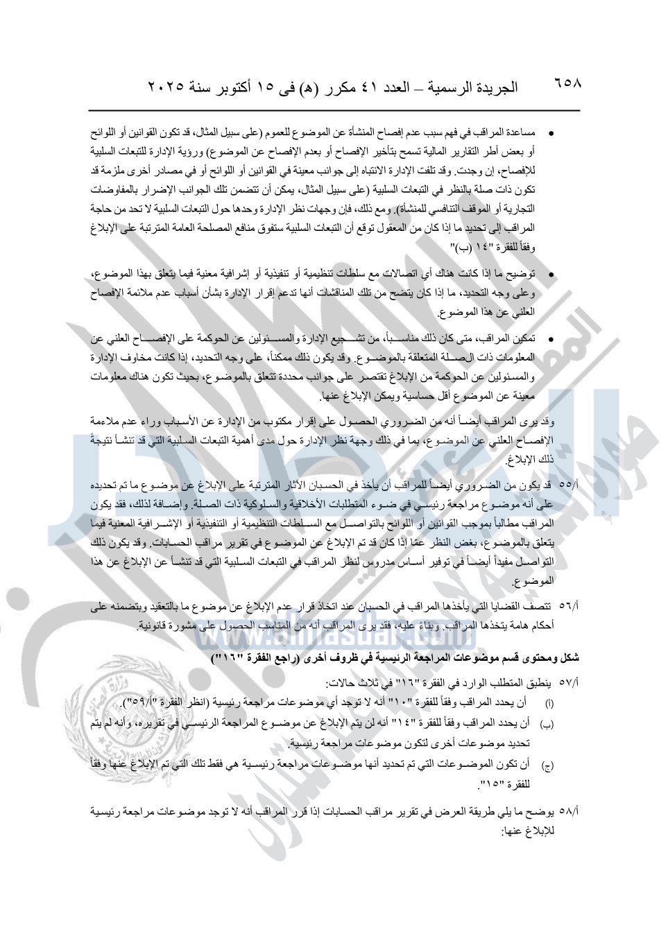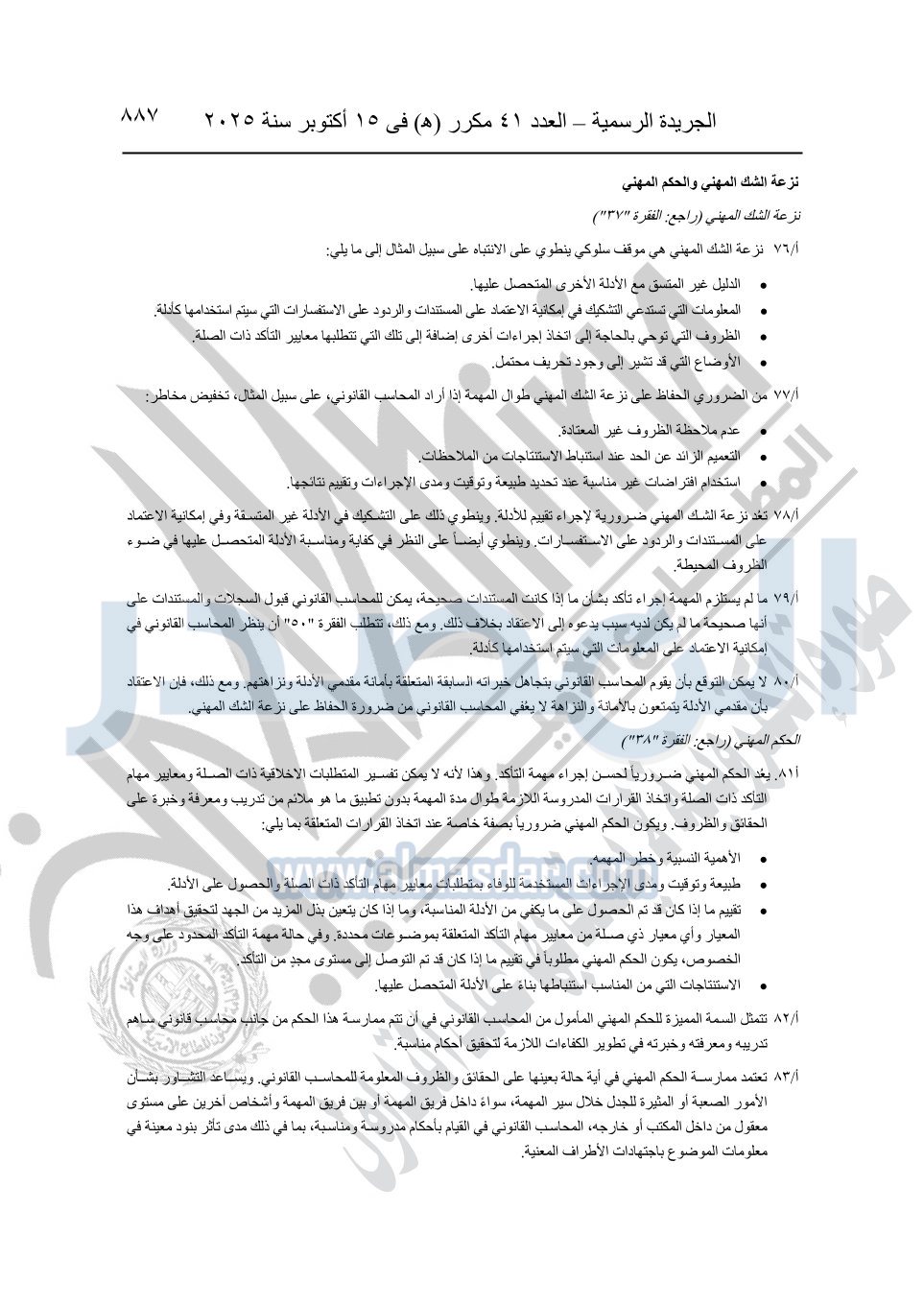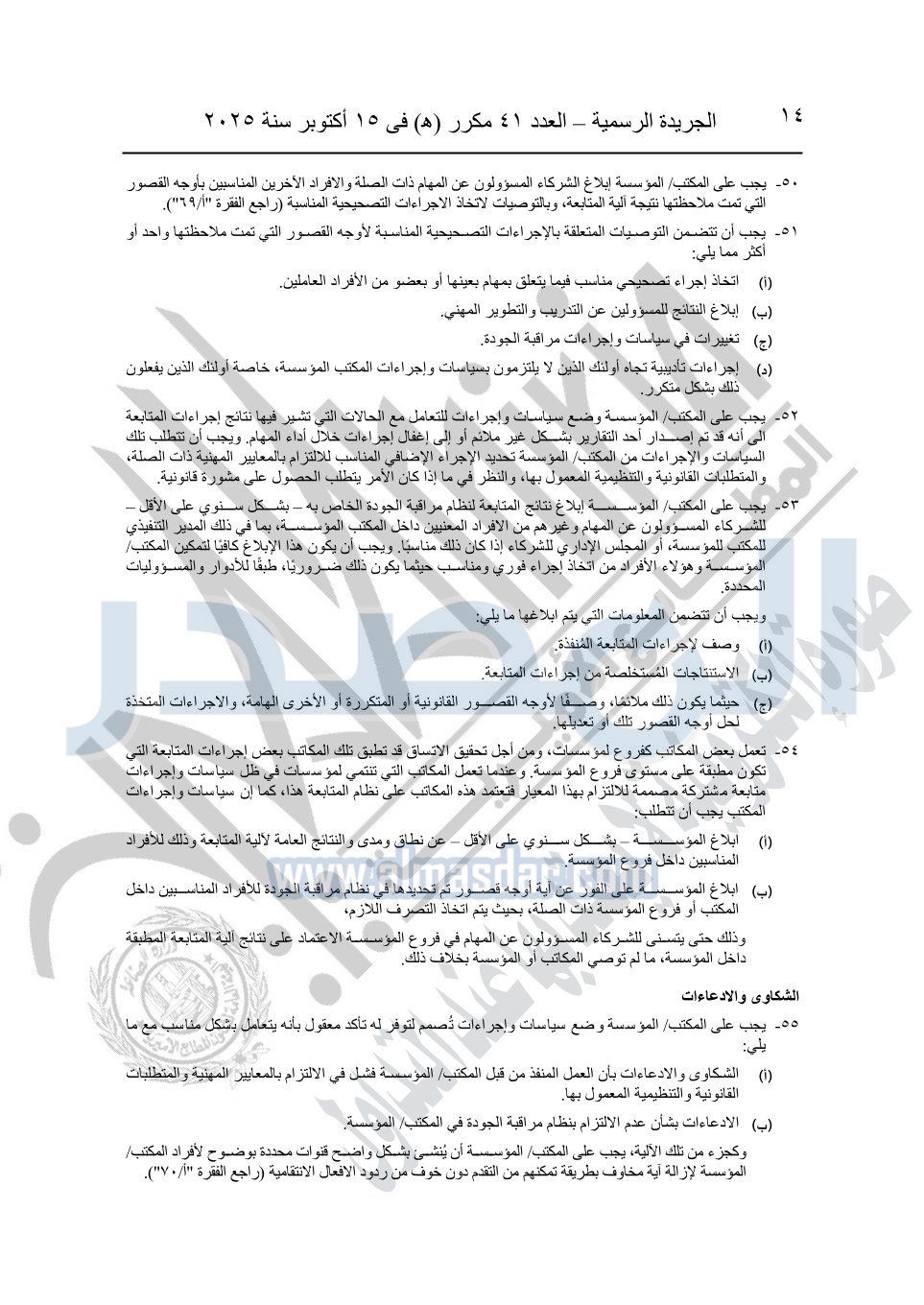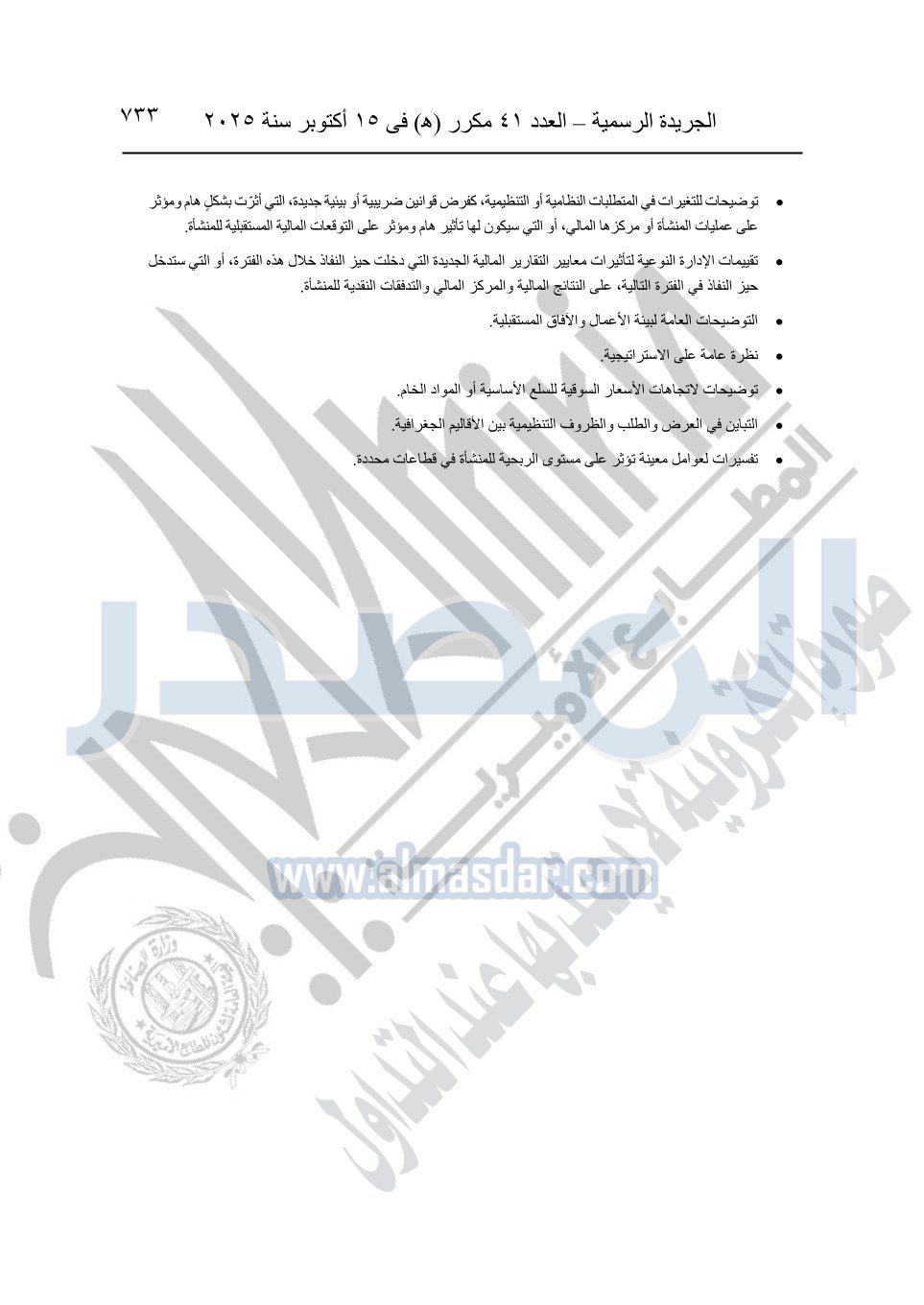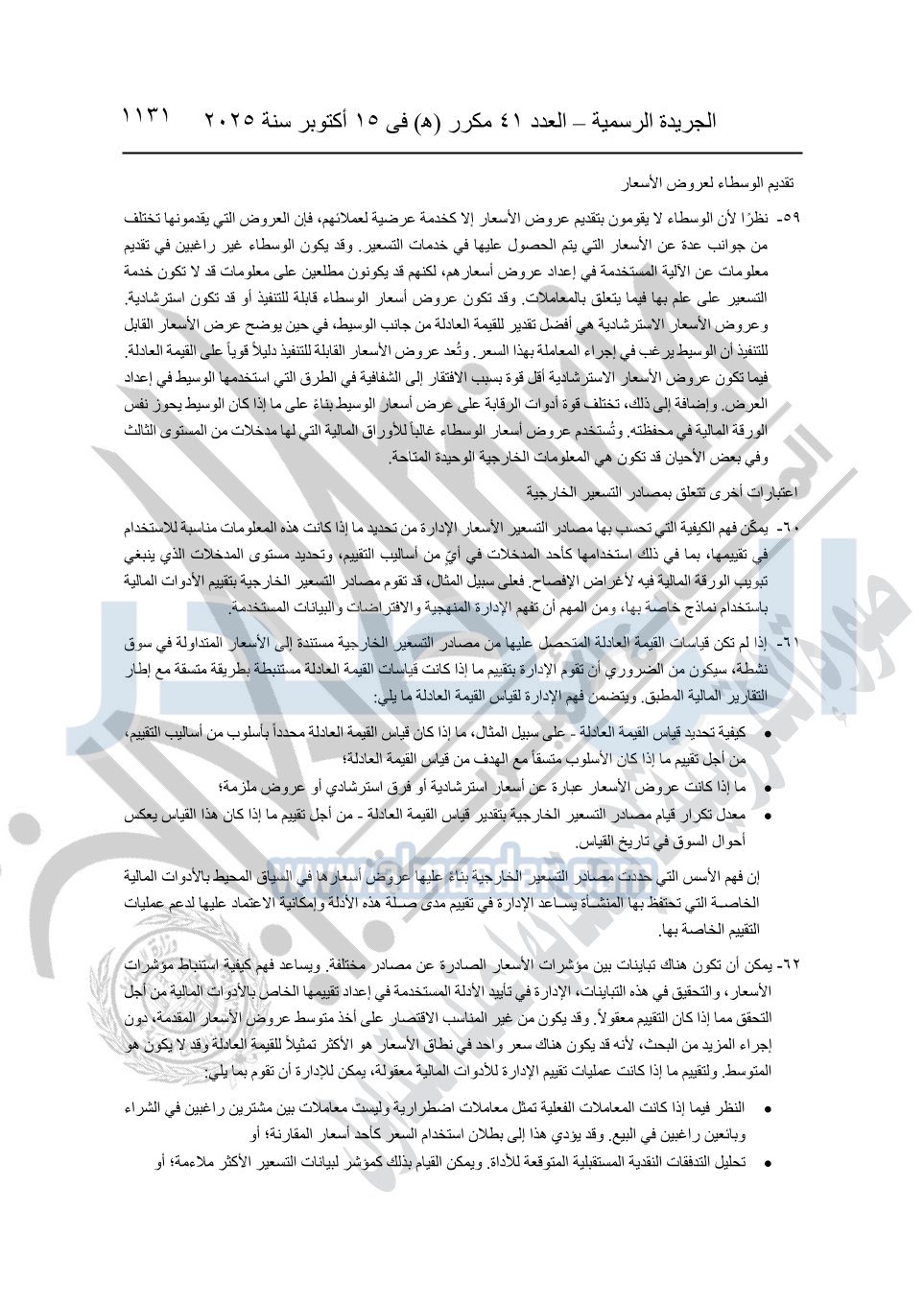 نشرت الجريدة الرسمية في العدد 41 مكرر "هـ" الصادر في 15 أكتوبر سنة 2025، قرار رئيس مجلس الوزراء رقم 3725 لسنة 2025، بشأن العمل بالمعايير المصرية للمراجعة والفحص المحدود ومهام التأكد الأخرى المرافقة لهذا القرار.