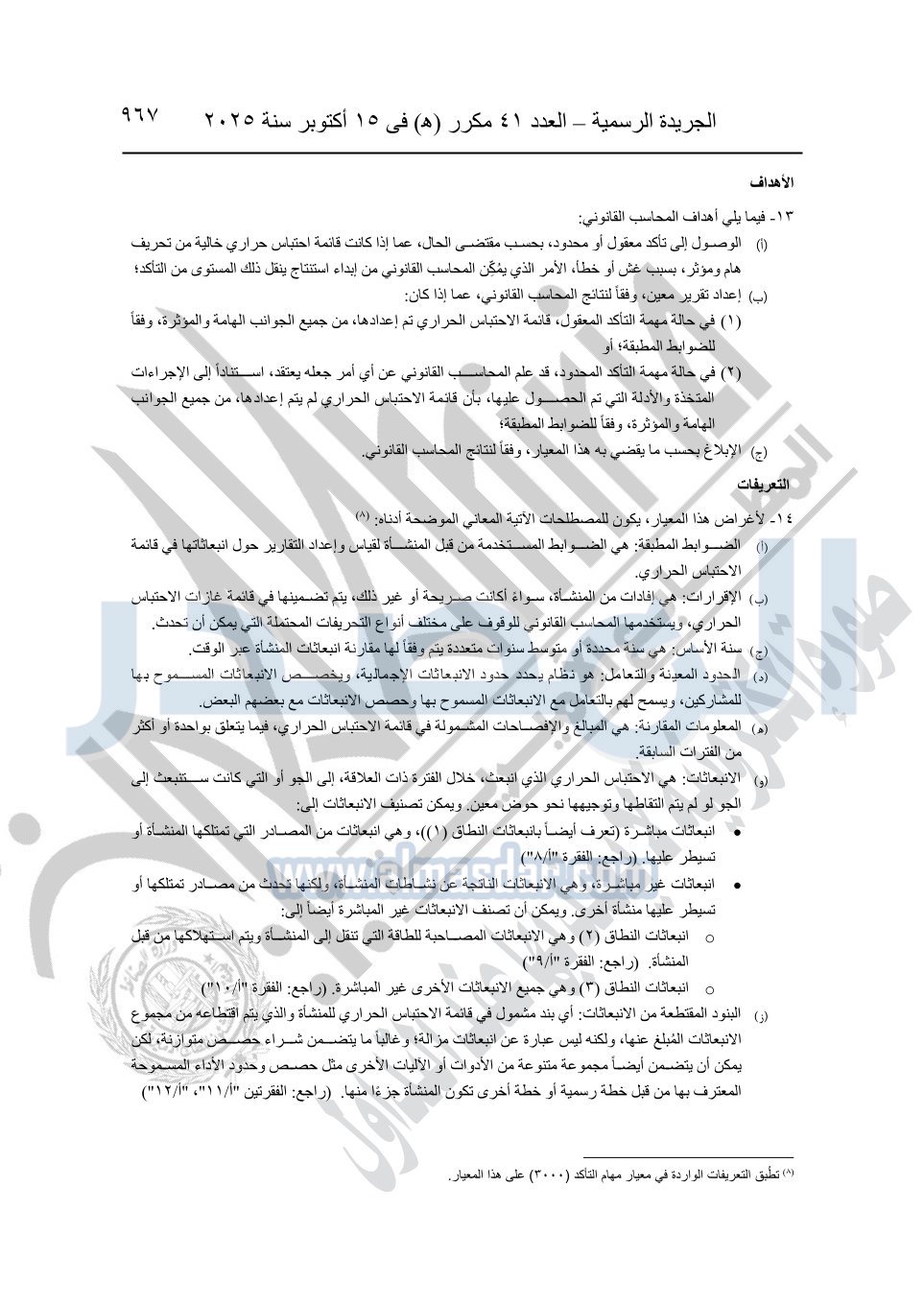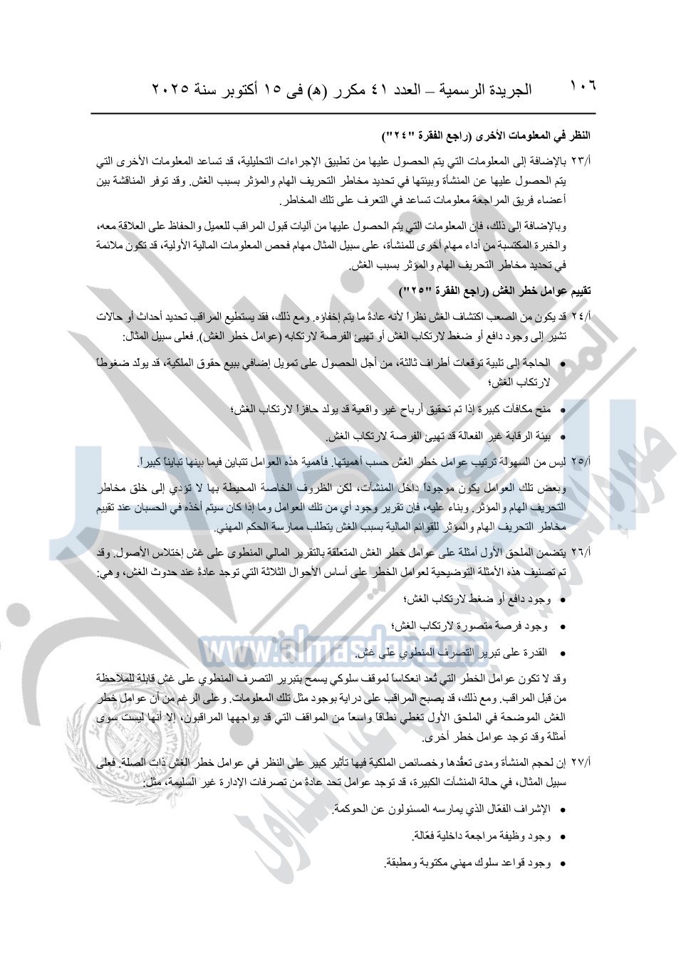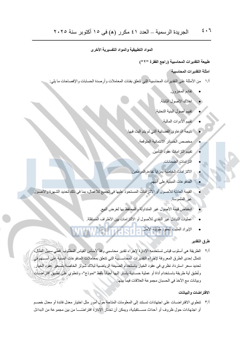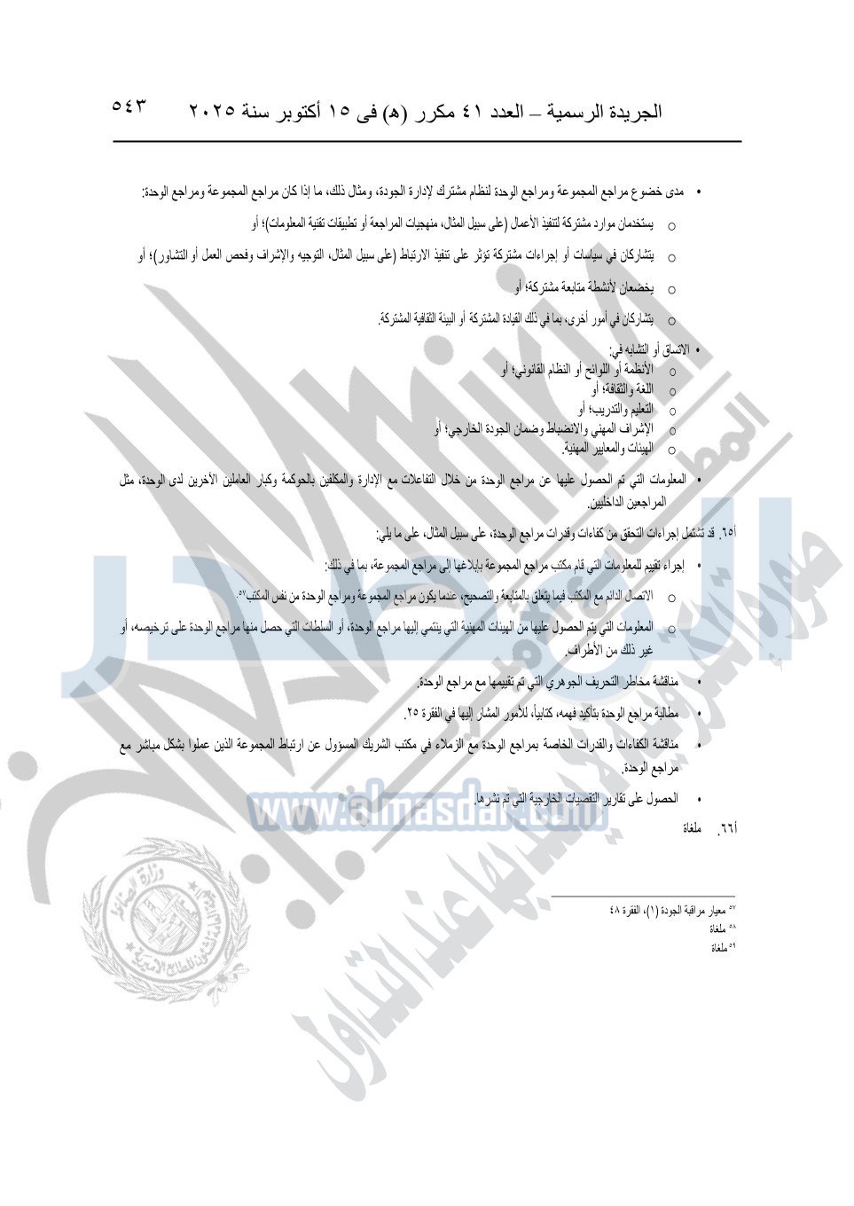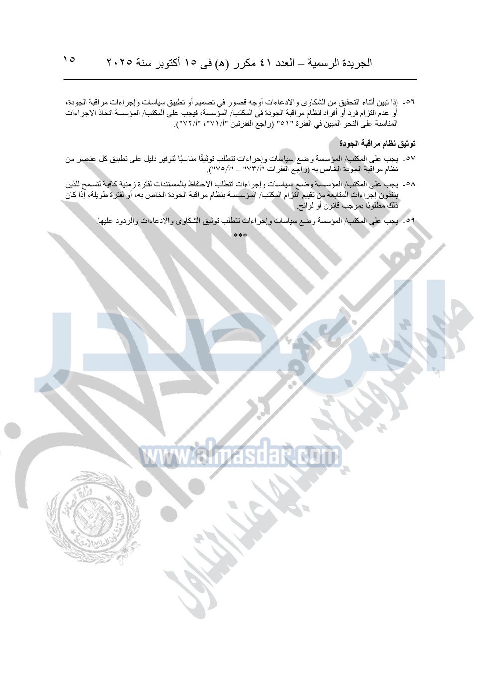 نشرت الجريدة الرسمية في العدد 41 مكرر "هـ" الصادر في 15 أكتوبر سنة 2025، قرار رئيس مجلس الوزراء رقم 3725 لسنة 2025، بشأن العمل بالمعايير المصرية للمراجعة والفحص المحدود ومهام التأكد الأخرى المرافقة لهذا القرار.