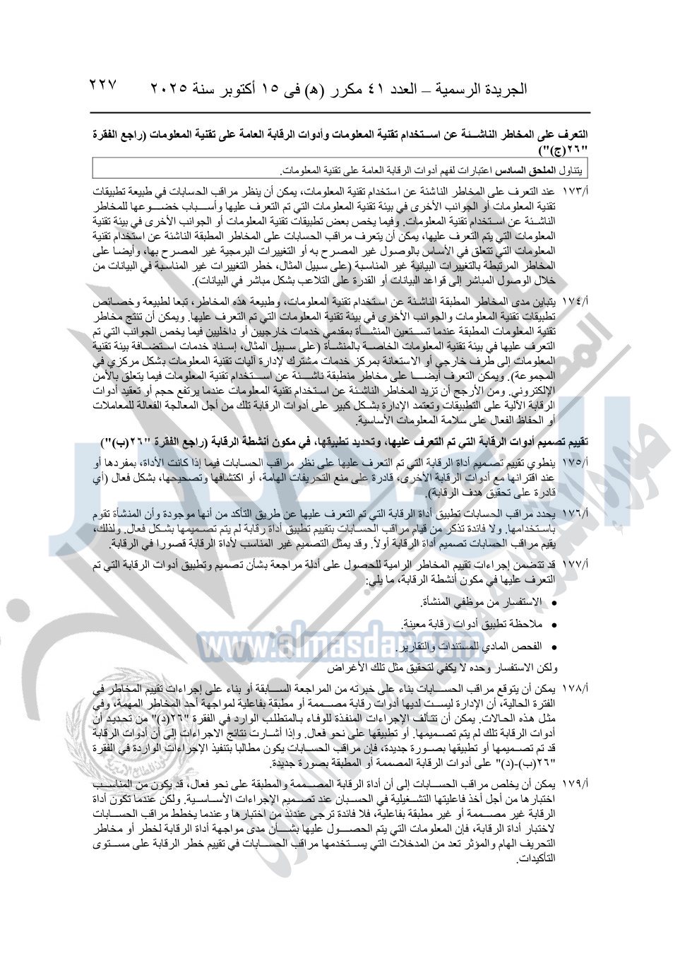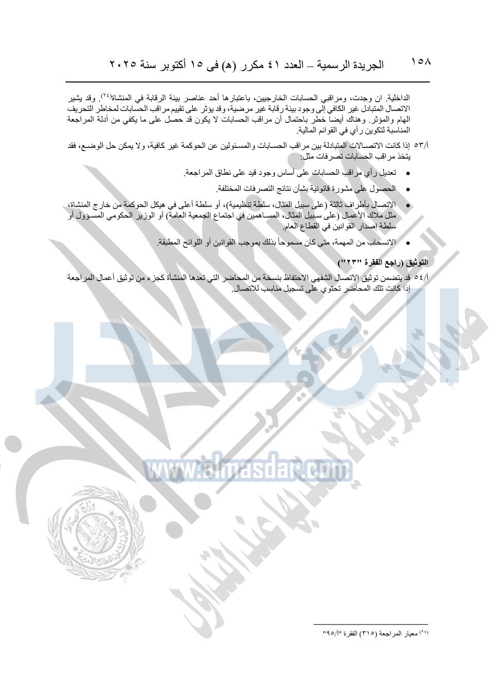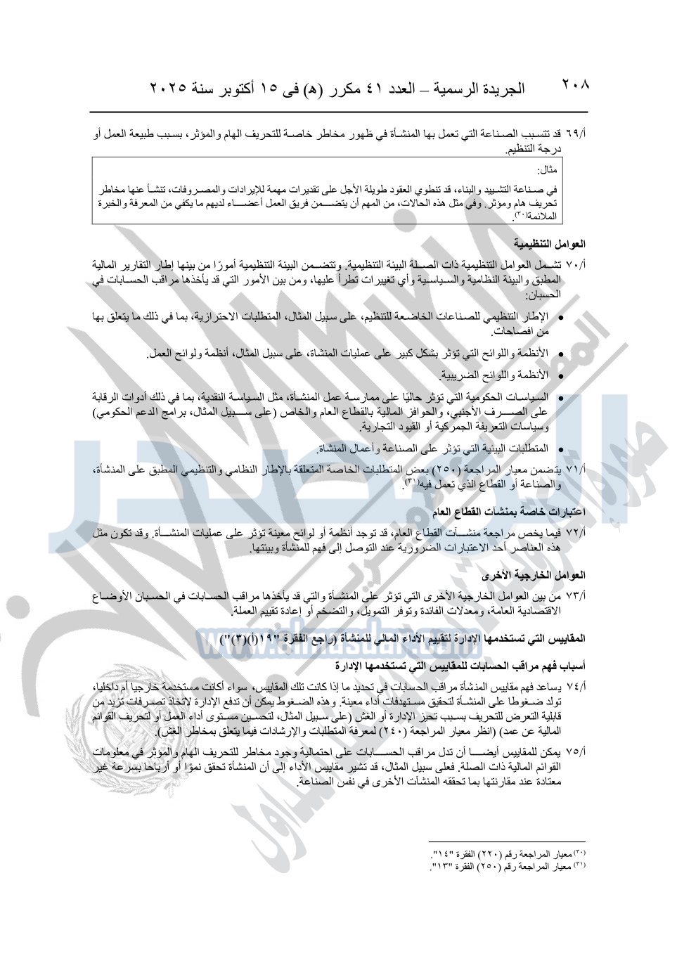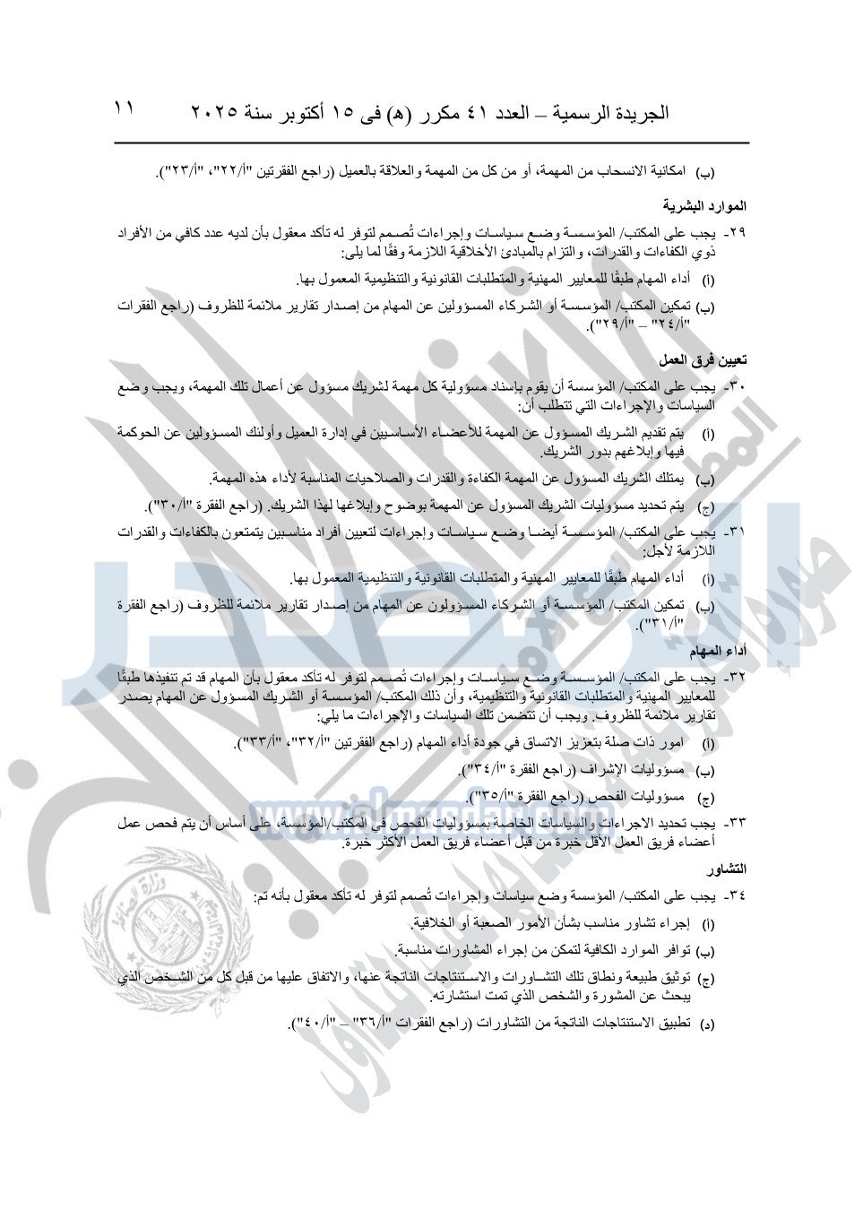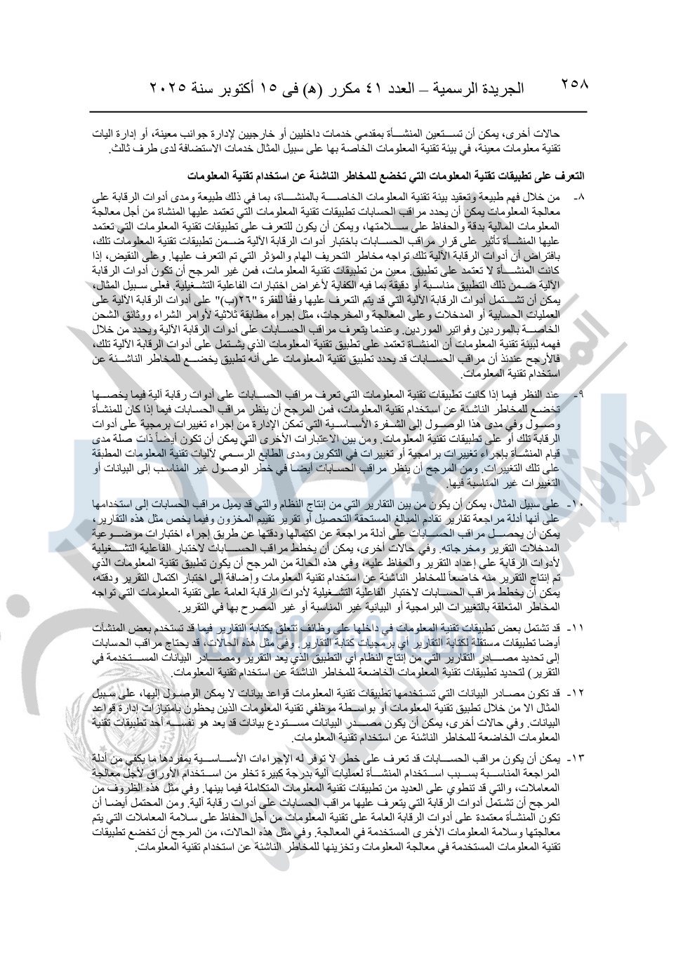 نشرت الجريدة الرسمية في العدد 41 مكرر "هـ" الصادر في 15 أكتوبر سنة 2025، قرار رئيس مجلس الوزراء رقم 3725 لسنة 2025، بشأن العمل بالمعايير المصرية للمراجعة والفحص المحدود ومهام التأكد الأخرى المرافقة لهذا القرار.