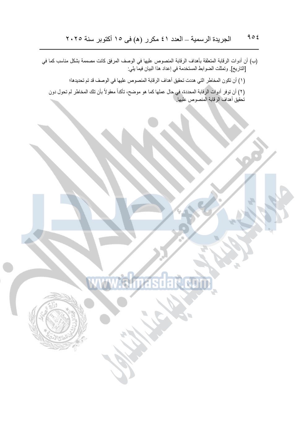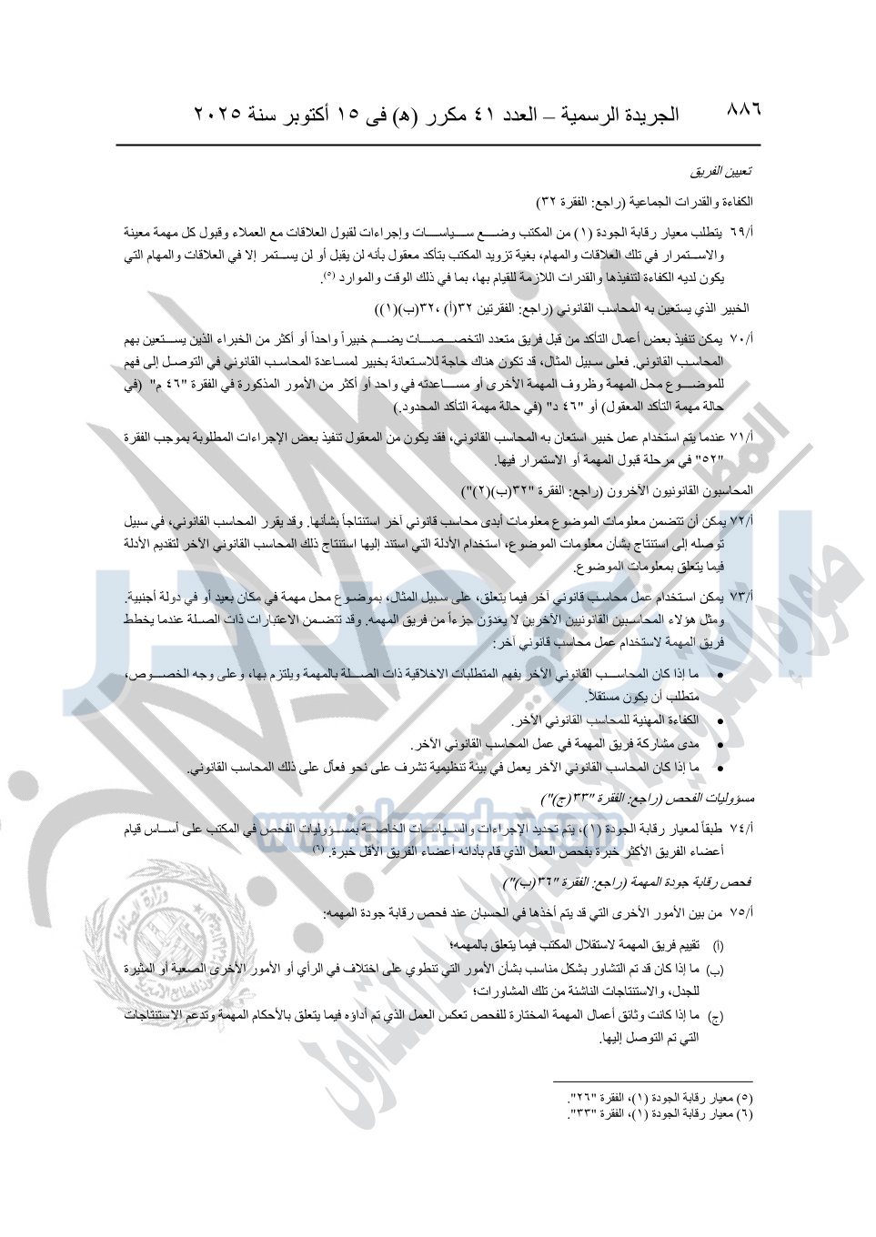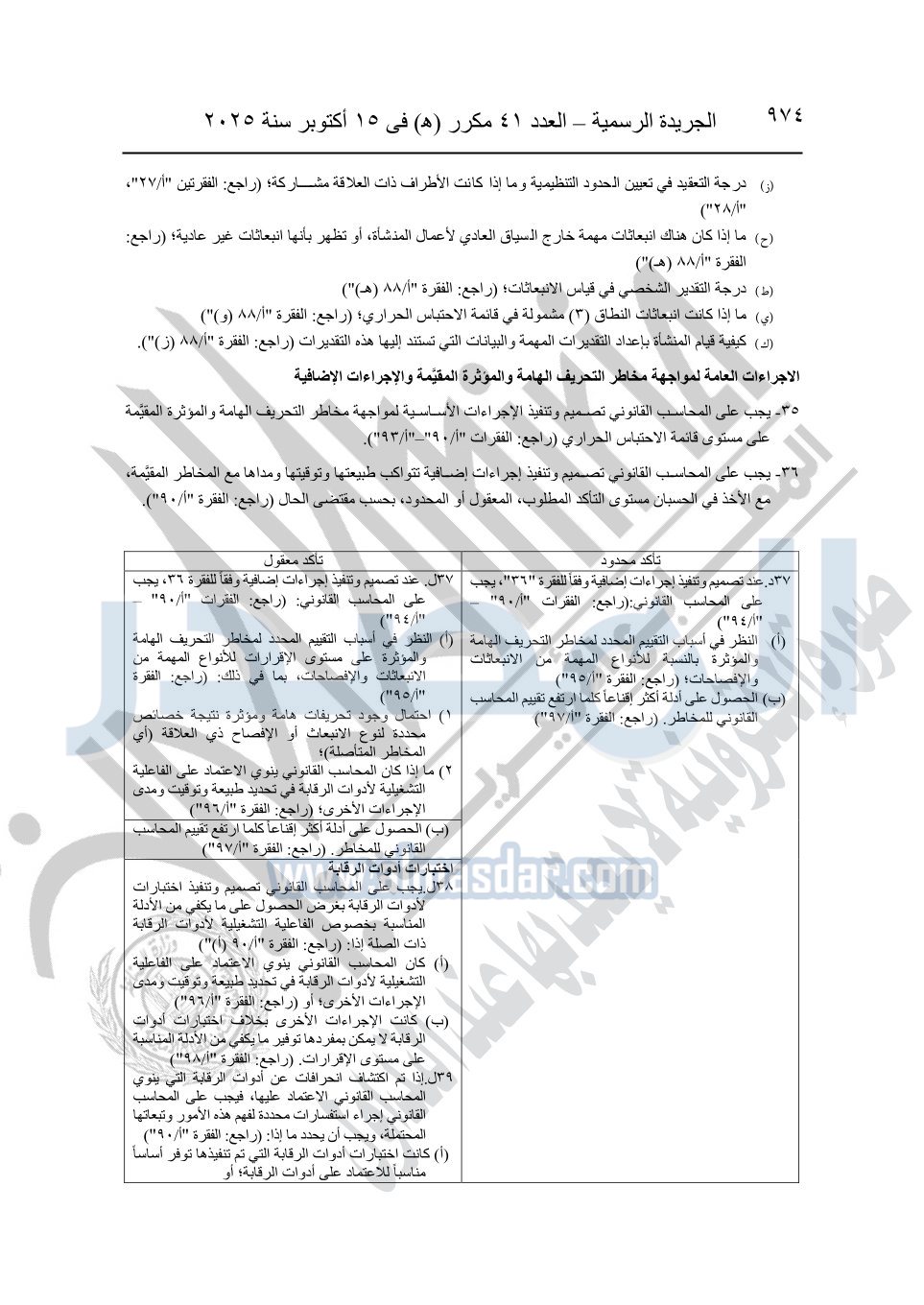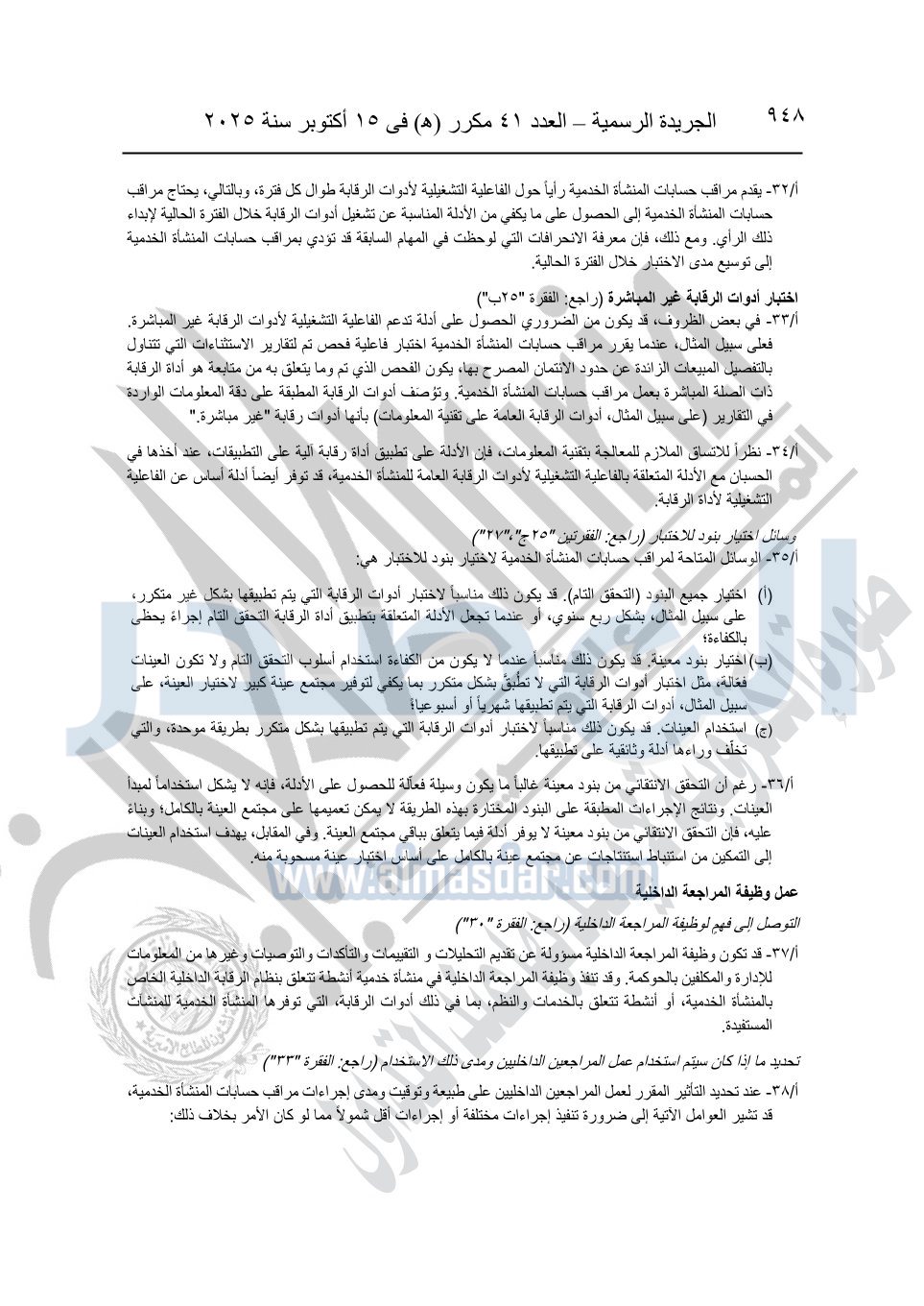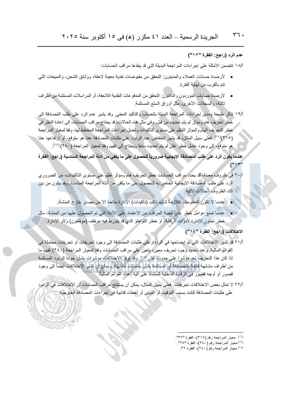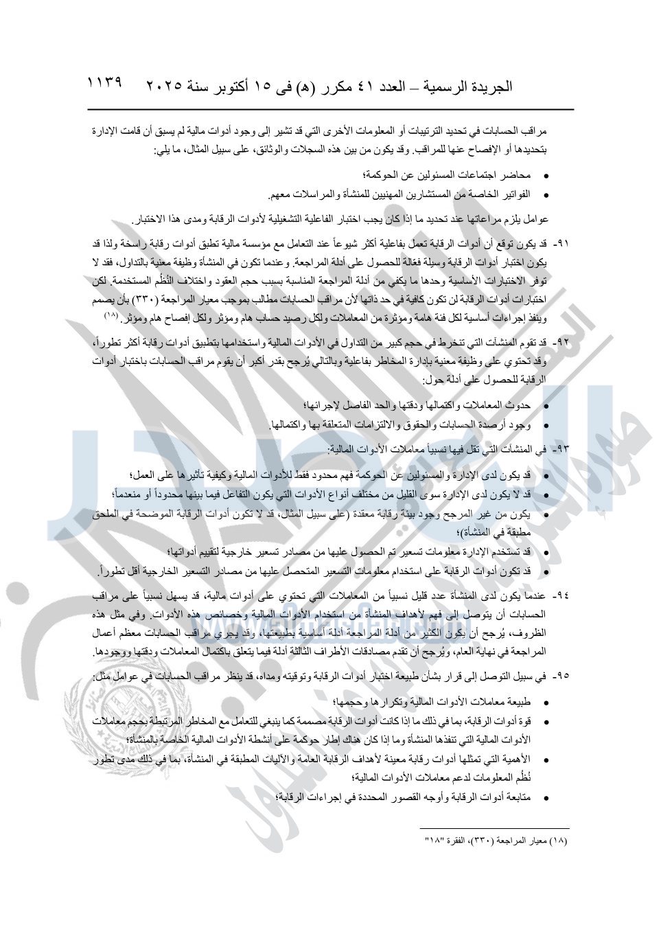 نشرت الجريدة الرسمية في العدد 41 مكرر "هـ" الصادر في 15 أكتوبر سنة 2025، قرار رئيس مجلس الوزراء رقم 3725 لسنة 2025، بشأن العمل بالمعايير المصرية للمراجعة والفحص المحدود ومهام التأكد الأخرى المرافقة لهذا القرار.