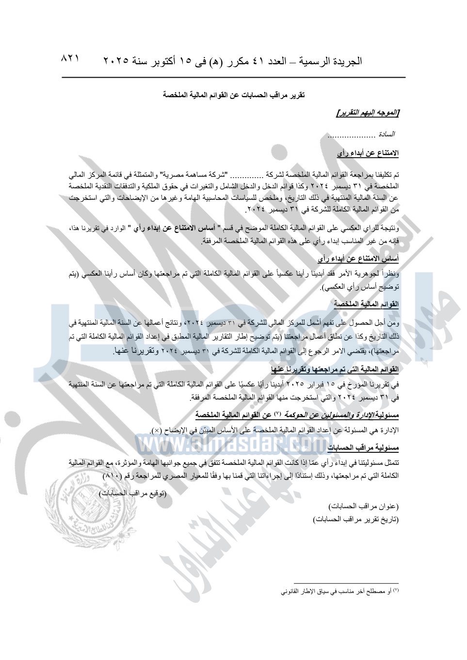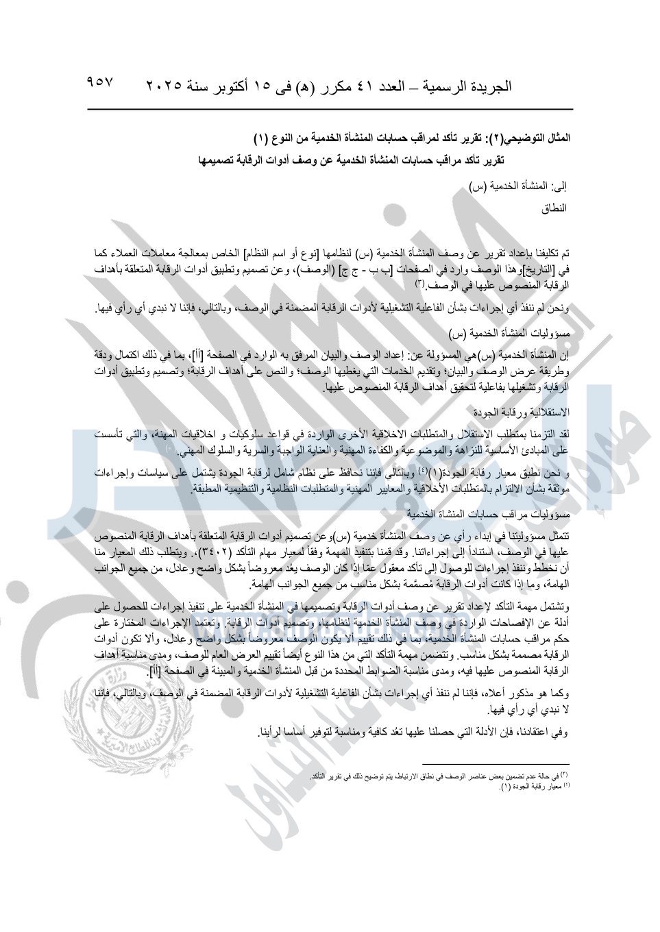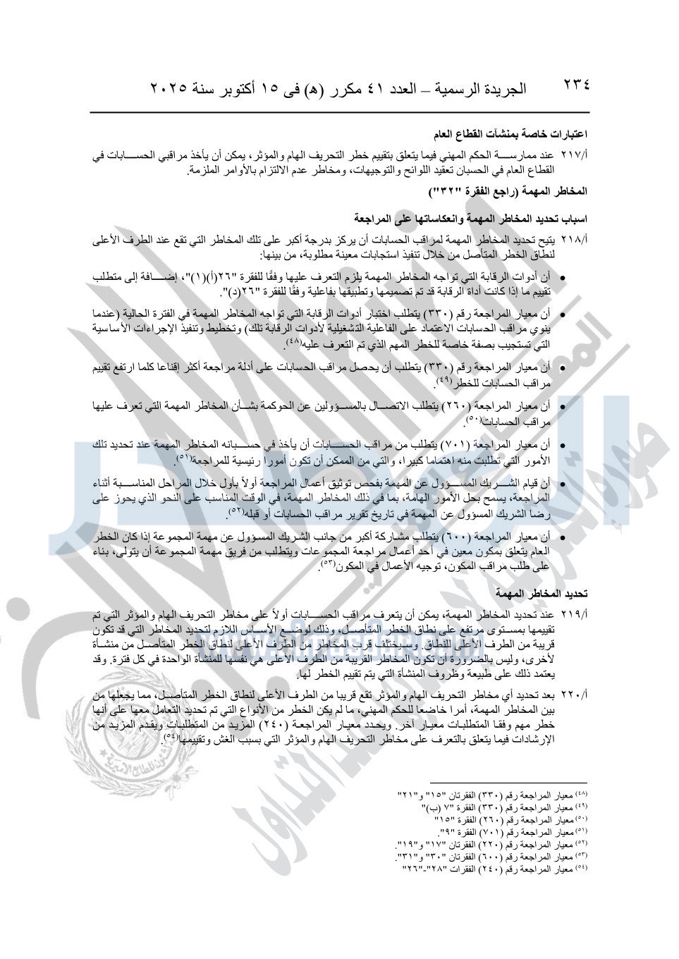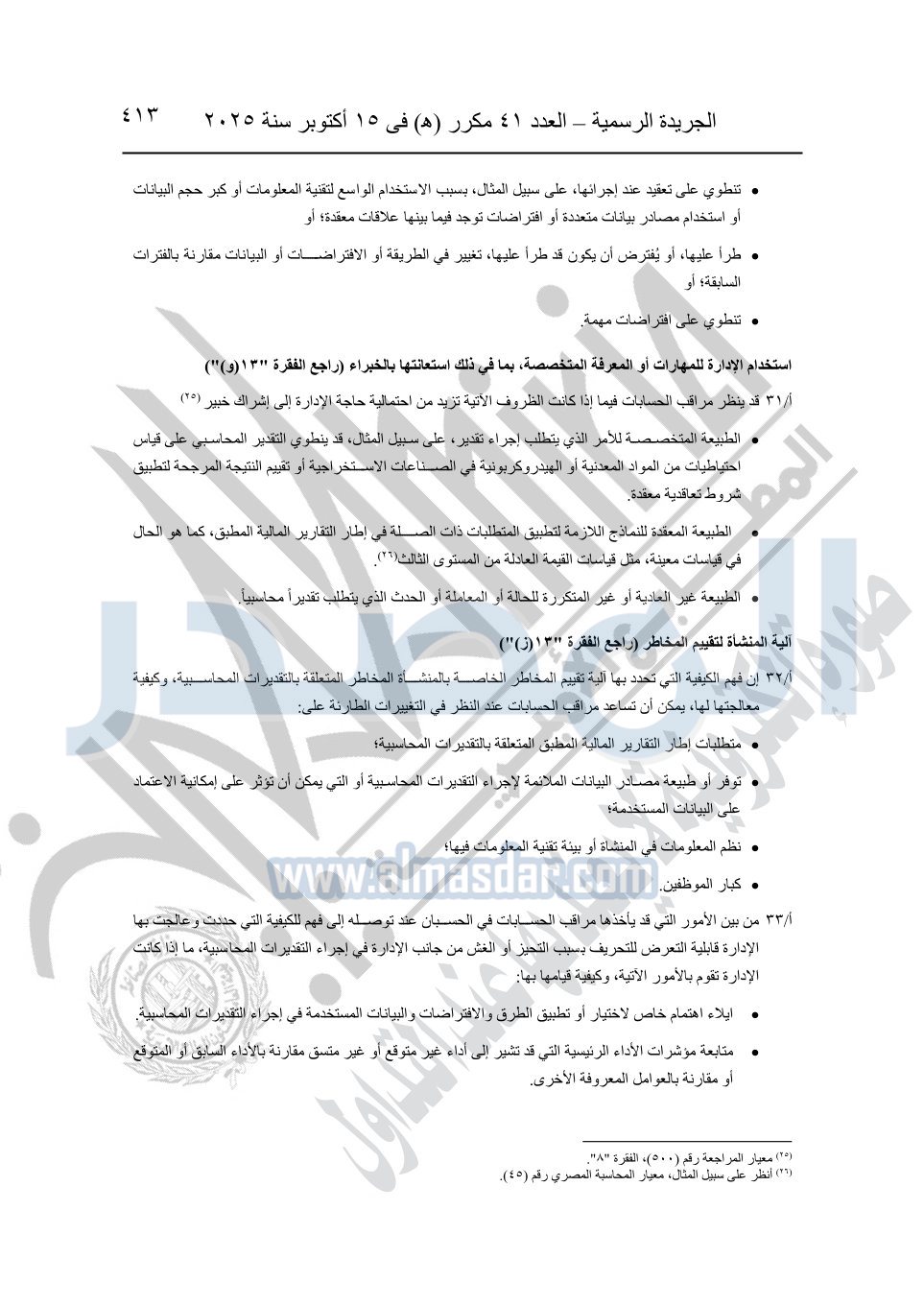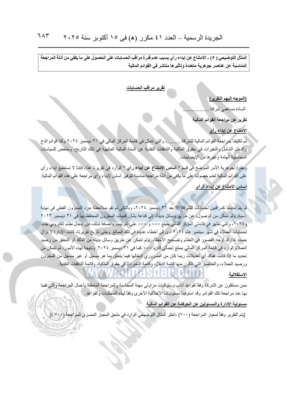 نشرت الجريدة الرسمية في العدد 41 مكرر "هـ" الصادر في 15 أكتوبر سنة 2025، قرار رئيس مجلس الوزراء رقم 3725 لسنة 2025، بشأن العمل بالمعايير المصرية للمراجعة والفحص المحدود ومهام التأكد الأخرى المرافقة لهذا القرار.