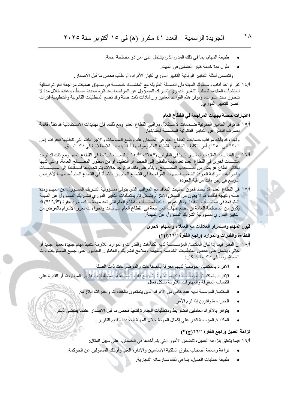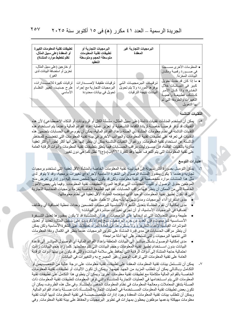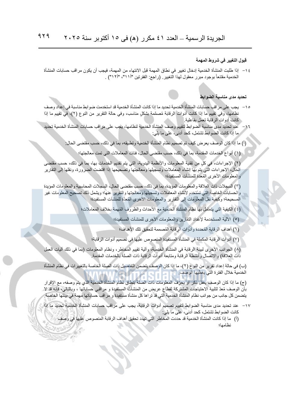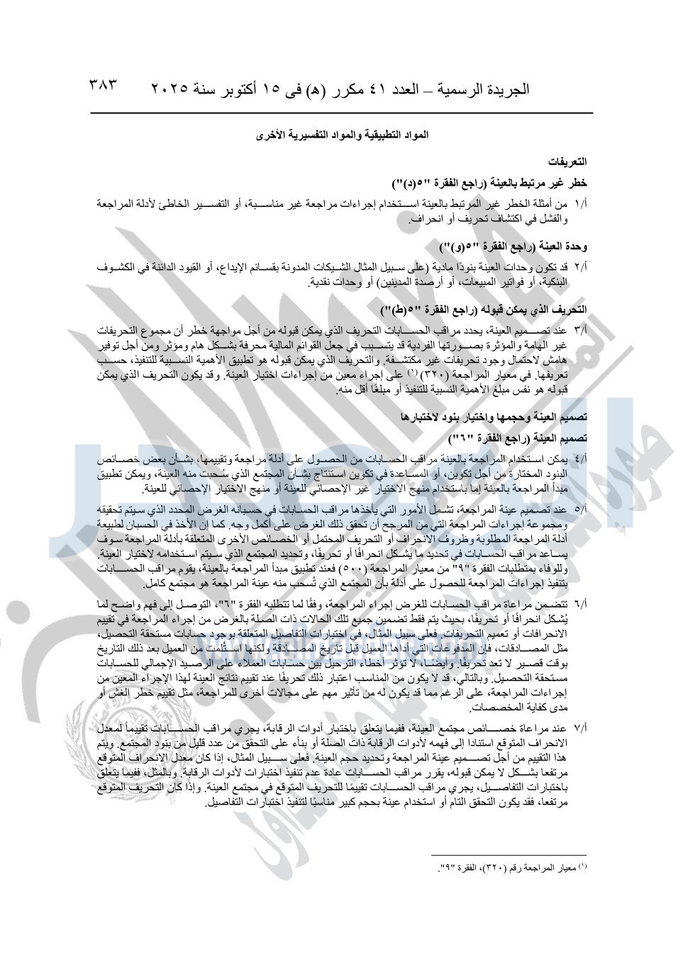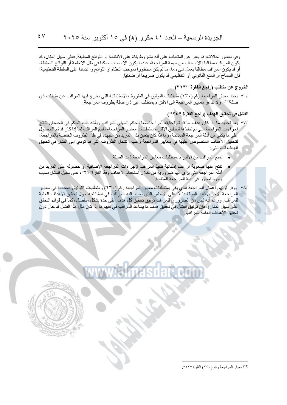 نشرت الجريدة الرسمية في العدد 41 مكرر "هـ" الصادر في 15 أكتوبر سنة 2025، قرار رئيس مجلس الوزراء رقم 3725 لسنة 2025، بشأن العمل بالمعايير المصرية للمراجعة والفحص المحدود ومهام التأكد الأخرى المرافقة لهذا القرار.