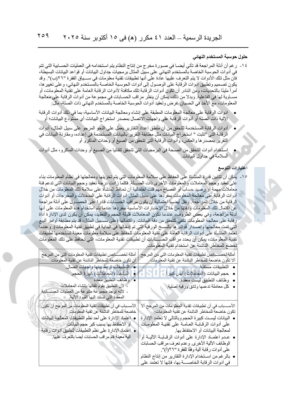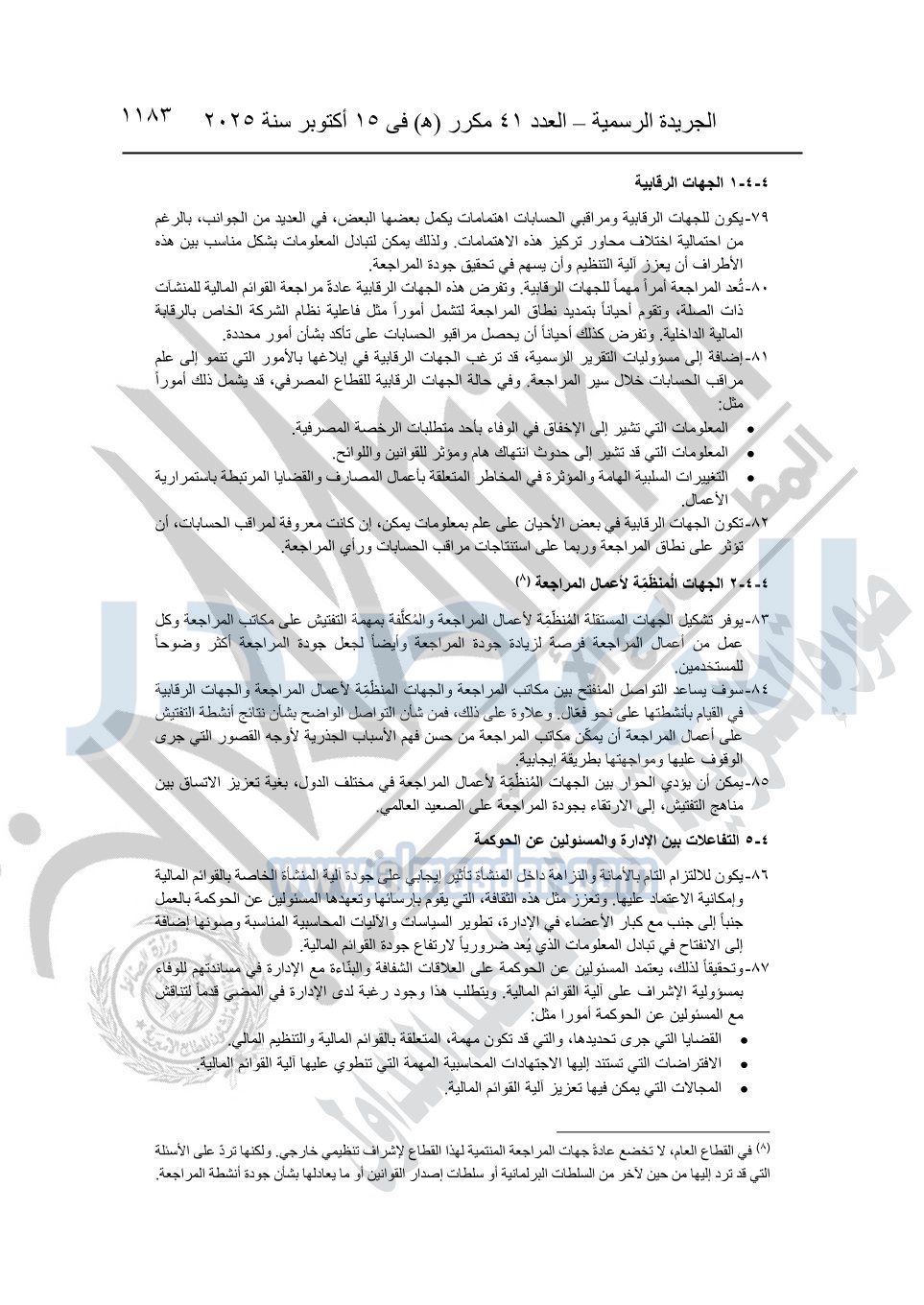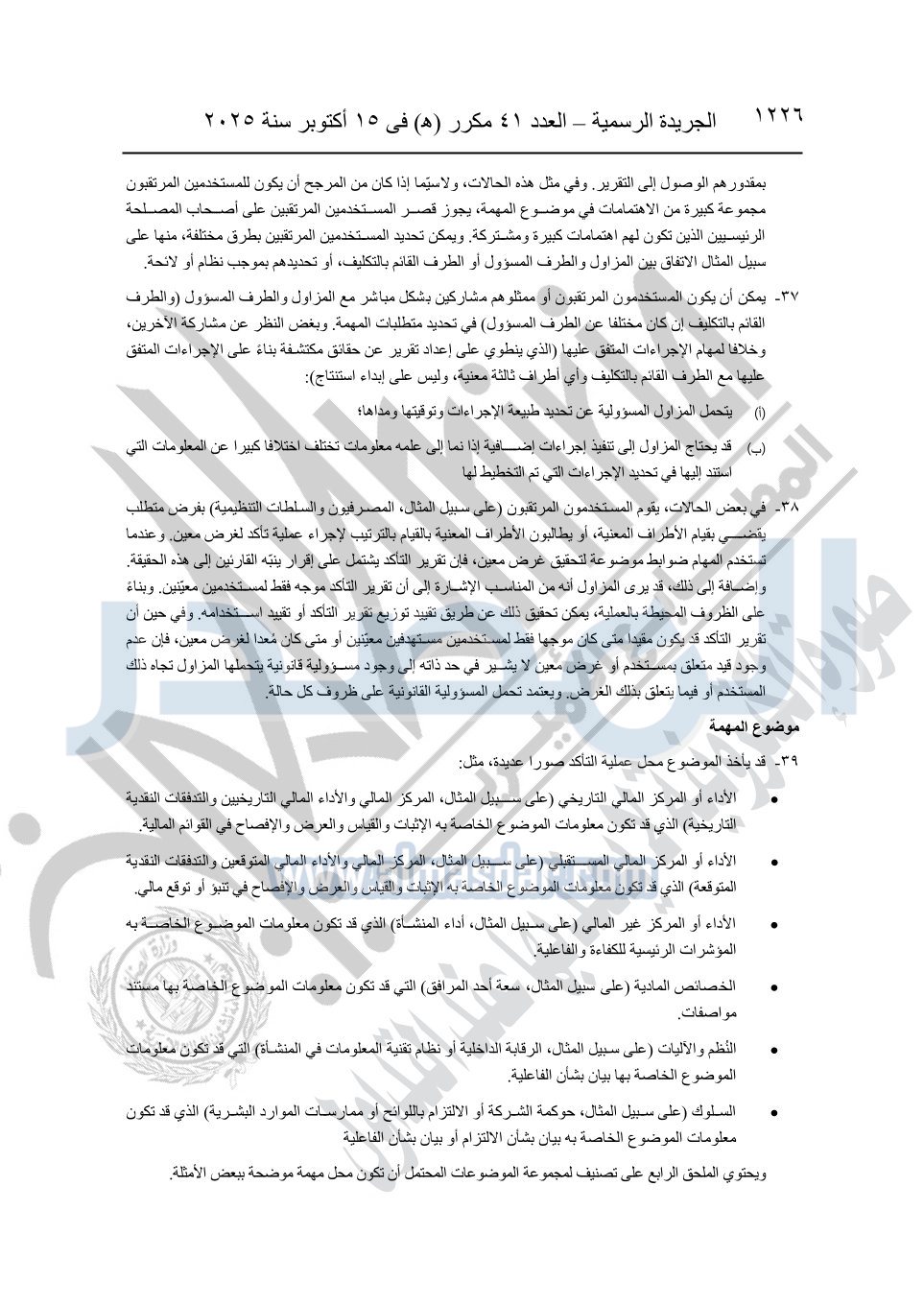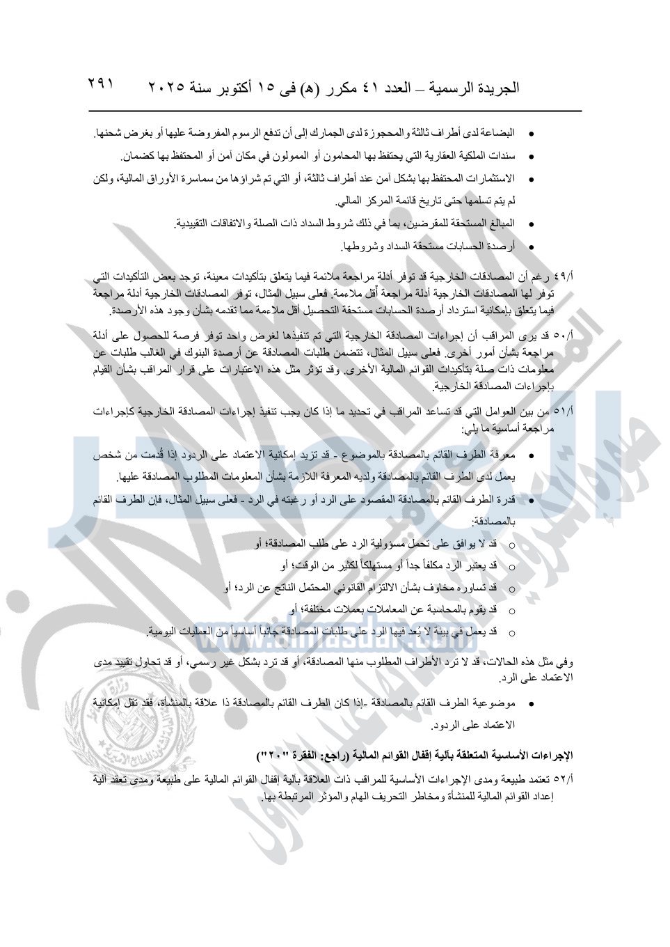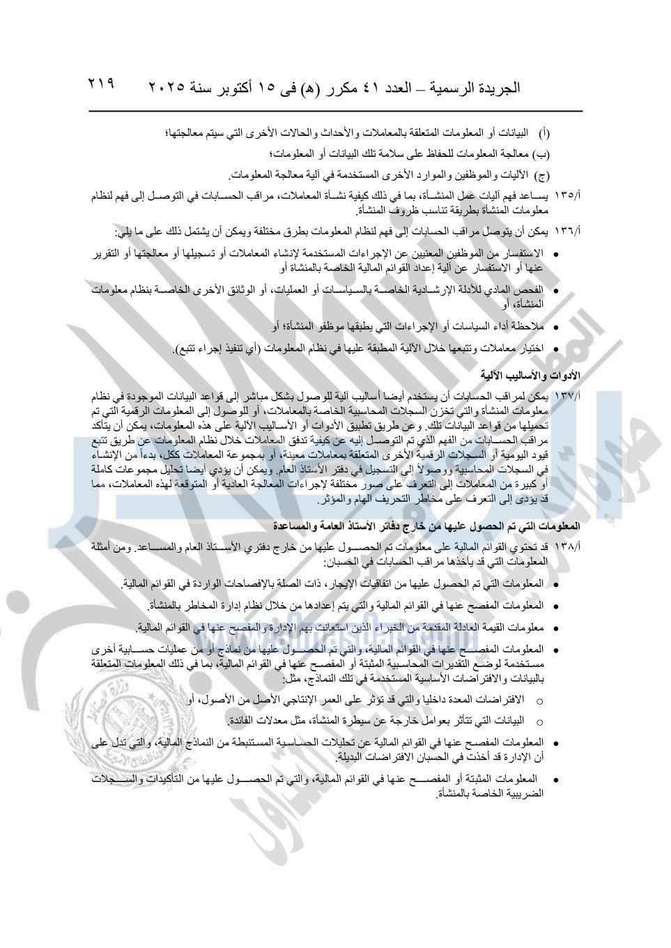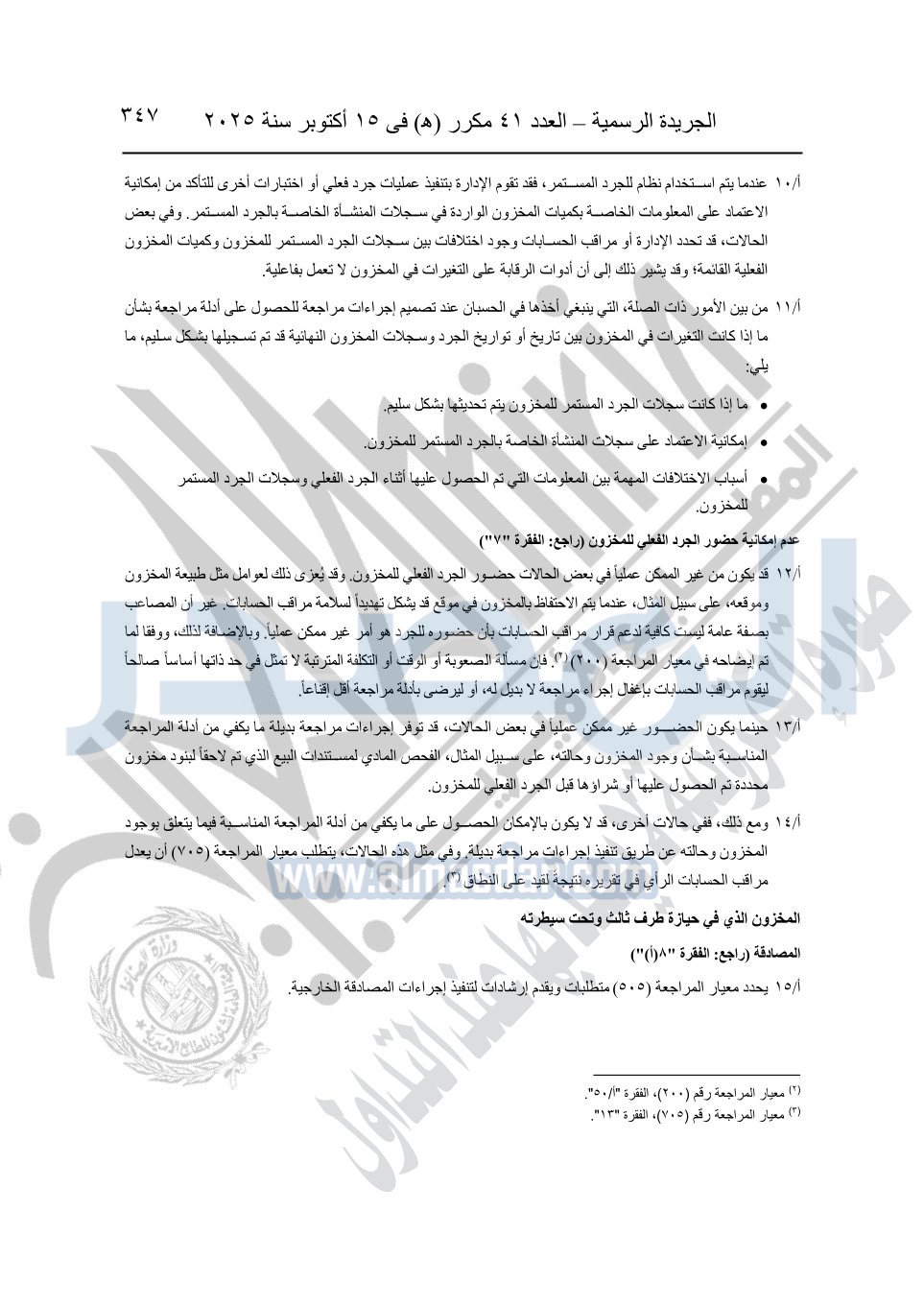 نشرت الجريدة الرسمية في العدد 41 مكرر "هـ" الصادر في 15 أكتوبر سنة 2025، قرار رئيس مجلس الوزراء رقم 3725 لسنة 2025، بشأن العمل بالمعايير المصرية للمراجعة والفحص المحدود ومهام التأكد الأخرى المرافقة لهذا القرار.