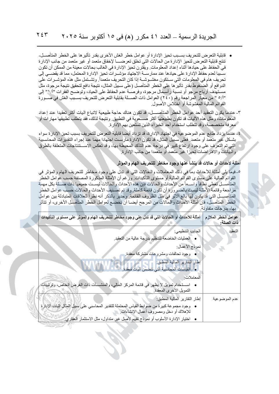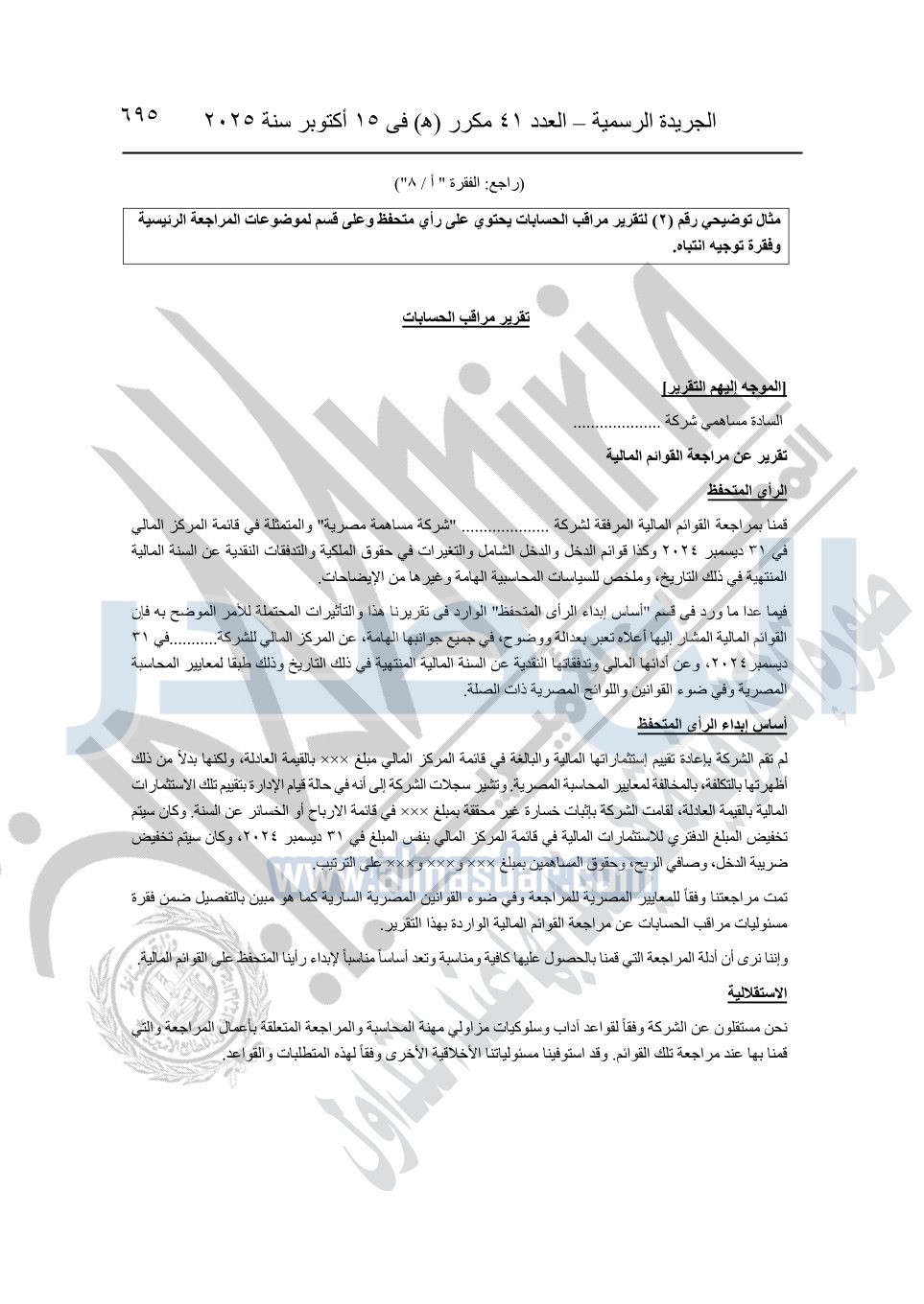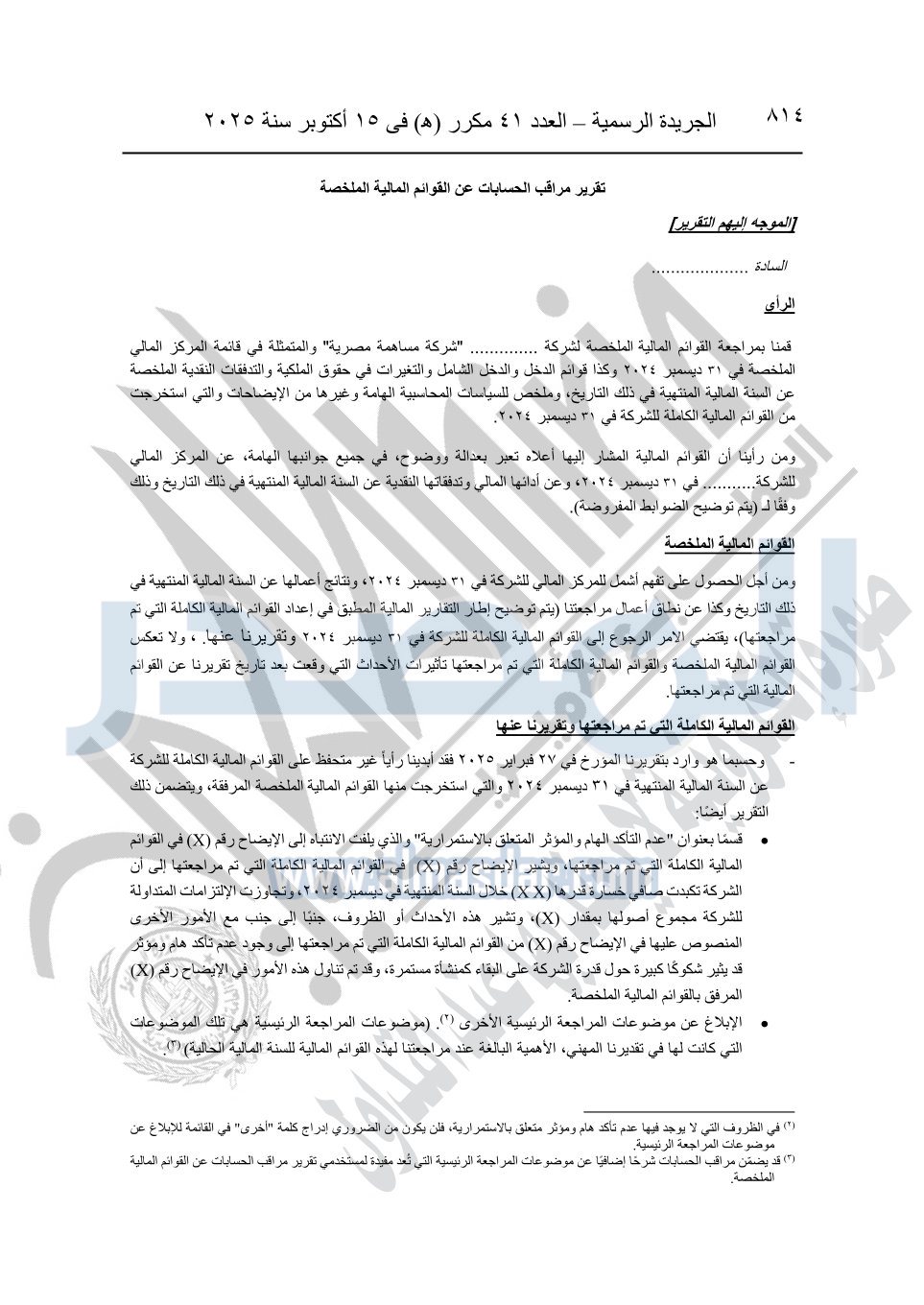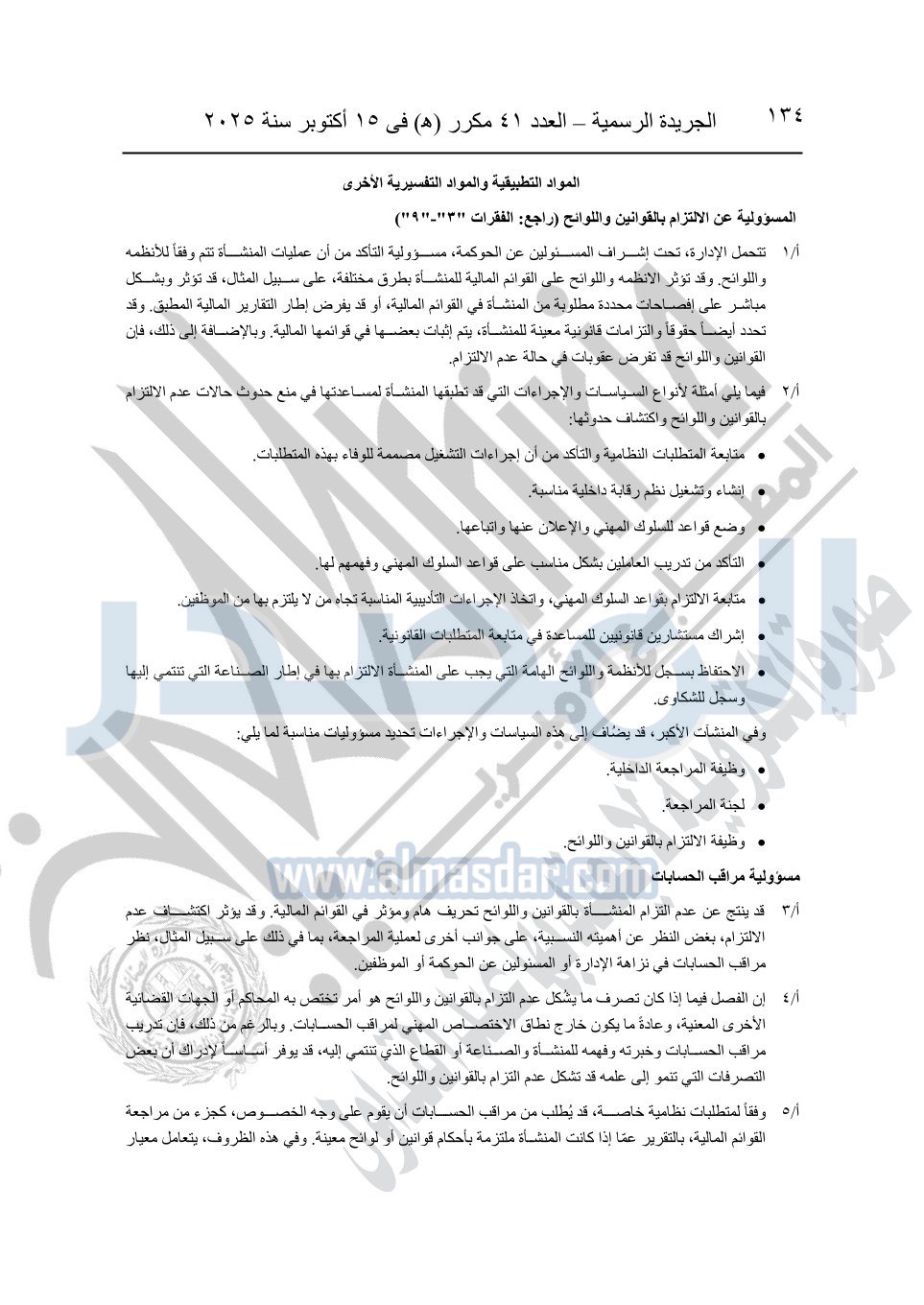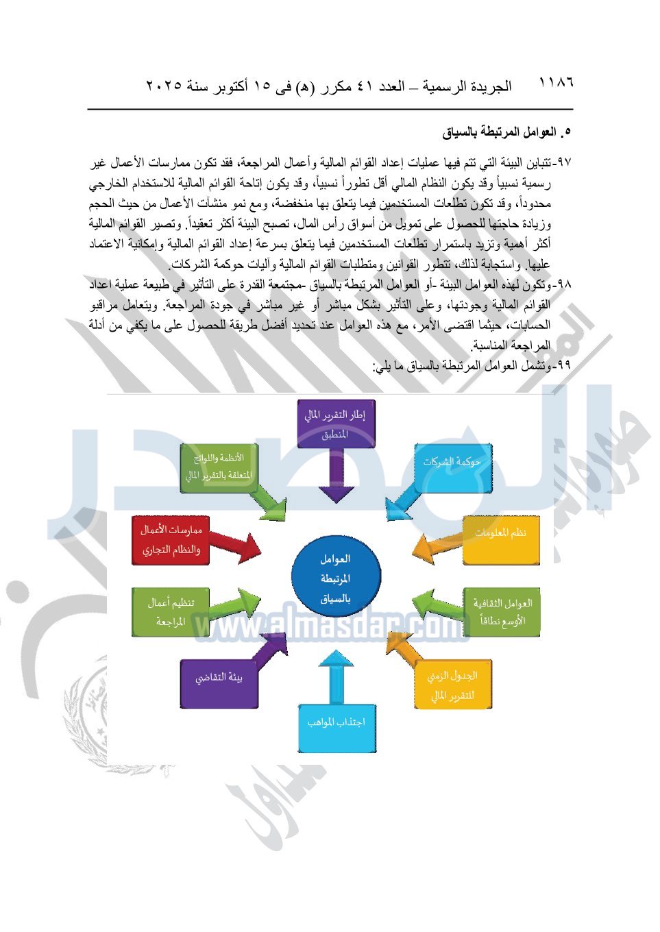 نشرت الجريدة الرسمية في العدد 41 مكرر "هـ" الصادر في 15 أكتوبر سنة 2025، قرار رئيس مجلس الوزراء رقم 3725 لسنة 2025، بشأن العمل بالمعايير المصرية للمراجعة والفحص المحدود ومهام التأكد الأخرى المرافقة لهذا القرار.