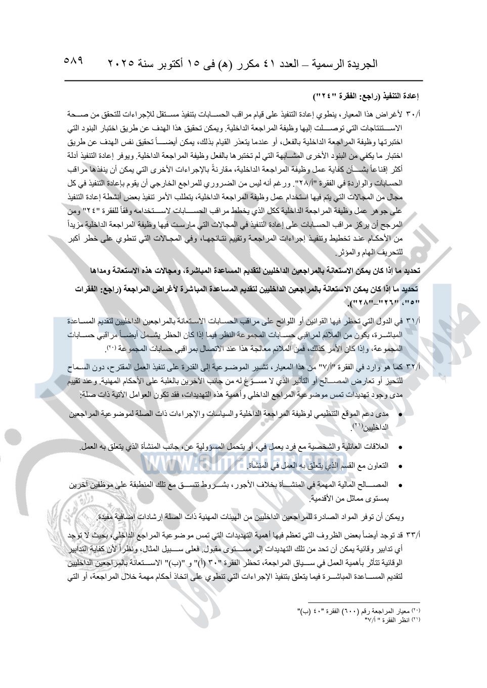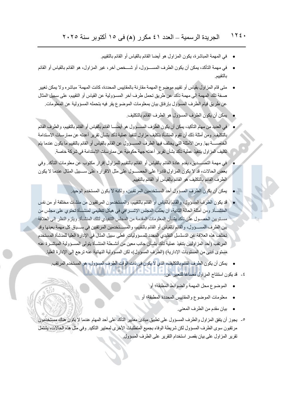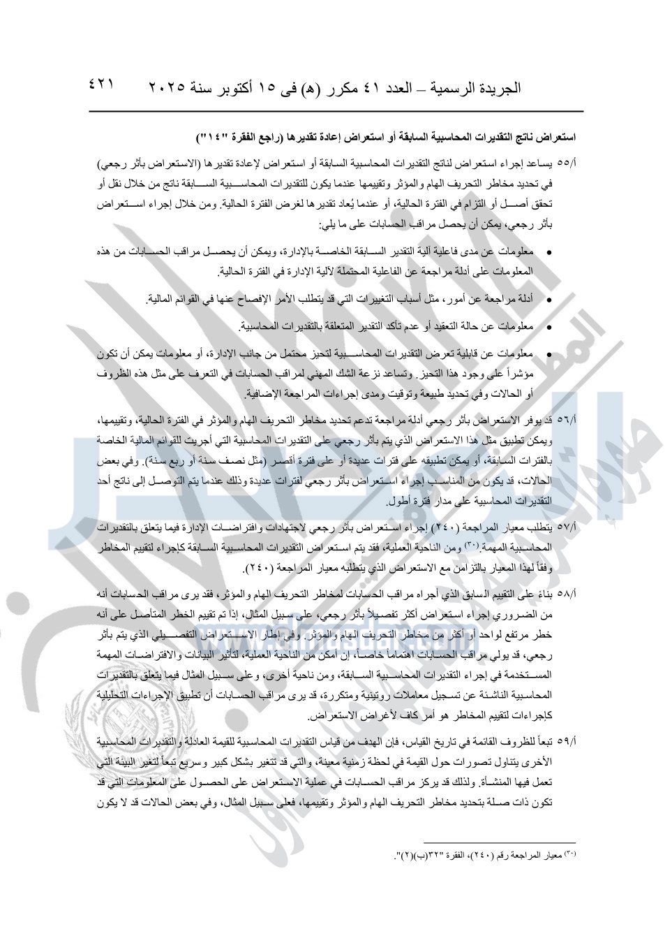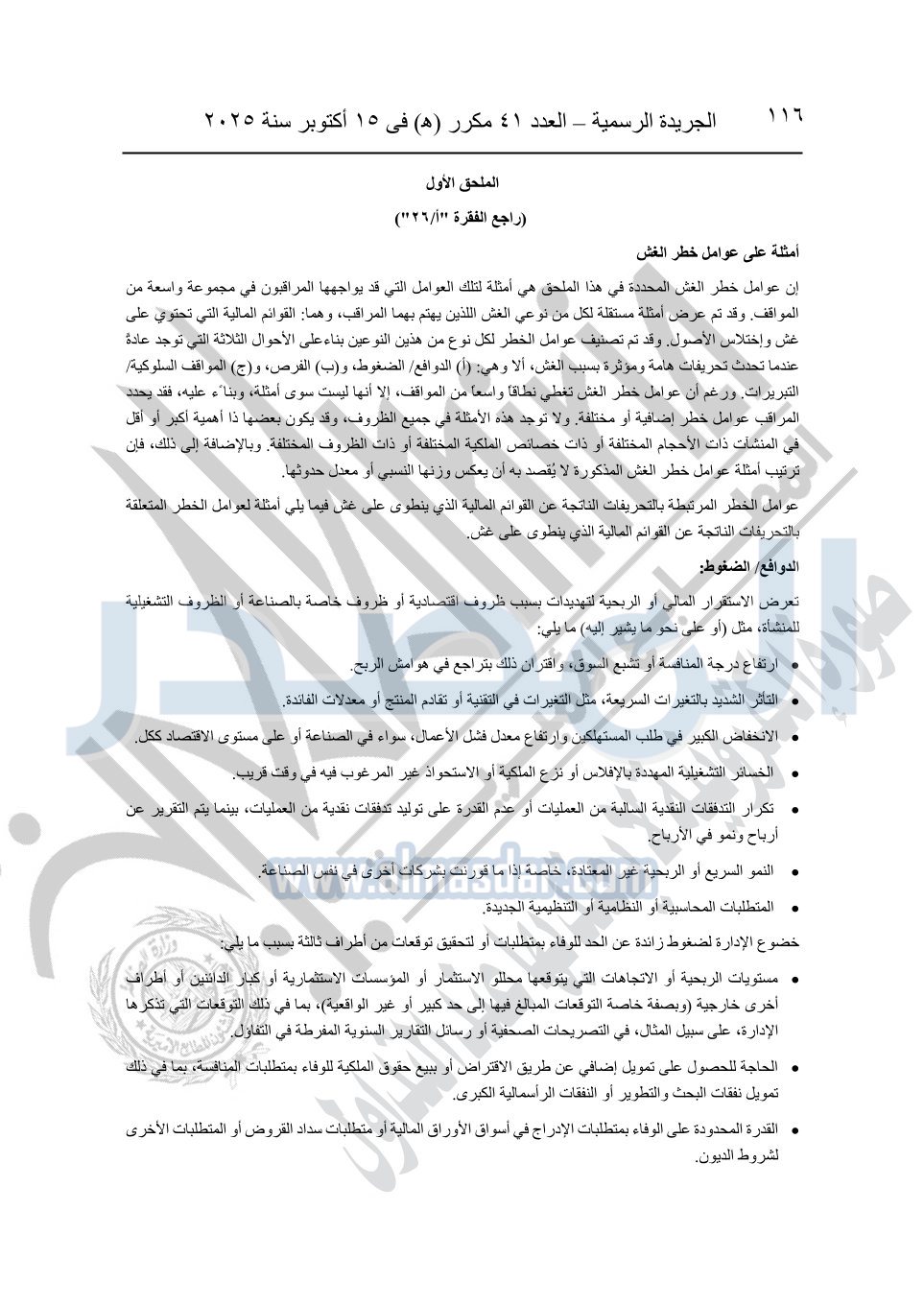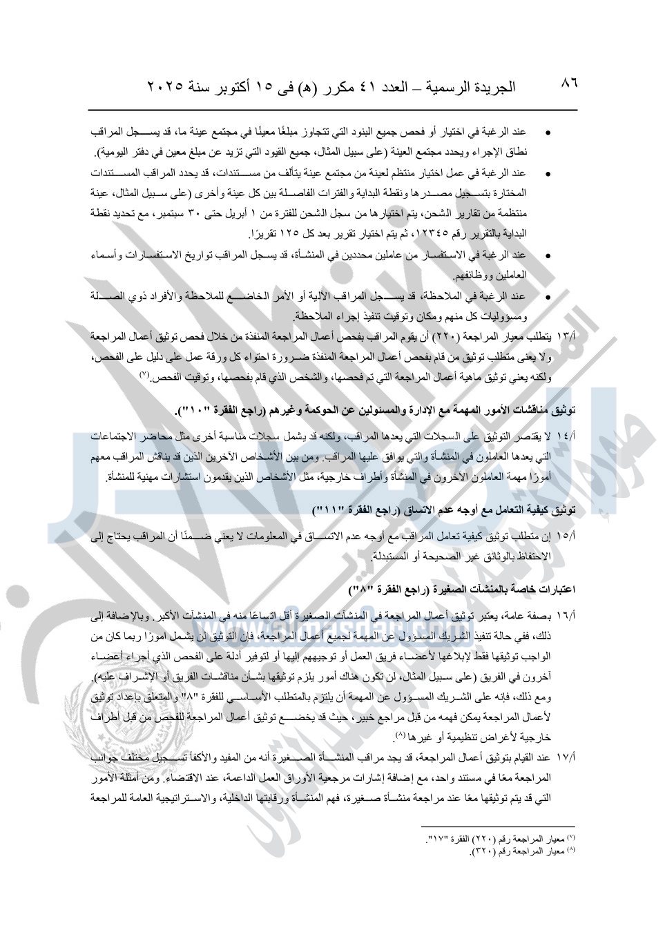 نشرت الجريدة الرسمية في العدد 41 مكرر "هـ" الصادر في 15 أكتوبر سنة 2025، قرار رئيس مجلس الوزراء رقم 3725 لسنة 2025، بشأن العمل بالمعايير المصرية للمراجعة والفحص المحدود ومهام التأكد الأخرى المرافقة لهذا القرار.