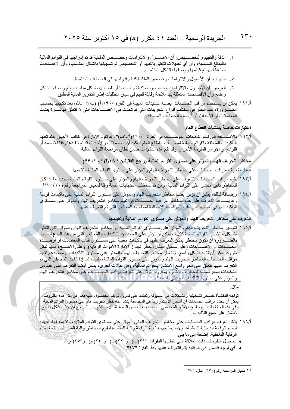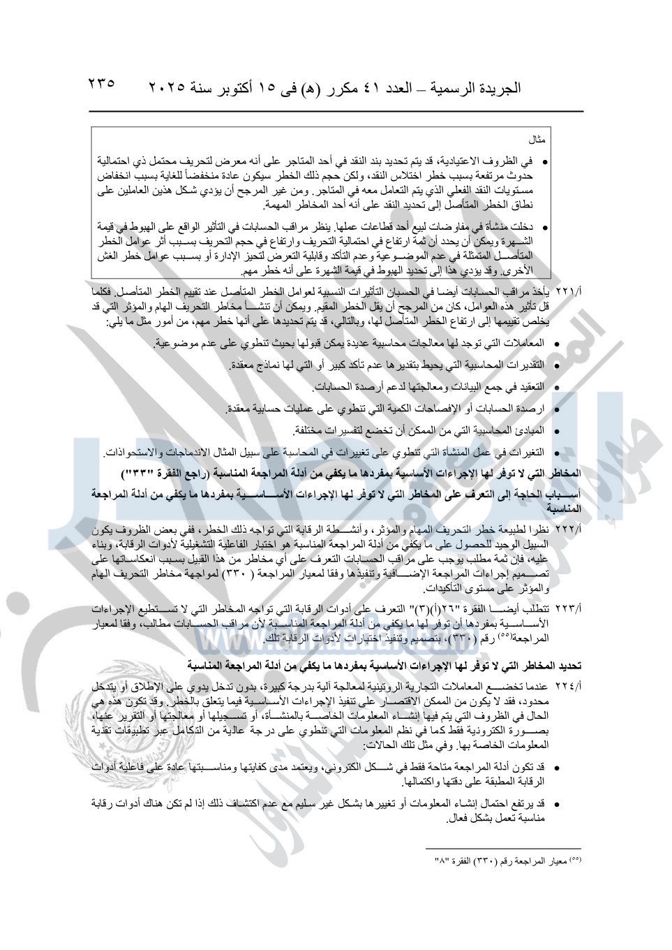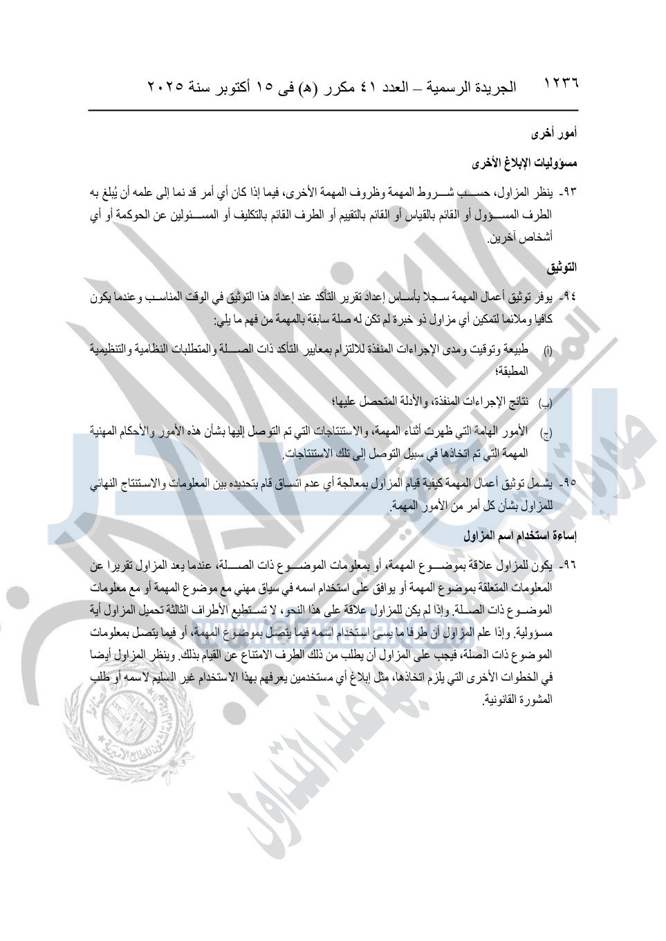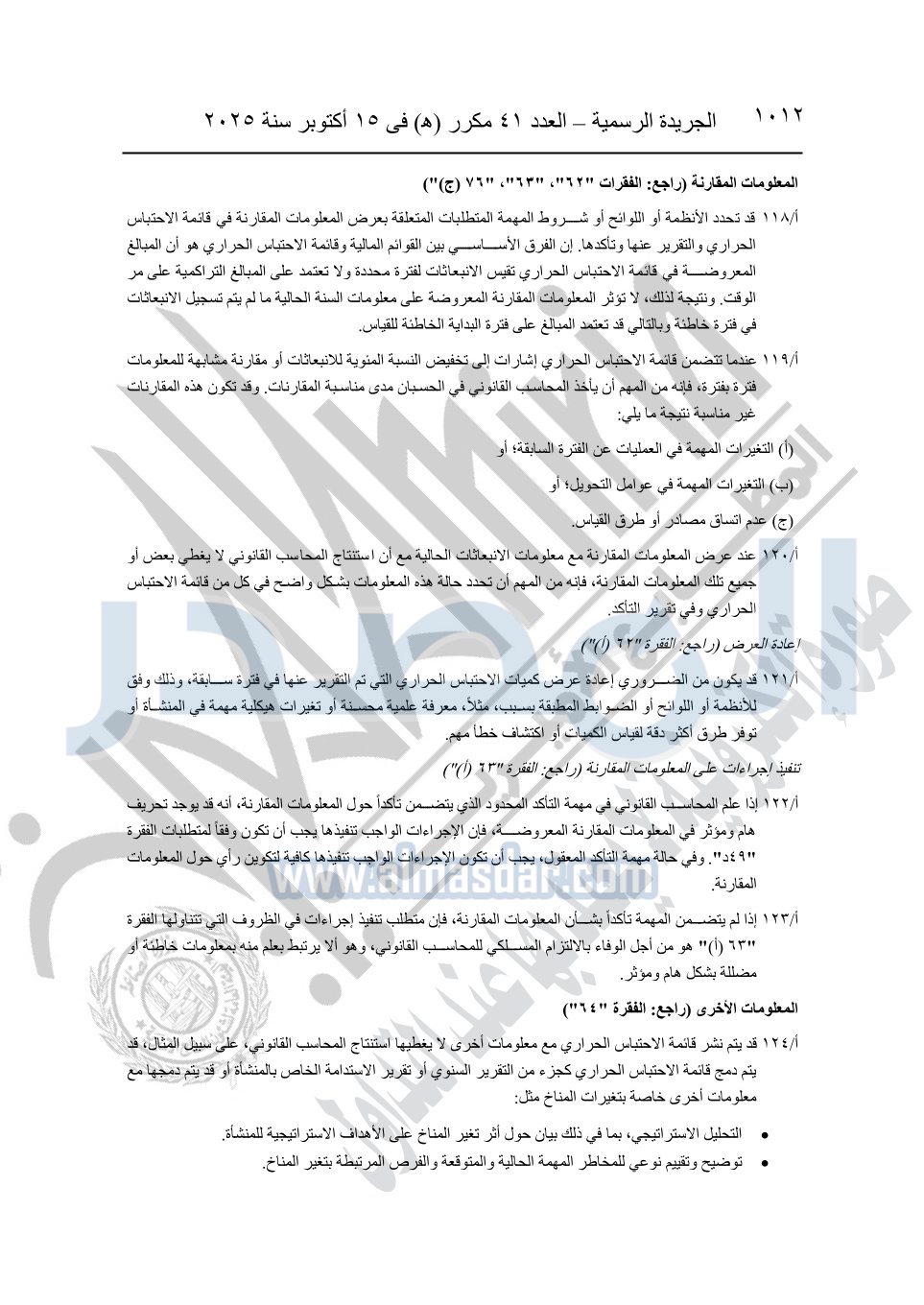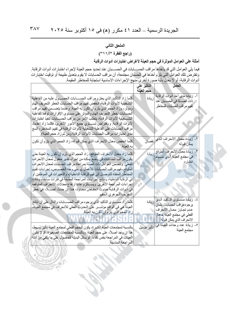 نشرت الجريدة الرسمية في العدد 41 مكرر "هـ" الصادر في 15 أكتوبر سنة 2025، قرار رئيس مجلس الوزراء رقم 3725 لسنة 2025، بشأن العمل بالمعايير المصرية للمراجعة والفحص المحدود ومهام التأكد الأخرى المرافقة لهذا القرار.