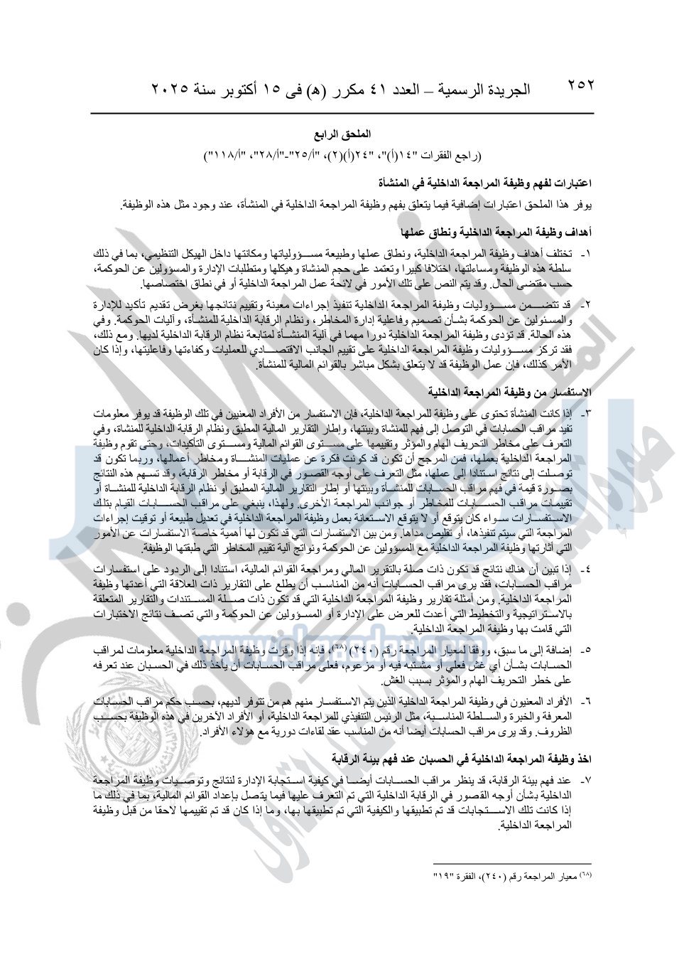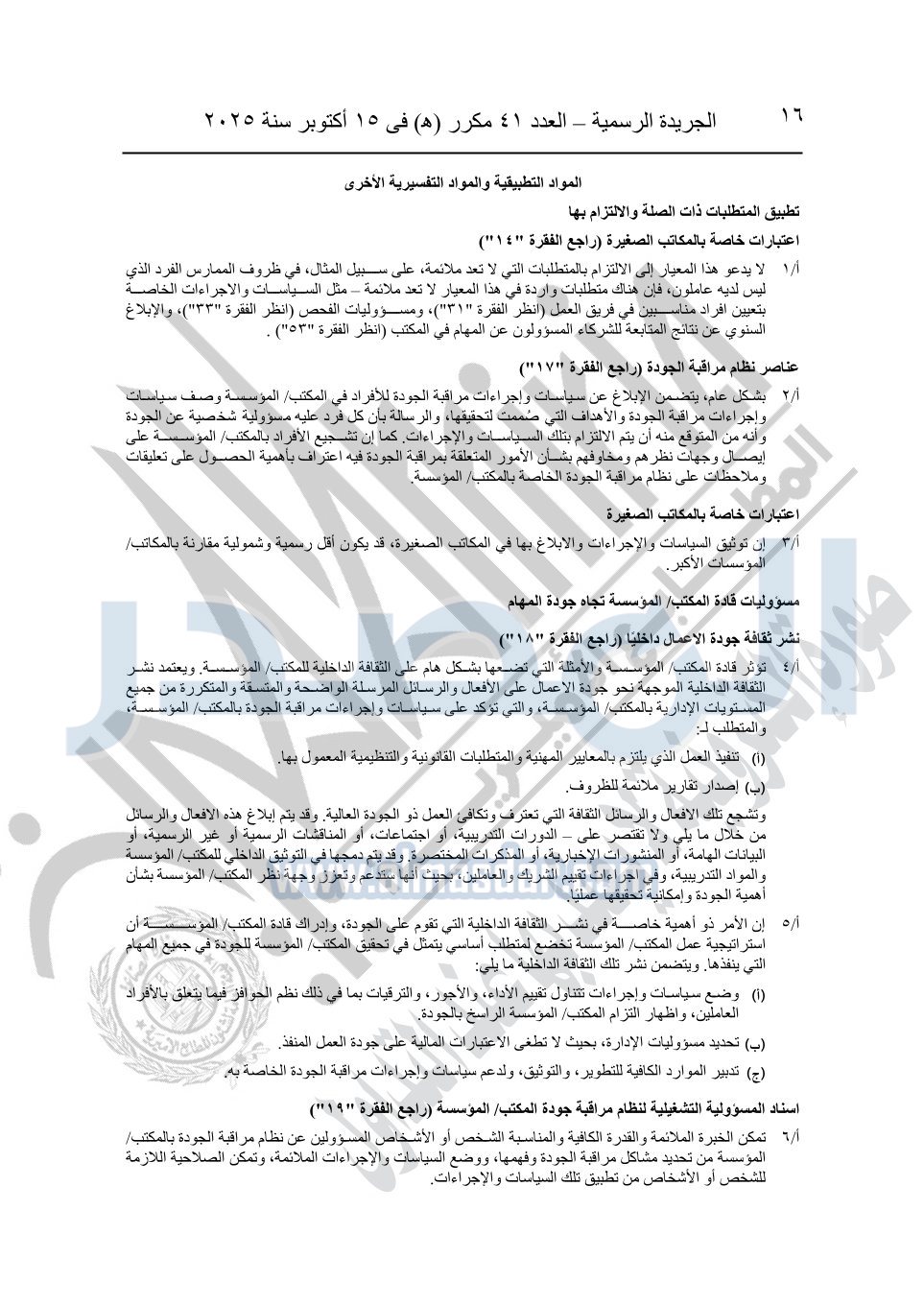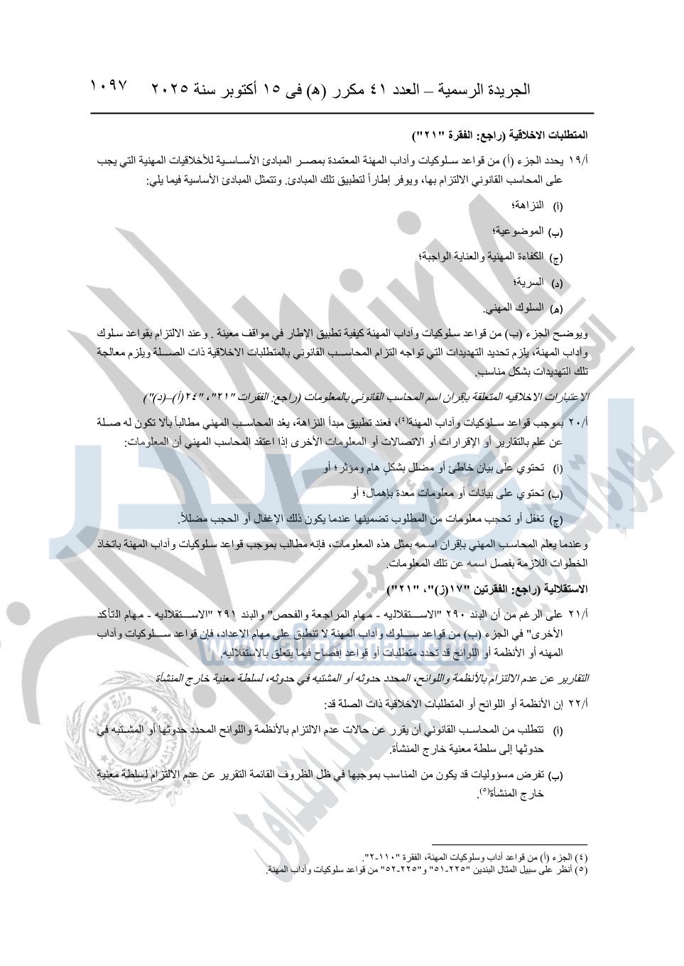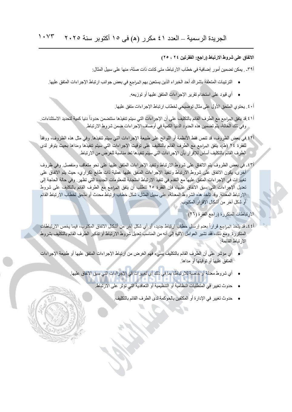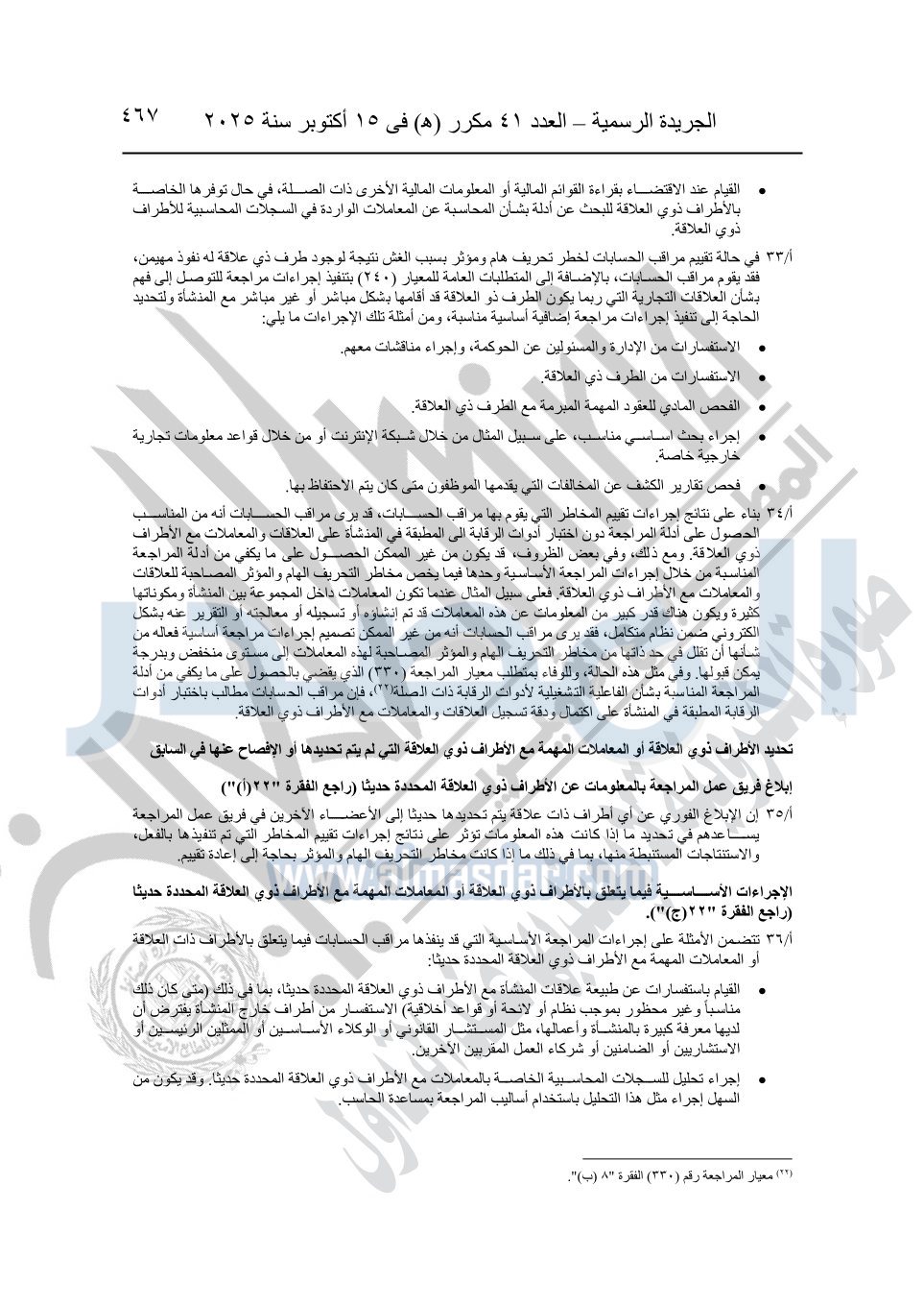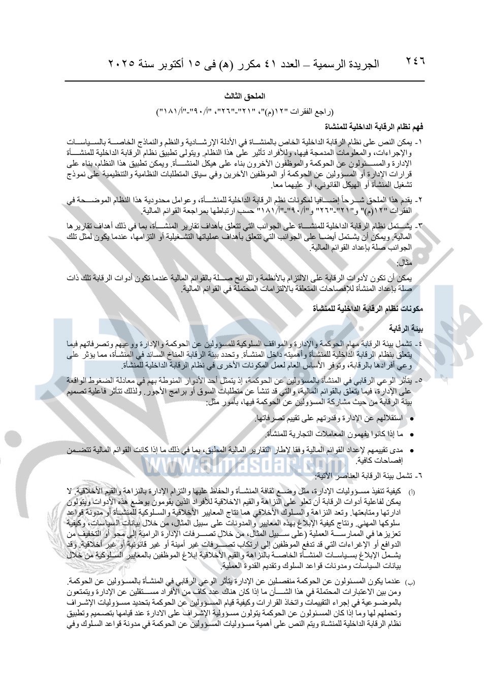 نشرت الجريدة الرسمية في العدد 41 مكرر "هـ" الصادر في 15 أكتوبر سنة 2025، قرار رئيس مجلس الوزراء رقم 3725 لسنة 2025، بشأن العمل بالمعايير المصرية للمراجعة والفحص المحدود ومهام التأكد الأخرى المرافقة لهذا القرار.