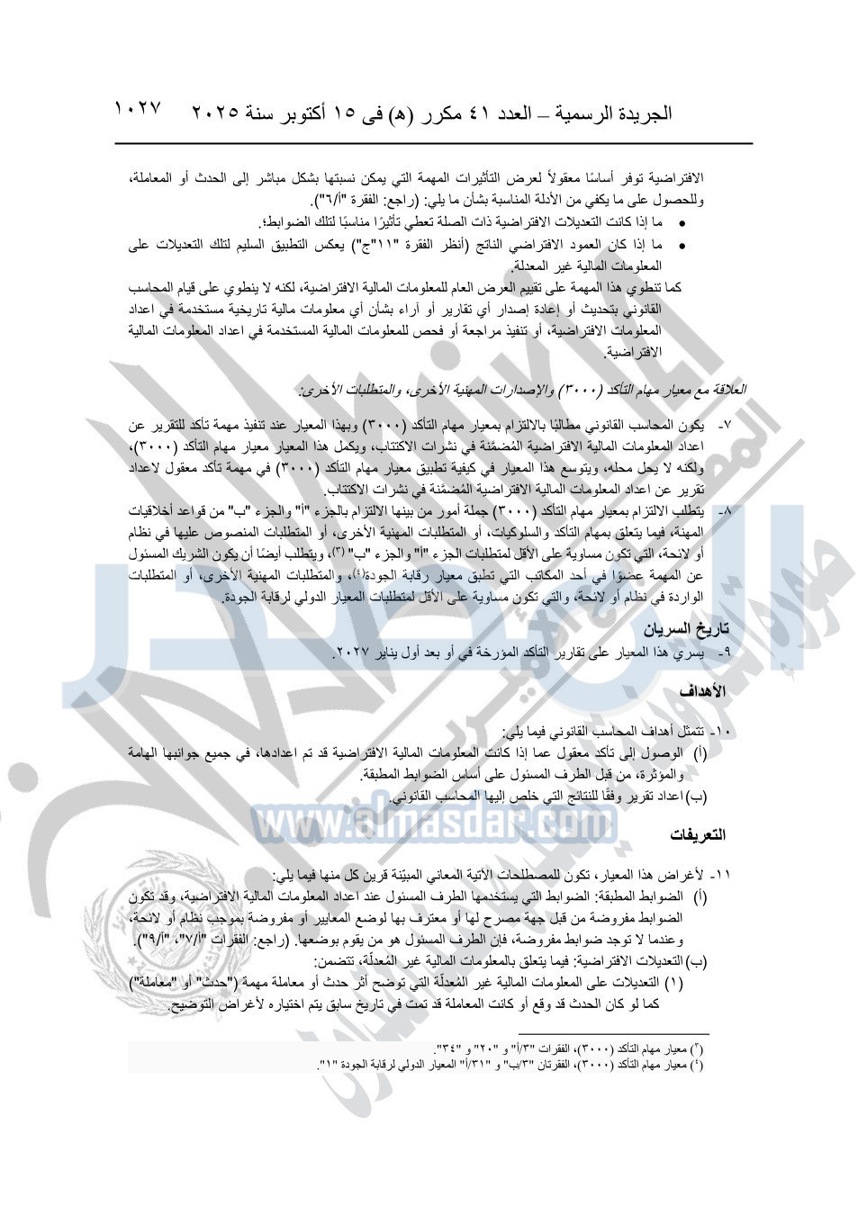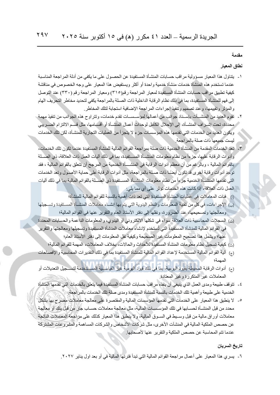 يعمل بالمعايير المصرية للمراجعة والفحص المحدود ومهام التأكد الأخرى المرافقة لهذا القرار لدى مراجعة أو فحص القوائم المالية التي تبدأ السنة المالية لها في / أو / بعد أول يناير 2027 وتسري المعايير الدولية فيما لم يرد بشأنه نص في المعايير المصرية.
