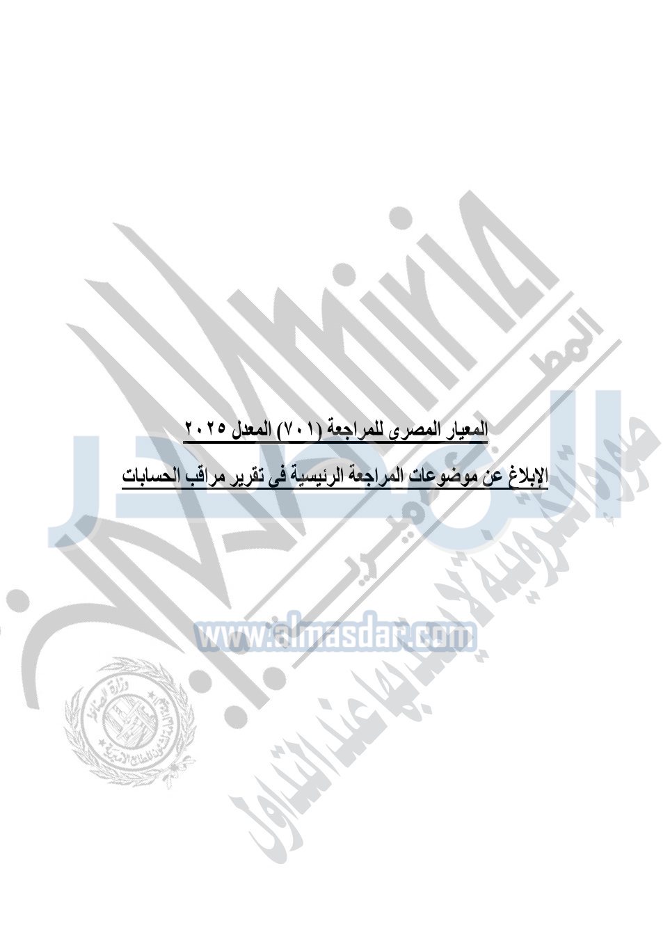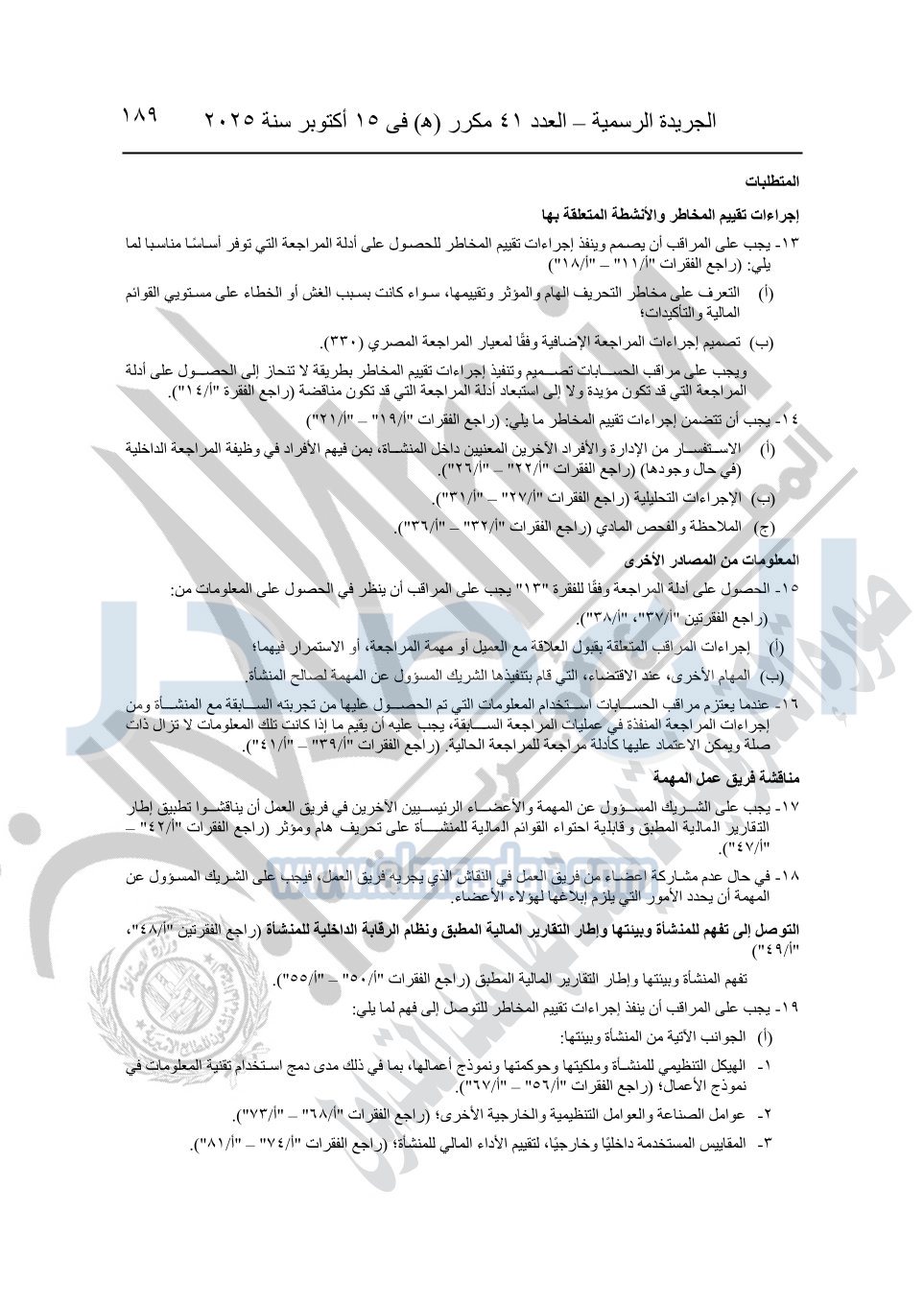وعلى قرار وزير الاستثمار رقم 166 لسنة 2008 بإصدار المعايير المصرية للمراجعة والفحص المحدود ومهام التأكد الأخرى؛ وعلى موافقة اللجنة الدائمة لمعايير المحاسبة المصرية والمعايير المصرية للمراجعة والفحص المحدود ومهام التأكد الأخرى بجلستها بتاريخ 19-5-2025؛ وبناءً على ما عرضه رئيس مجلس إدارة الهيئة العامة للرقابة المالية.