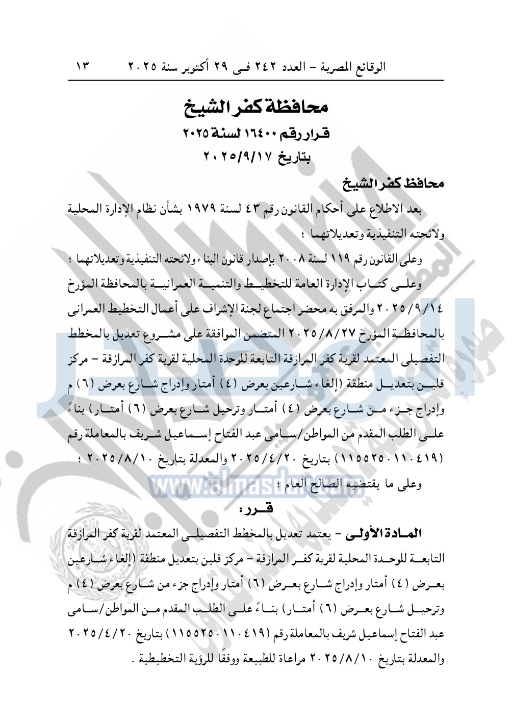 كما نشرت الوقائع المصرية في العدد 242، بتاريخ 29 أكتوبر 2025، قرار محافظة كفر الشيخ، رقم 16400 لسنة 2025، بتاريخ 17-9-2025، بشأن اعتماد تعديل بالمخطط التفصيلي المعتمد لقرية كفر المرازقة.
