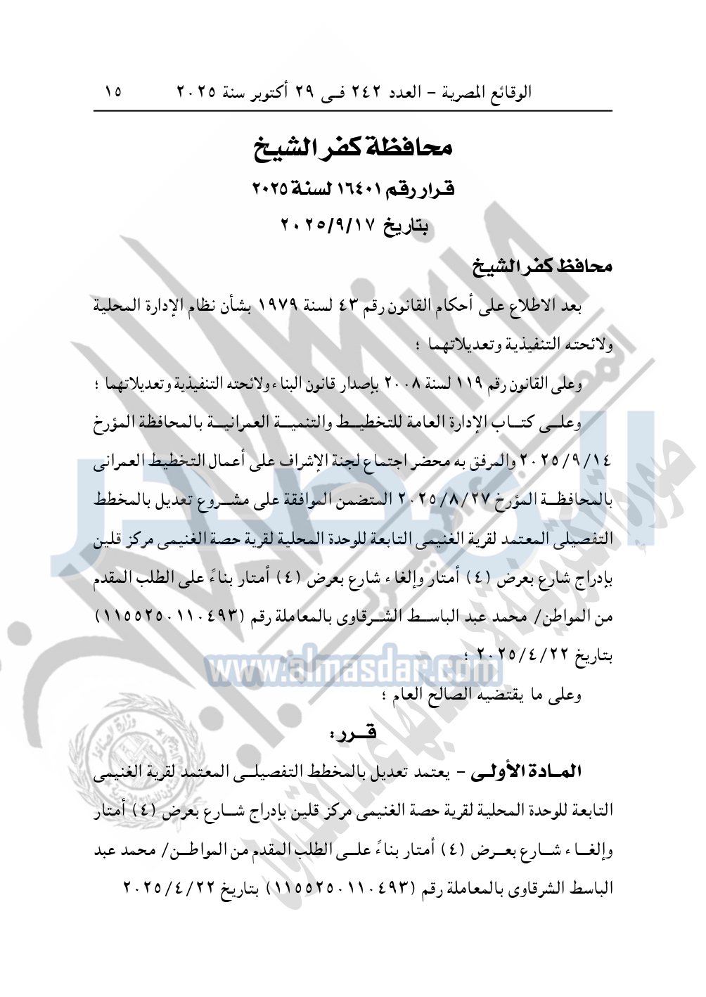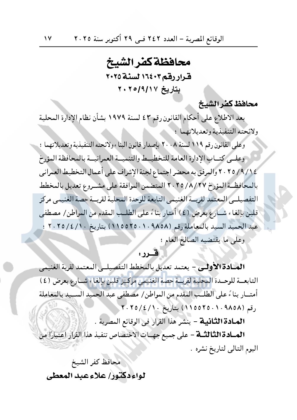 وأيضا نشرت الوقائع المصرية في العدد 242، بتاريخ 29 أكتوبر 2025، قرار محافظة كفر الشيخ، رقم 16401 لسنة 2025، بتاريخ 17-9-2025، بشأن اعتماد تعديل بالمخطط التفصيلي المعتمد لقرية الغنيمي.