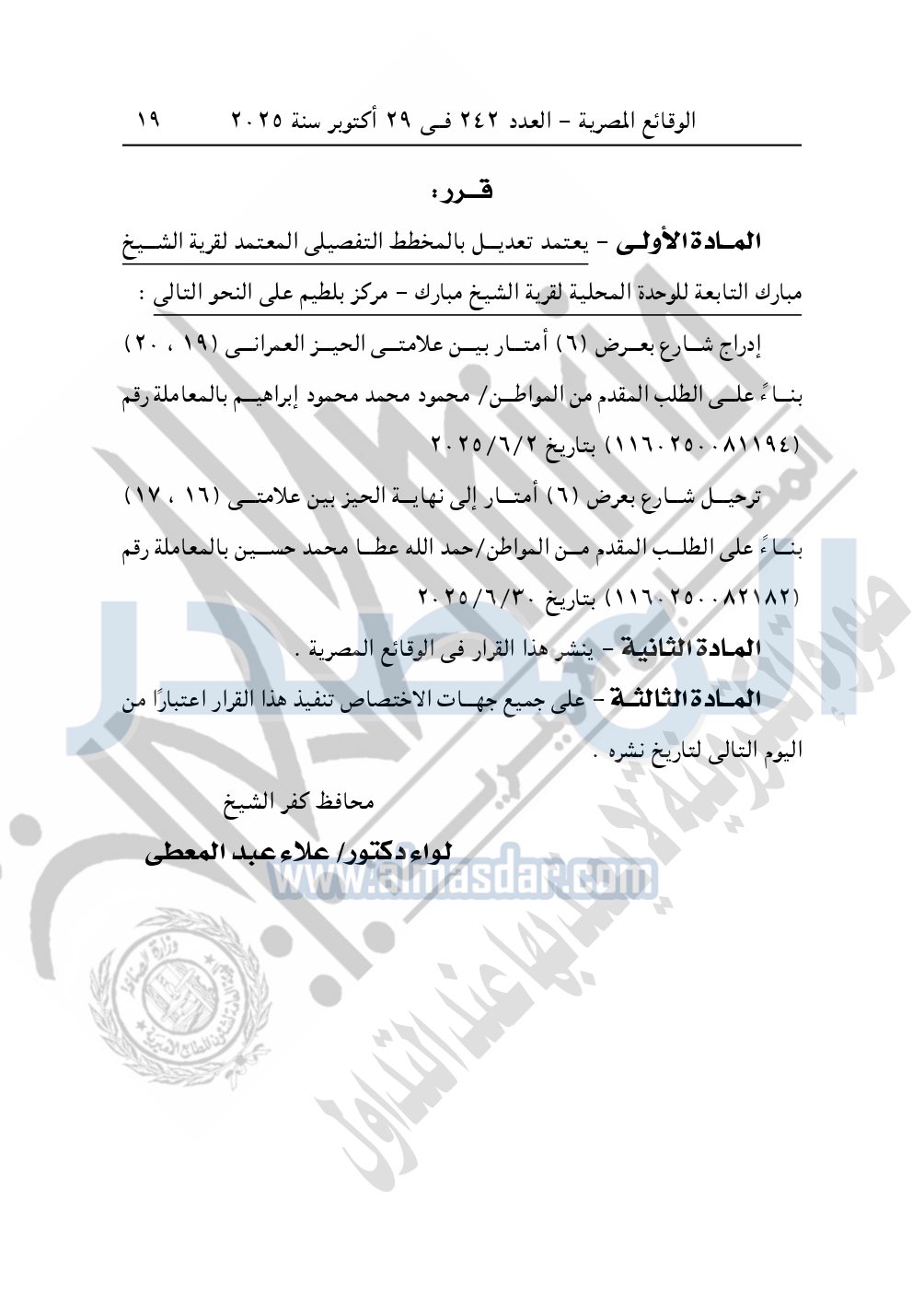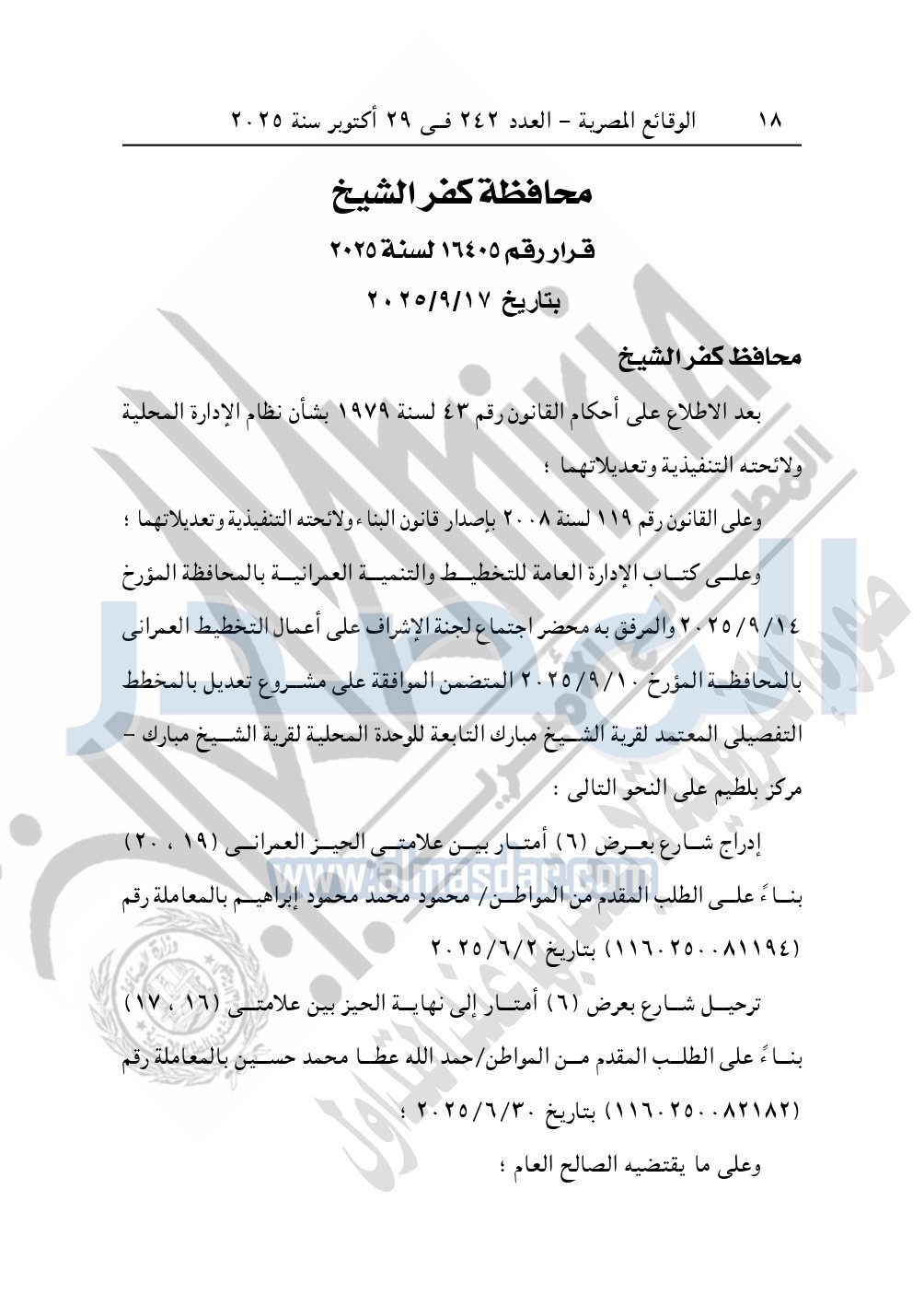 كما نشرت الوقائع المصرية في العدد 242، بتاريخ 29 أكتوبر 2025، قرار محافظة كفر الشيخ، رقم 16405 لسنة 2025، بتاريخ 17-9-2025، بشأن اعتماد تعديل بالمخطط التفصيلي المعتمد لقرية الشيخ مبارك.