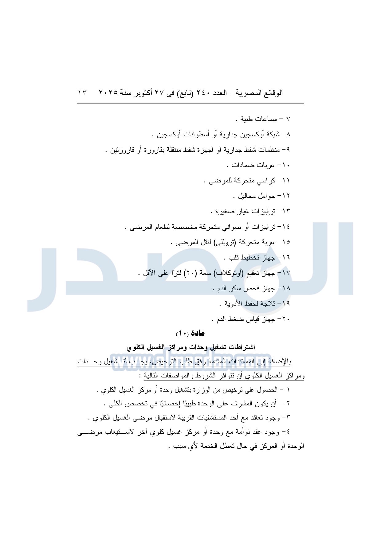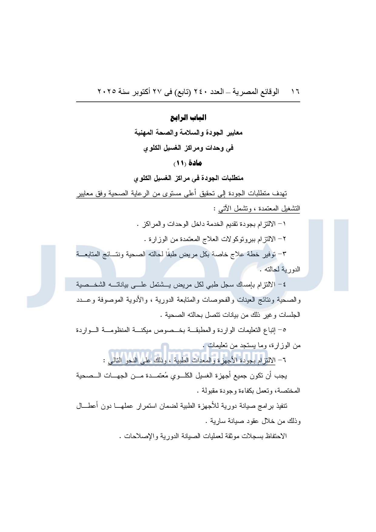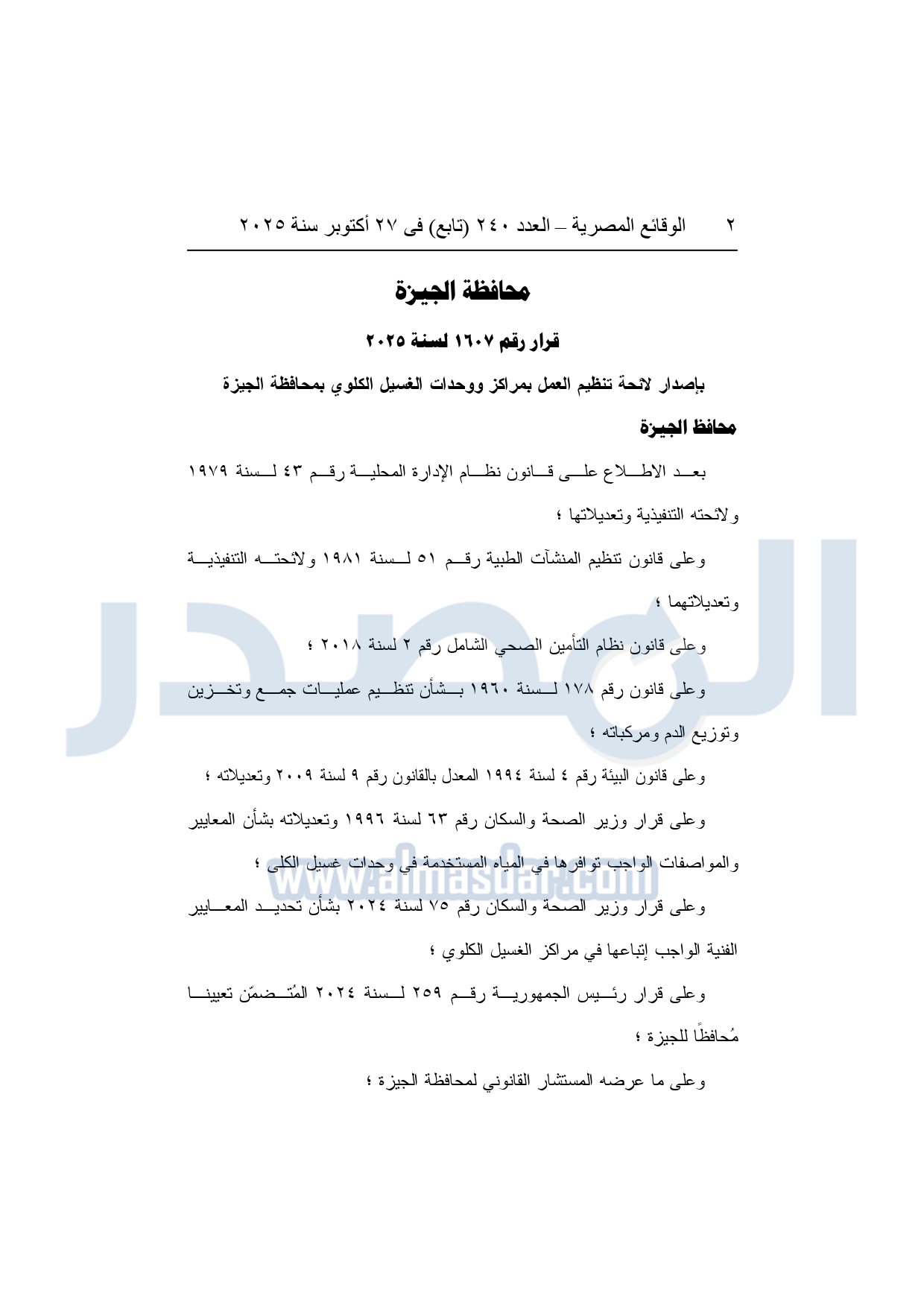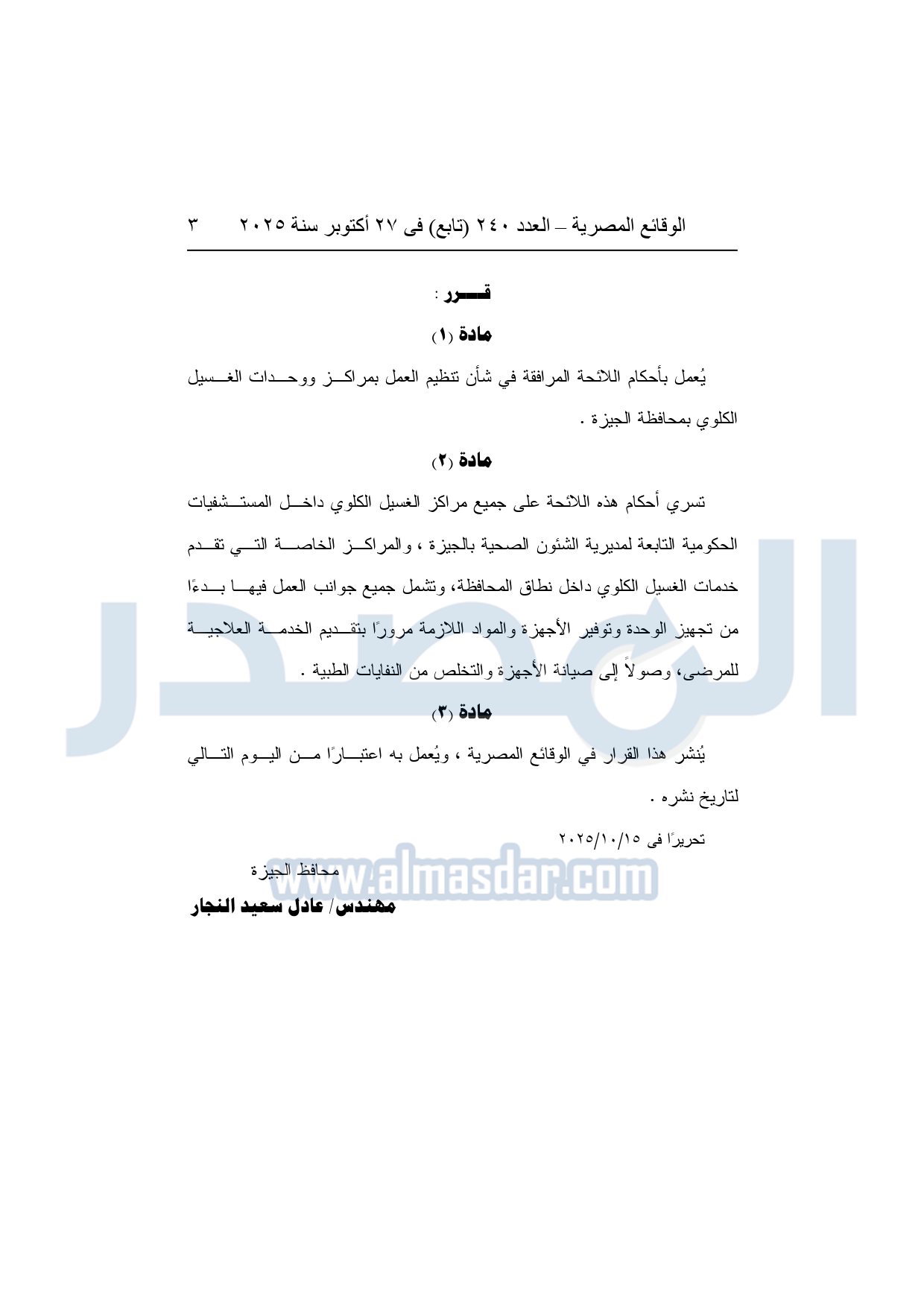 نشرت الوقائع المصرية في العدد 240 "تابع"، بتاريخ 27 أكتوبر 2025، قرار محافظة الجيزة، رقم 1607 لسنة 2025، بشأن العمل بأحكام اللائحة المرافقة في شأن تنظيم العمل بمراكز ووحدات الغسيل الكلوي بمحافظة الجيزة.