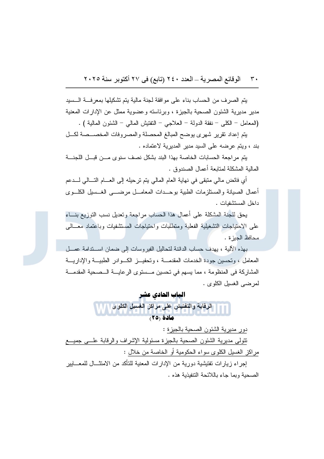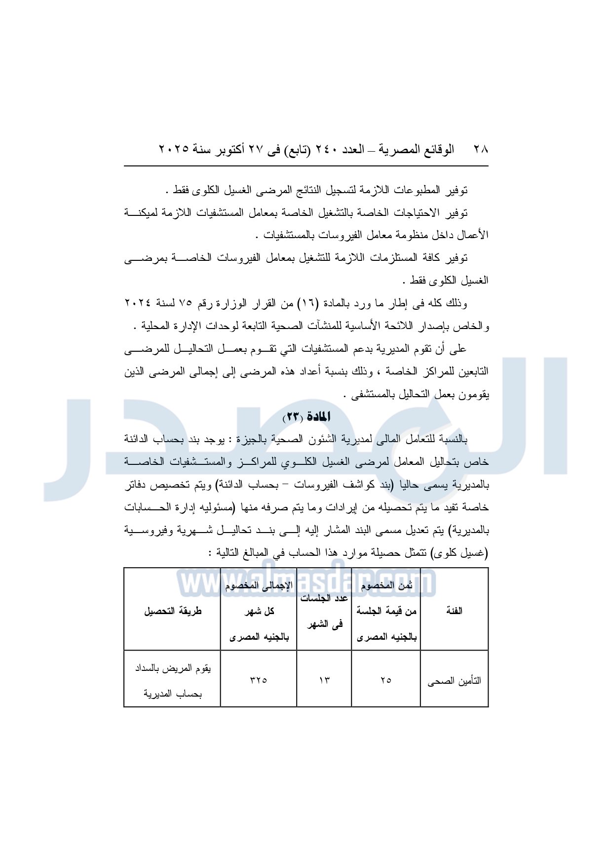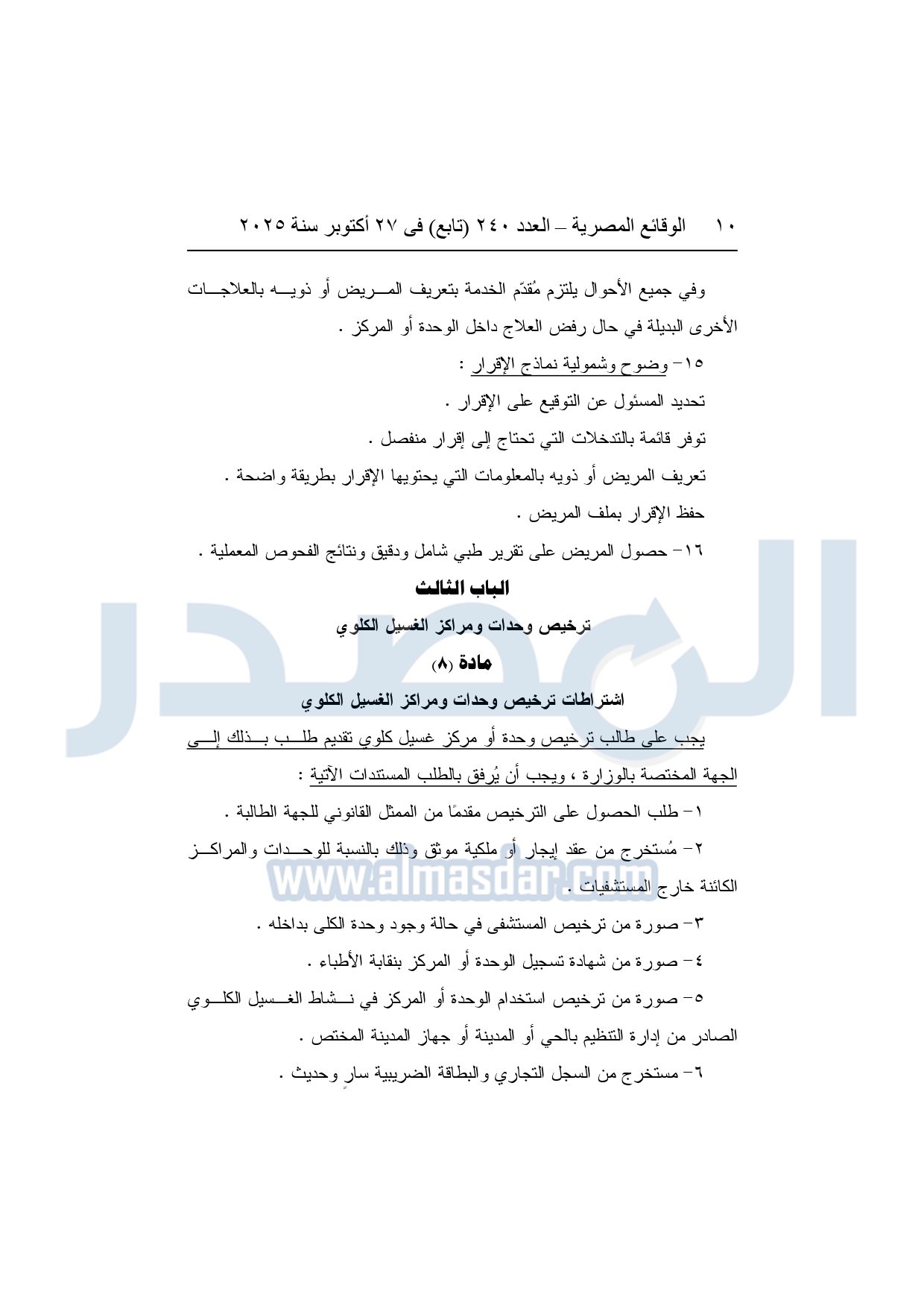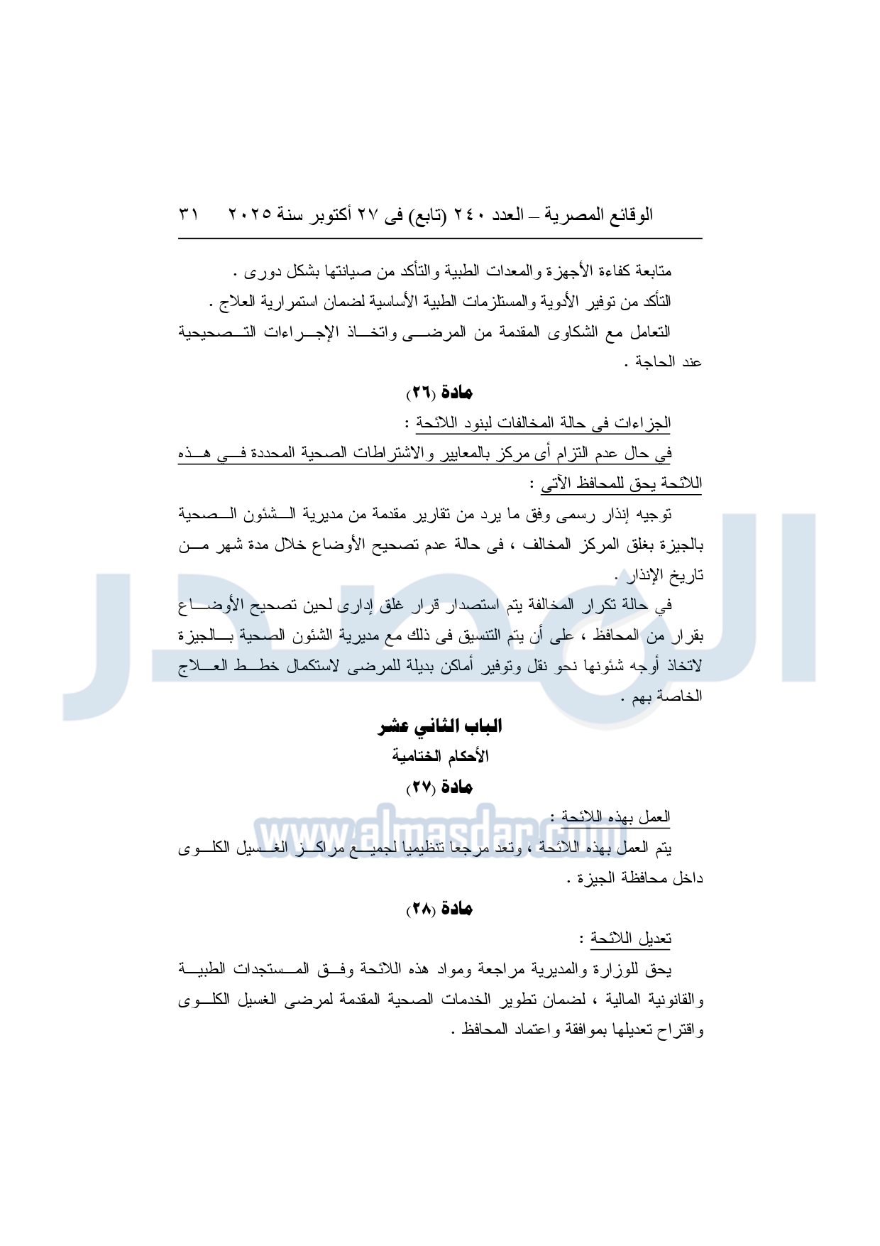 نشرت الوقائع المصرية في العدد 240 "تابع"، بتاريخ 27 أكتوبر 2025، قرار محافظة الجيزة، رقم 1607 لسنة 2025، بشأن العمل بأحكام اللائحة المرافقة في شأن تنظيم العمل بمراكز ووحدات الغسيل الكلوي بمحافظة الجيزة.