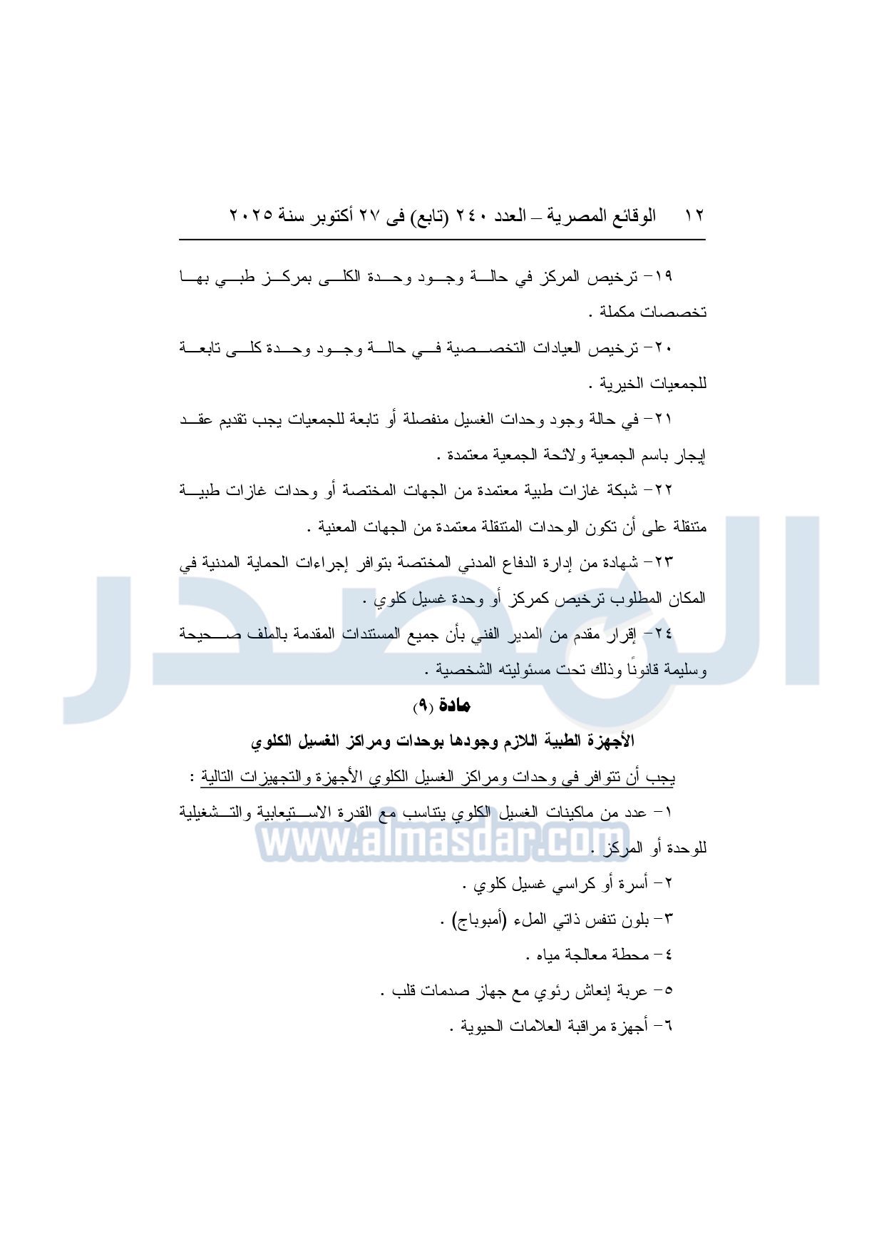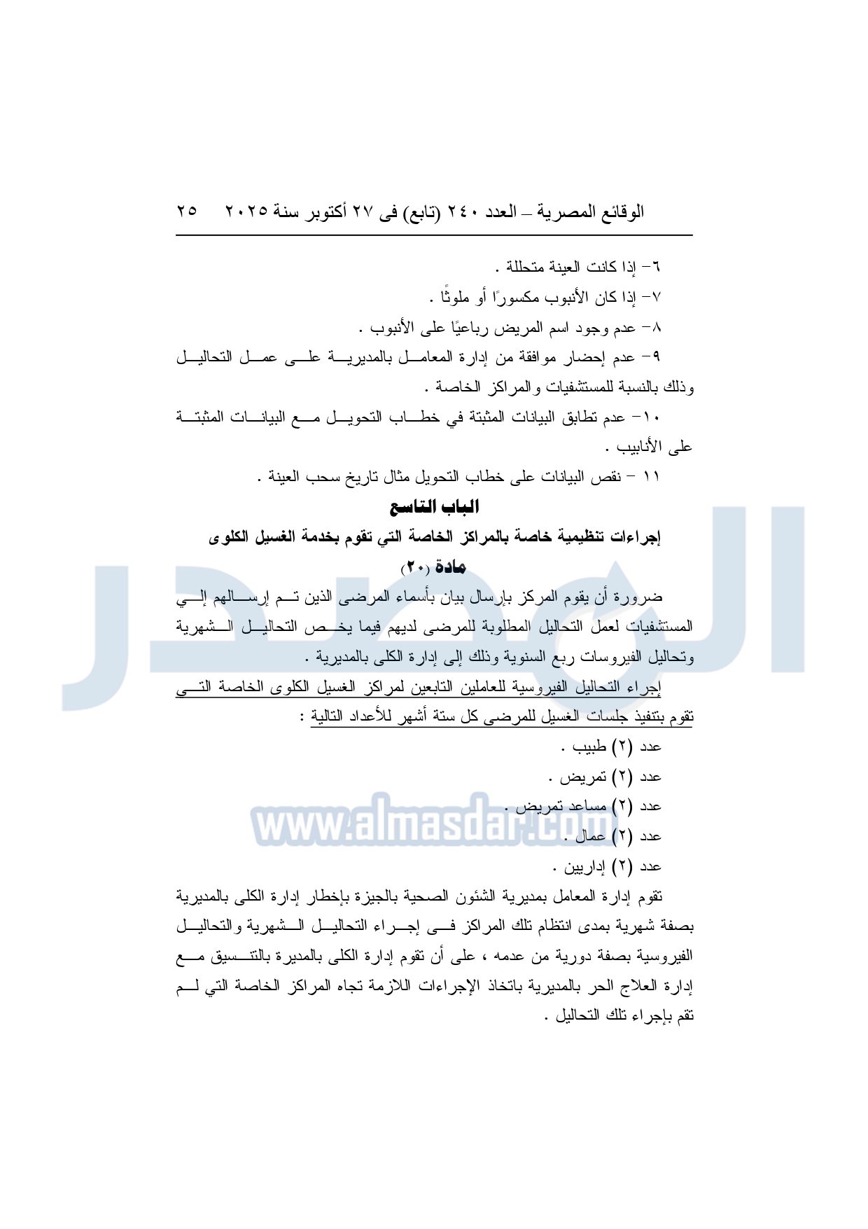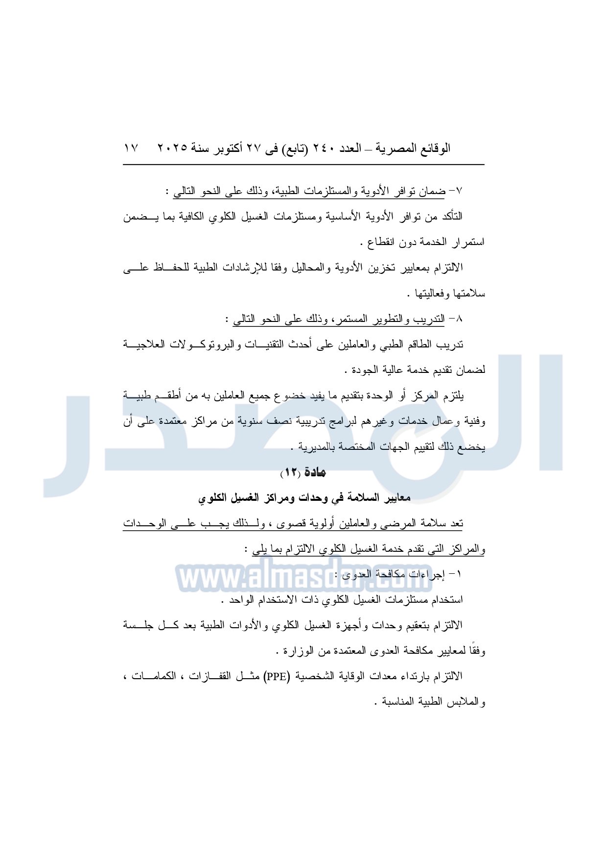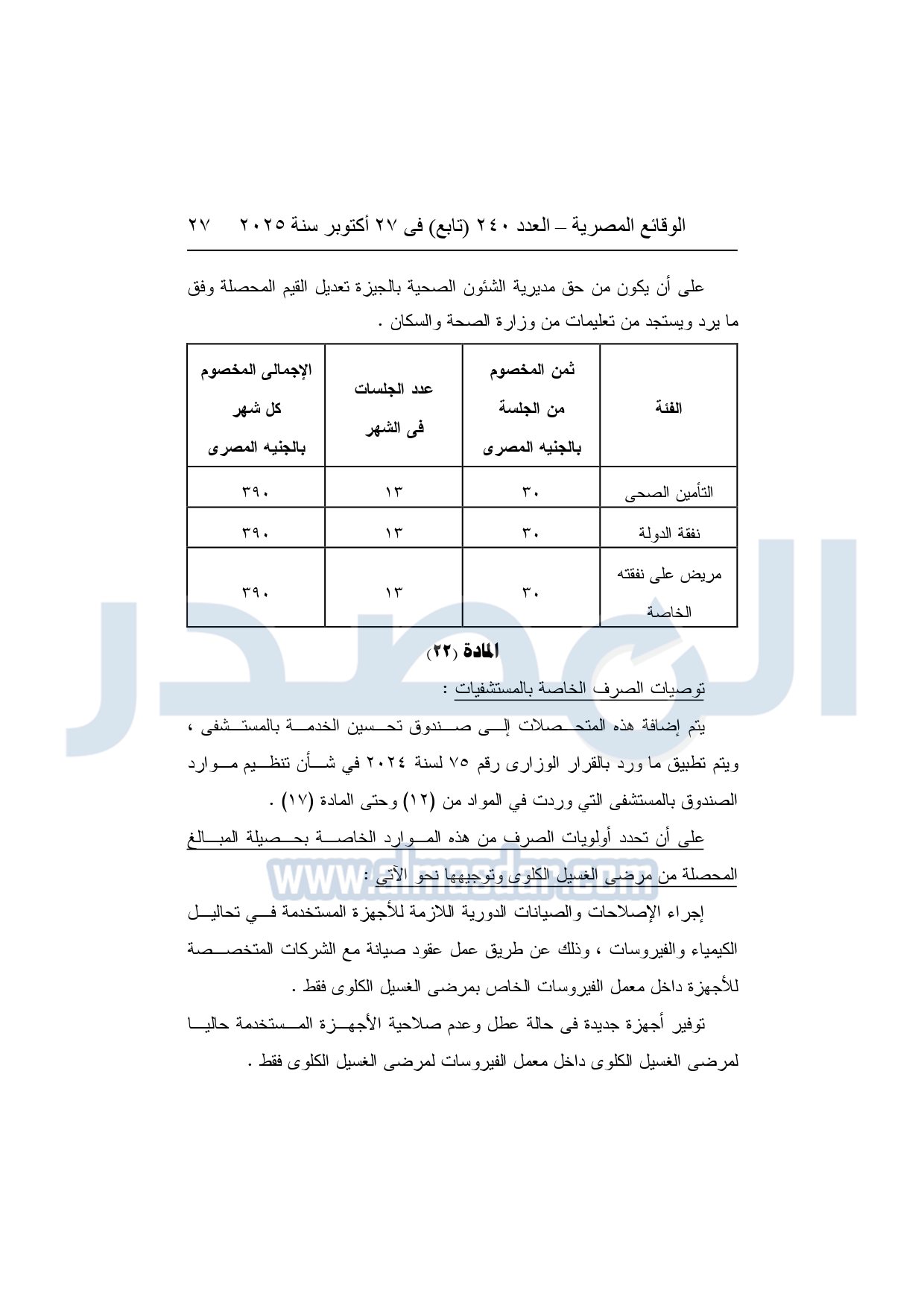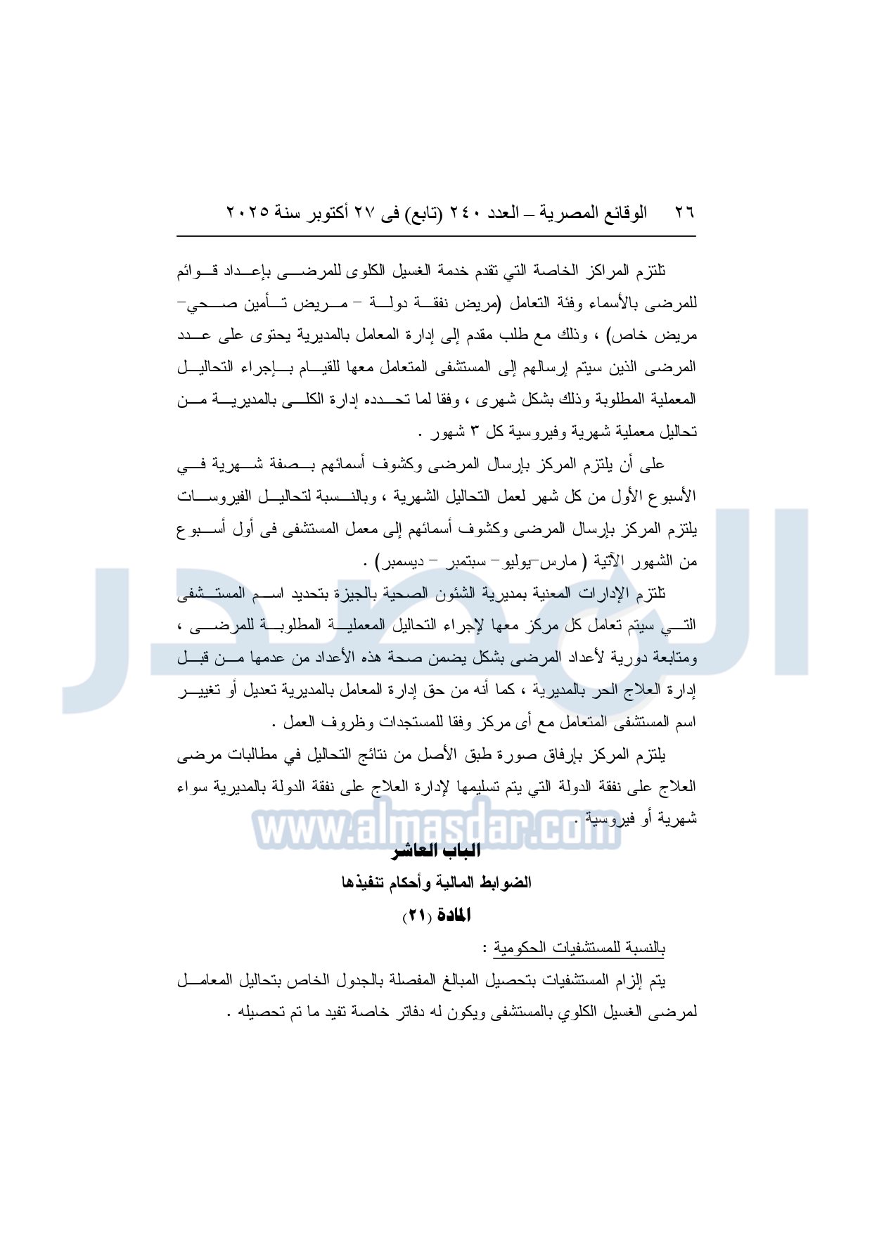 نشرت الوقائع المصرية في العدد 240 "تابع"، بتاريخ 27 أكتوبر 2025، قرار محافظة الجيزة، رقم 1607 لسنة 2025، بشأن العمل بأحكام اللائحة المرافقة في شأن تنظيم العمل بمراكز ووحدات الغسيل الكلوي بمحافظة الجيزة.