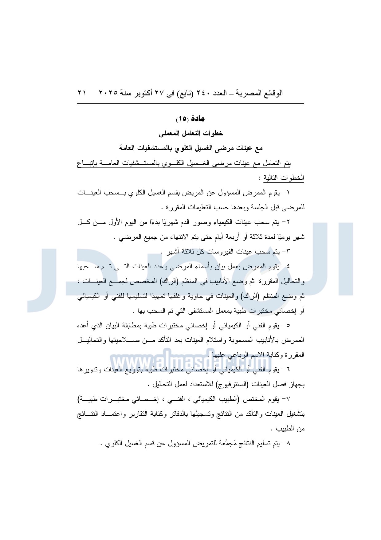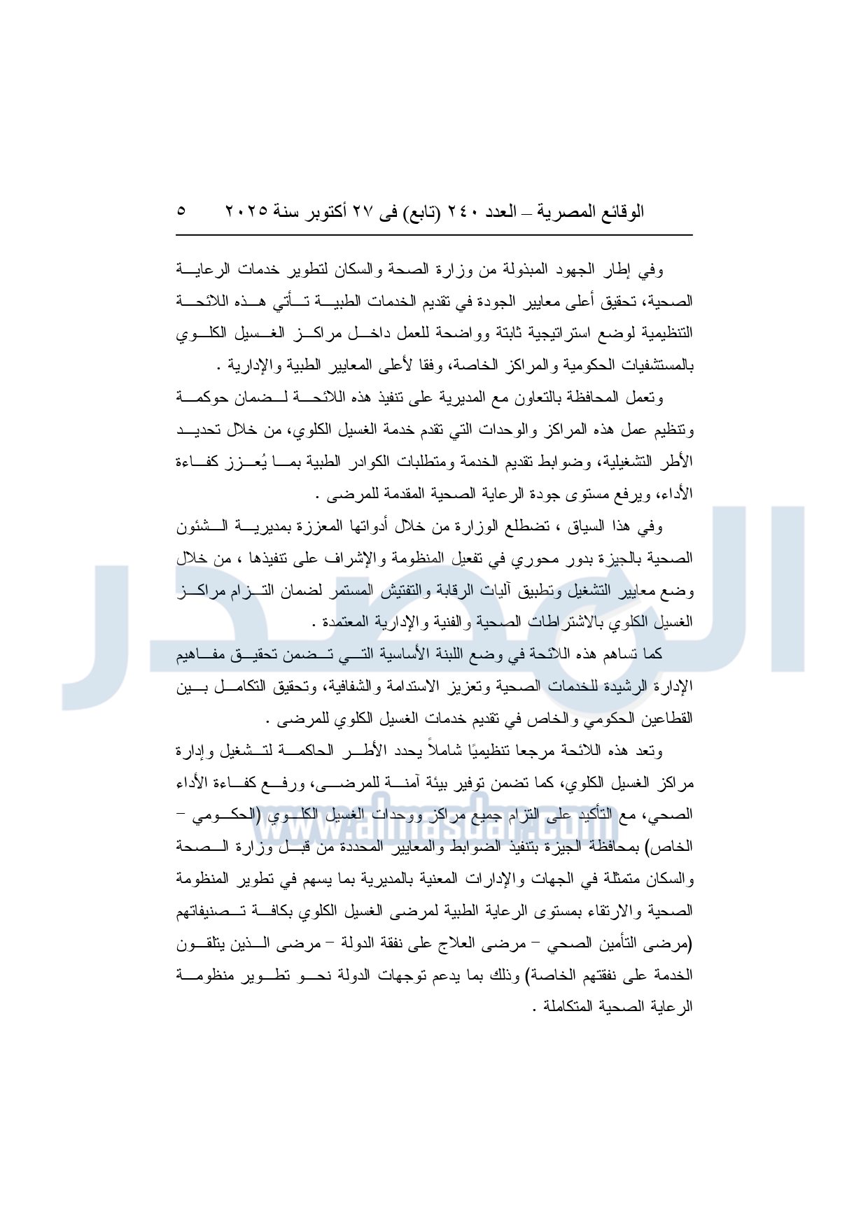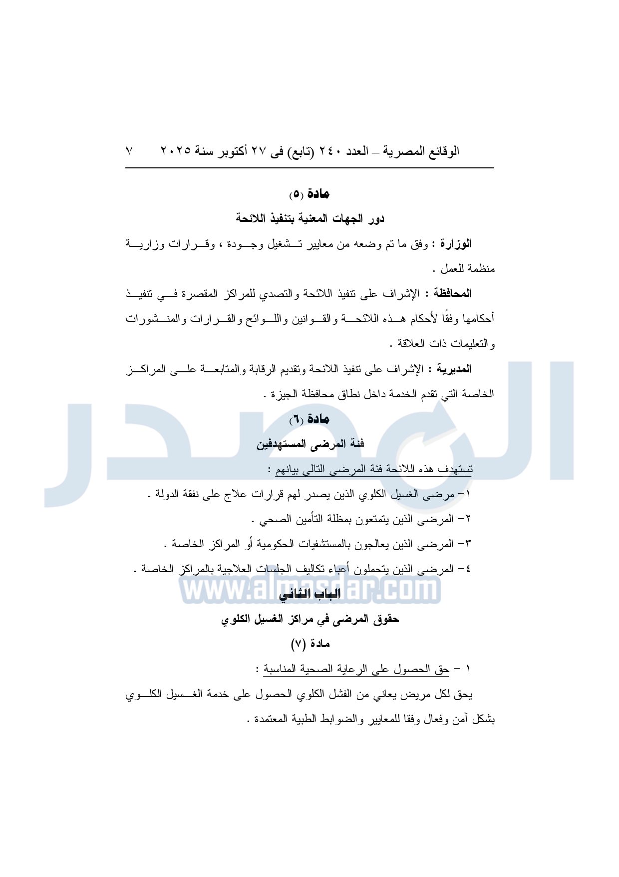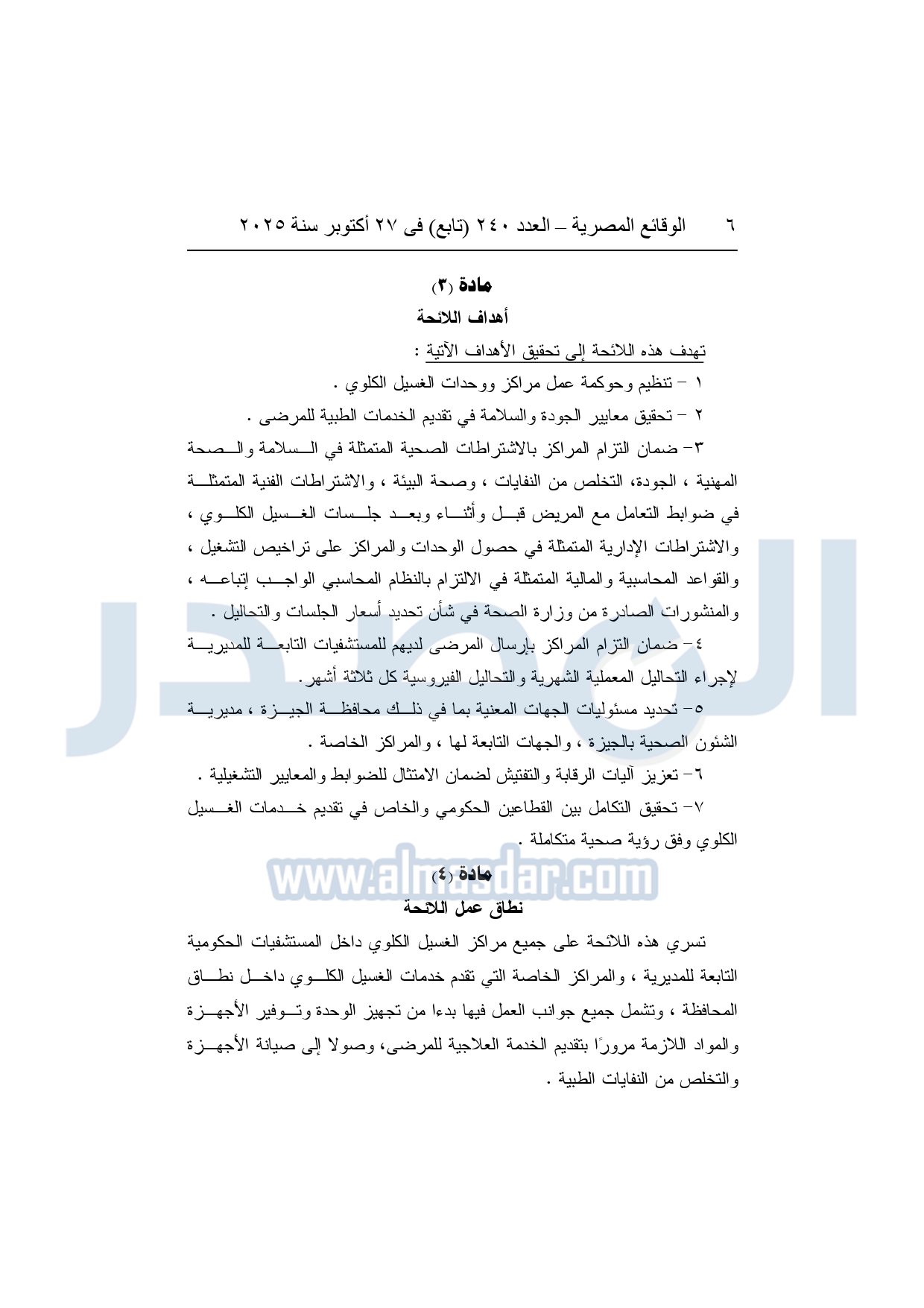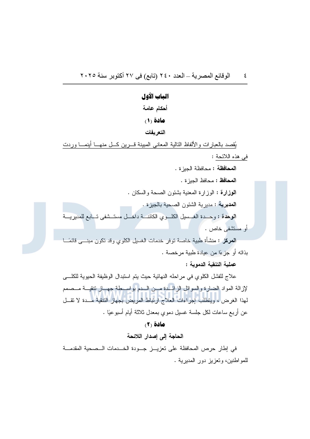 إصدار لائحة تنظيم العمل بمراكز ووحدات الغسيل الكلوي في محافظة الجيزة