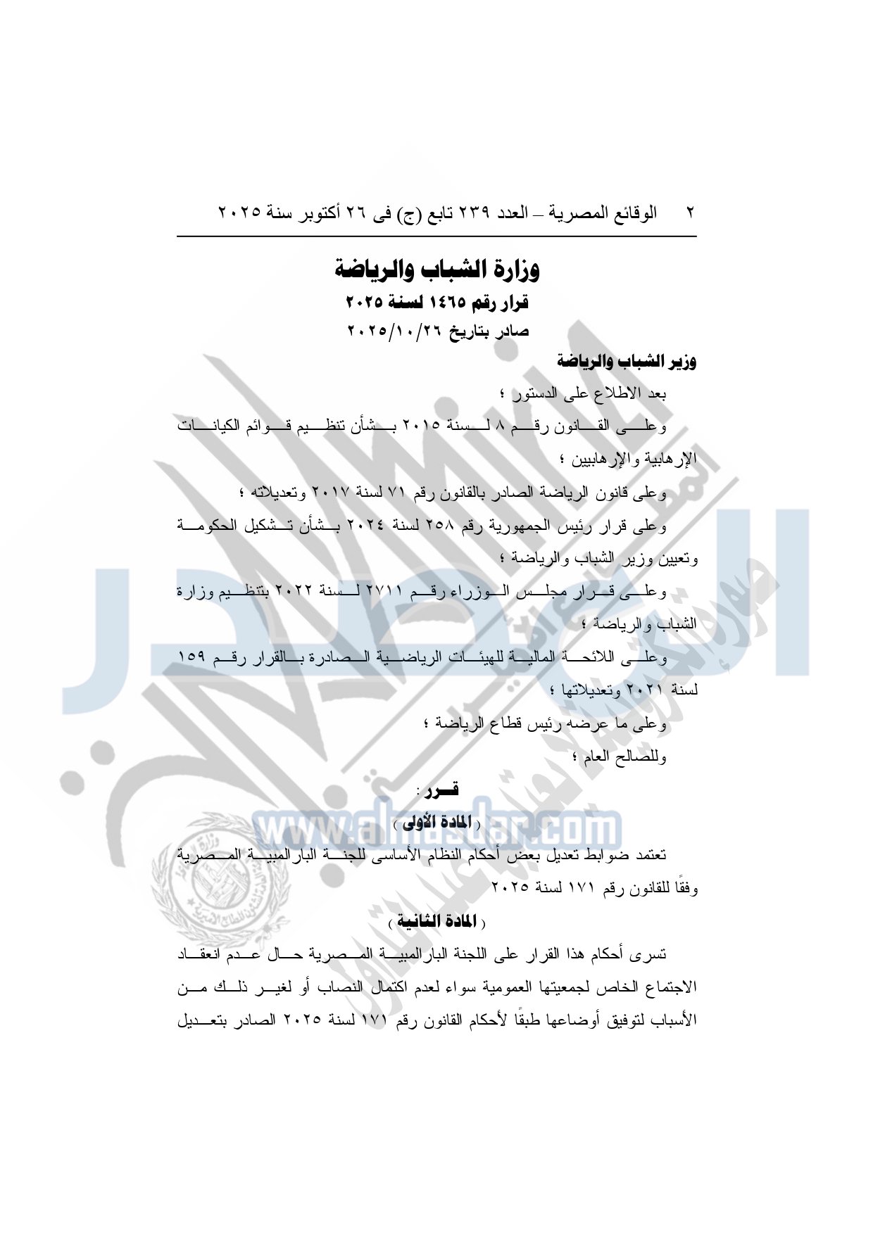 وعلى قرار رئيس الجمهورية رقم 258 لسنة 2024 بشأن تشكيل الحكومة وتعيين وزير الشباب والرياضة؛ وعلى قرار مجلس الوزراء رقم 2711 لسنة 2022 بتنظيم وزارة الشباب والرياضة؛ وعلى اللائحة المالية للهيئات الرياضية الصادرة بالقرار رقم 159 لسنة 2021 وتعديلاتها؛ وعلى ما عرضه رئيس قطاع الرياضة؛ وللصالح العام.