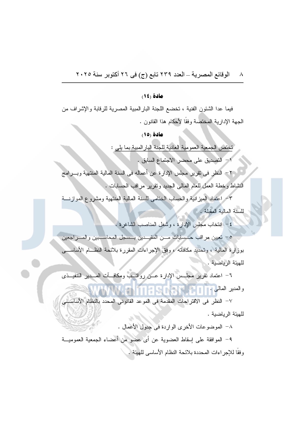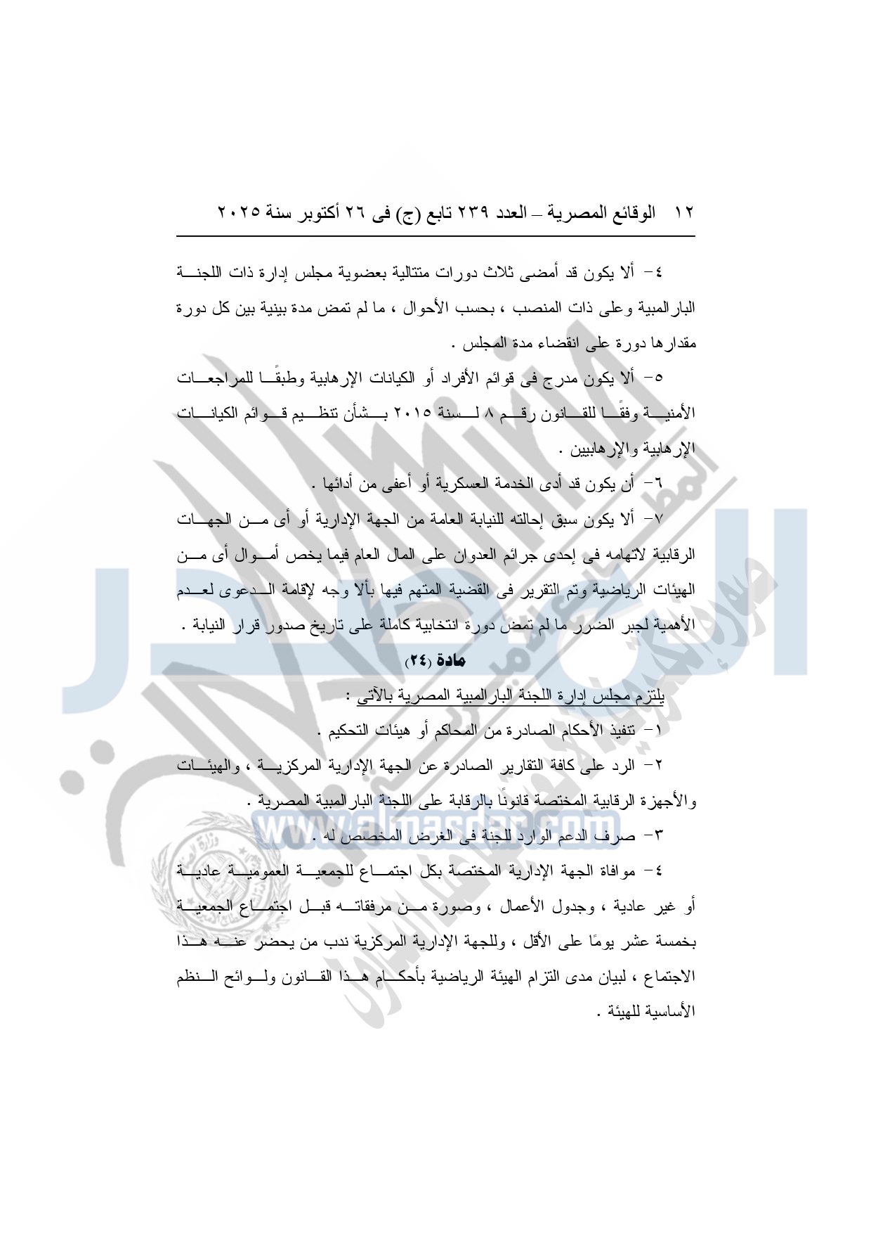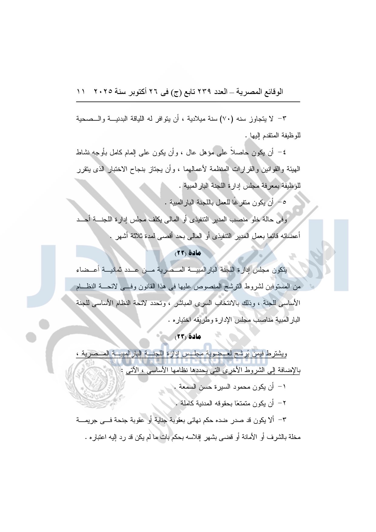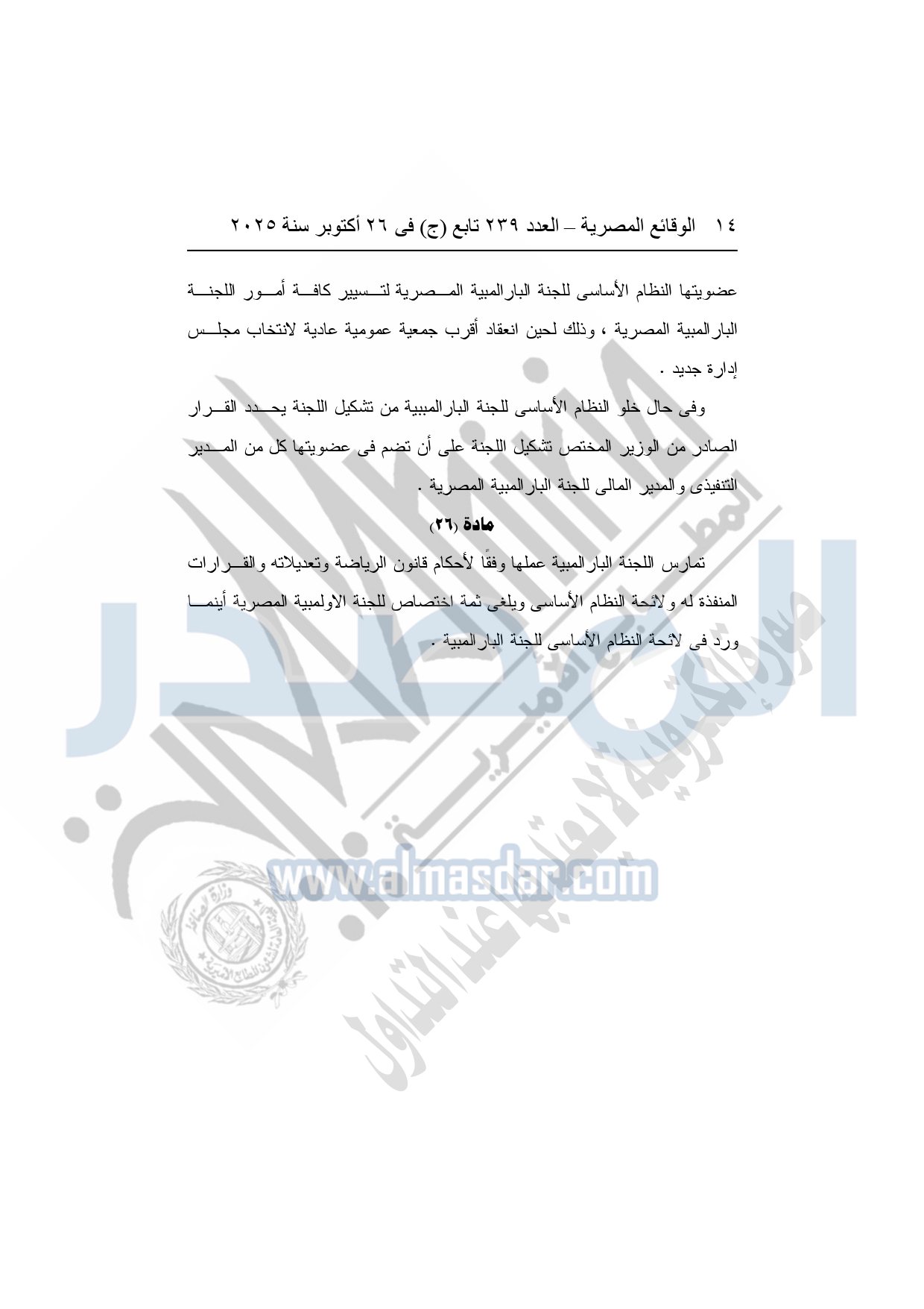 نشرت الوقائع المصرية في العدد 239 تابع "ج" الصادر في 26 أكتوبر سنة 2025، وزارة الشباب والرياضة قرار رقم 1465 لسنة 2025، صادر بتاريخ 26-10-2025، بشأن اعتماد ضوابط تعديل بعض أحكام النظام الأساسي للجنة البارالمبية المصرية.