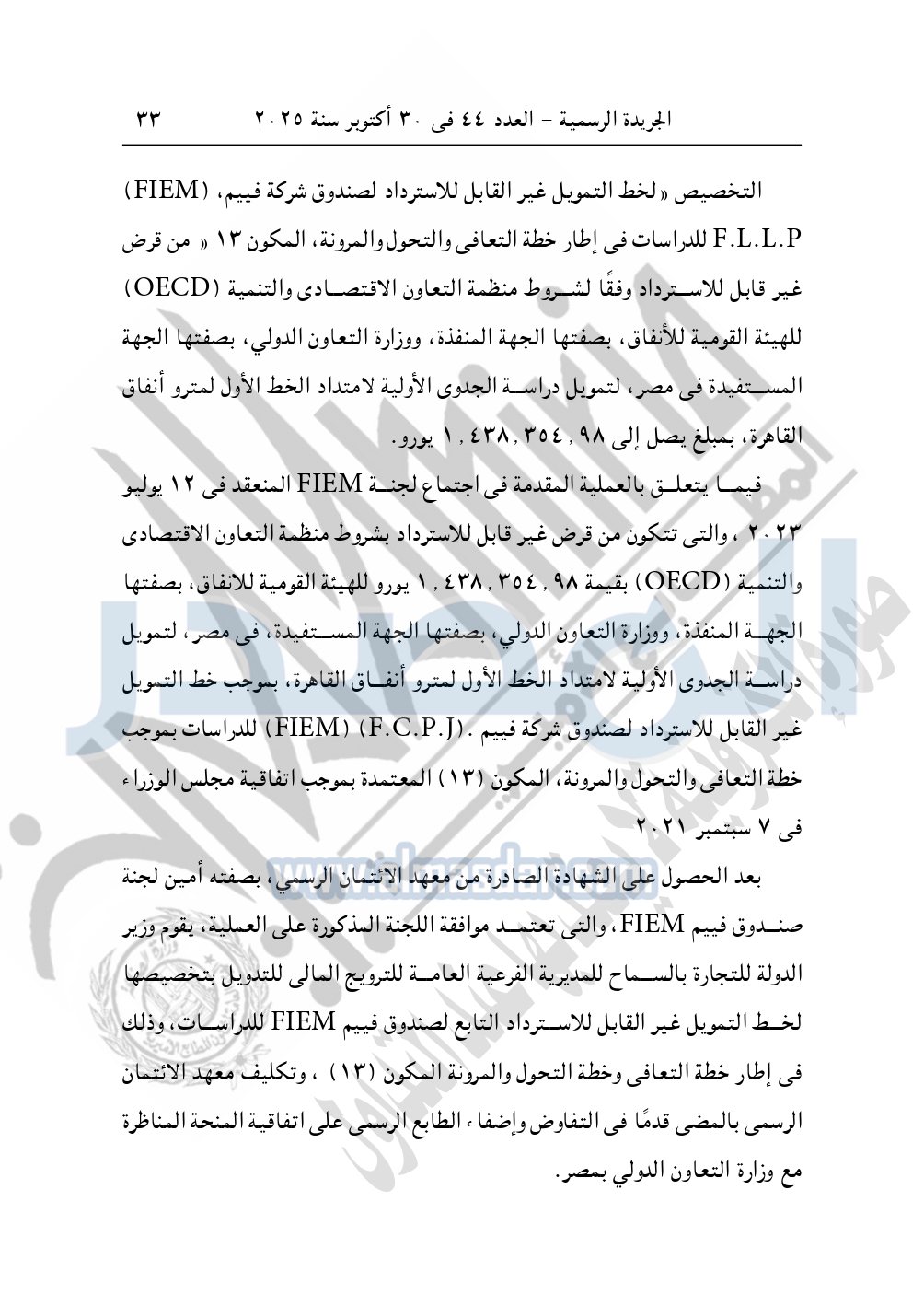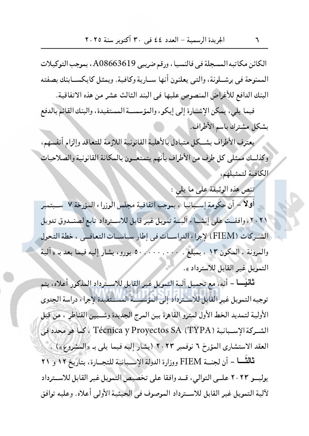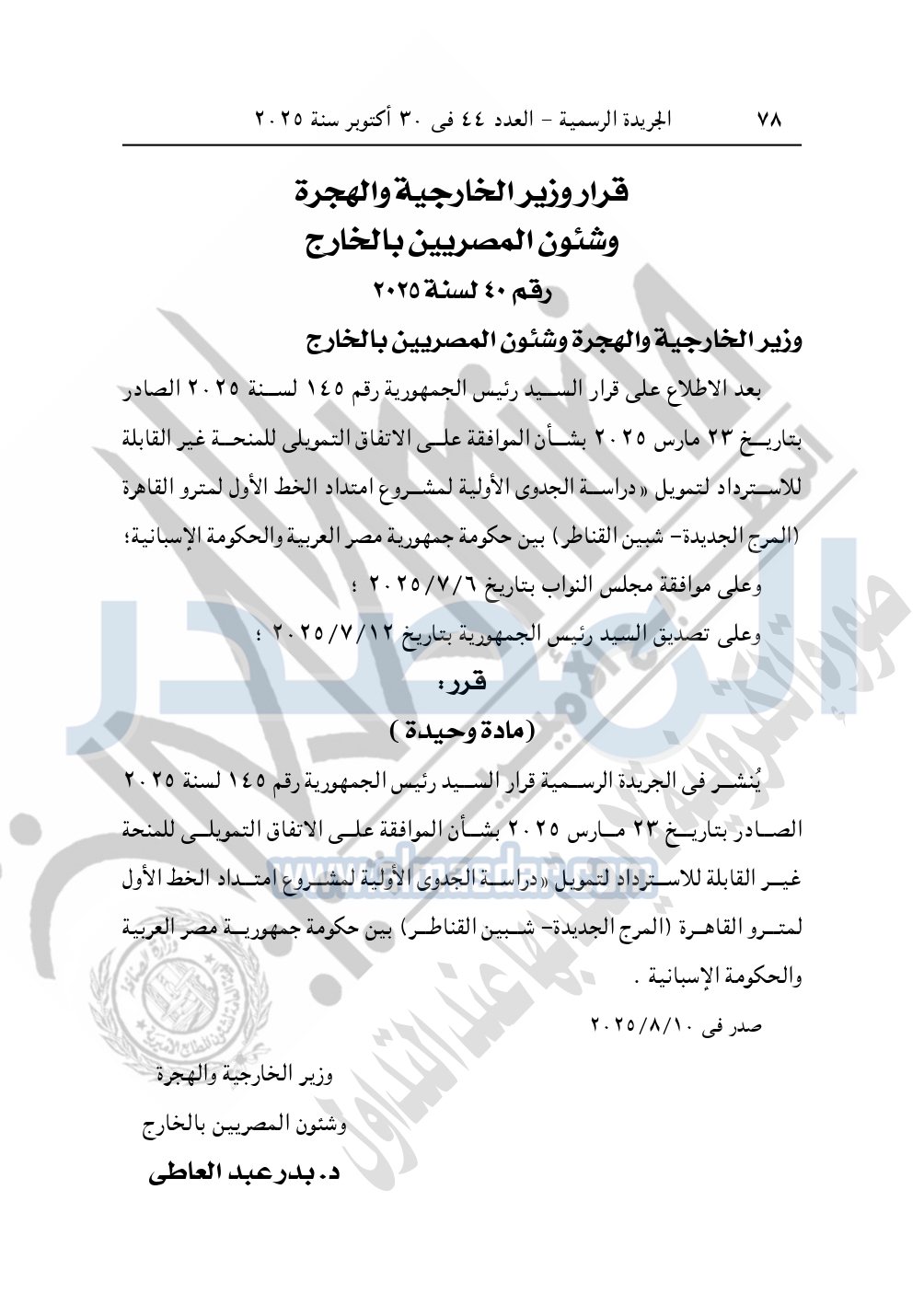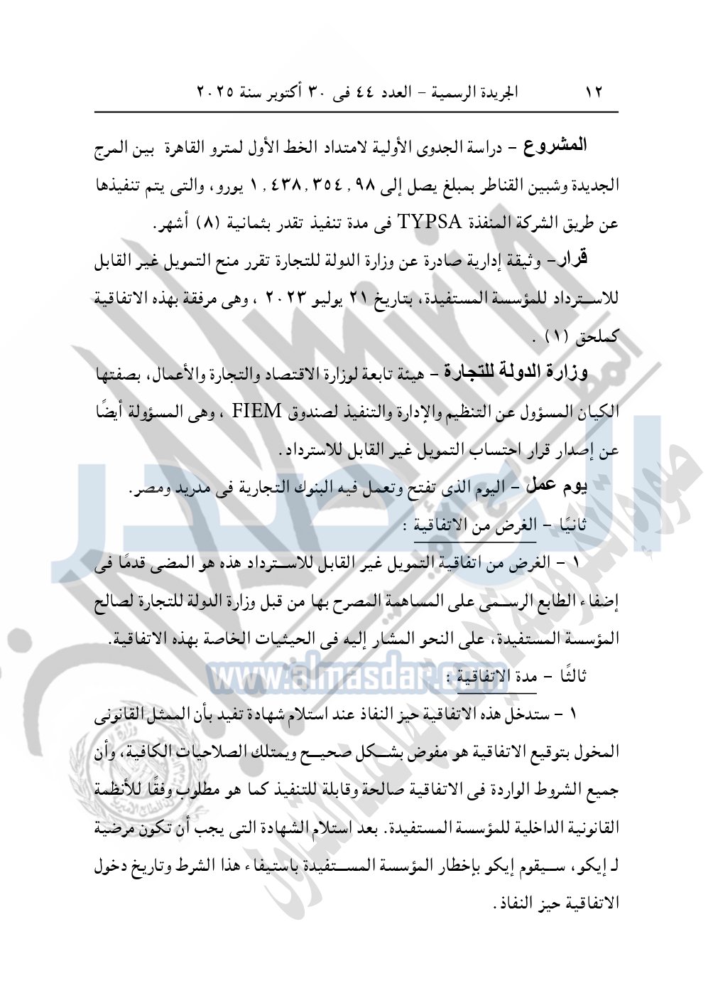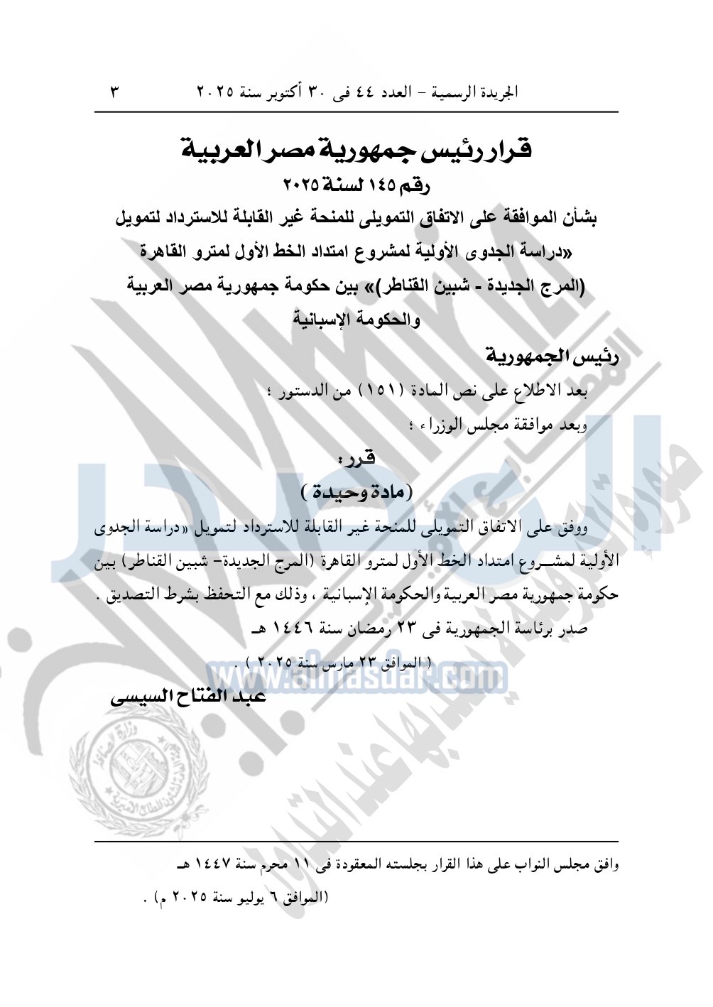 نشرت الجريدة الرسمية، في العدد 44 في 30 أكتوبر سنة 2025، قرار رئيس جمهورية مصر العربية، رقم 145 لسنة 2025، بشأن الموافقة على الاتفاق التمويلي للمنحة غير القابلة للاسترداد لتمويل «دراسة الجدوى الأولية لمشروع امتداد الخط الأول لمترو القاهرة "المرج الجديدة - شبين القناطر"» بين حكومة جمهورية مصر العربية والحكومة الإسبانية.