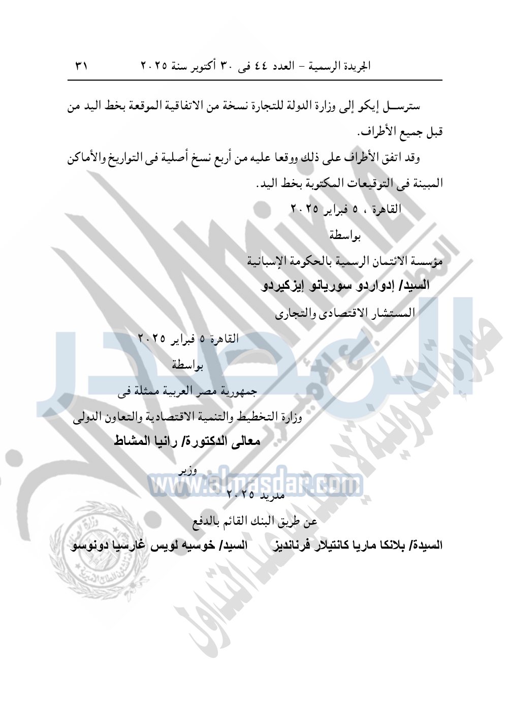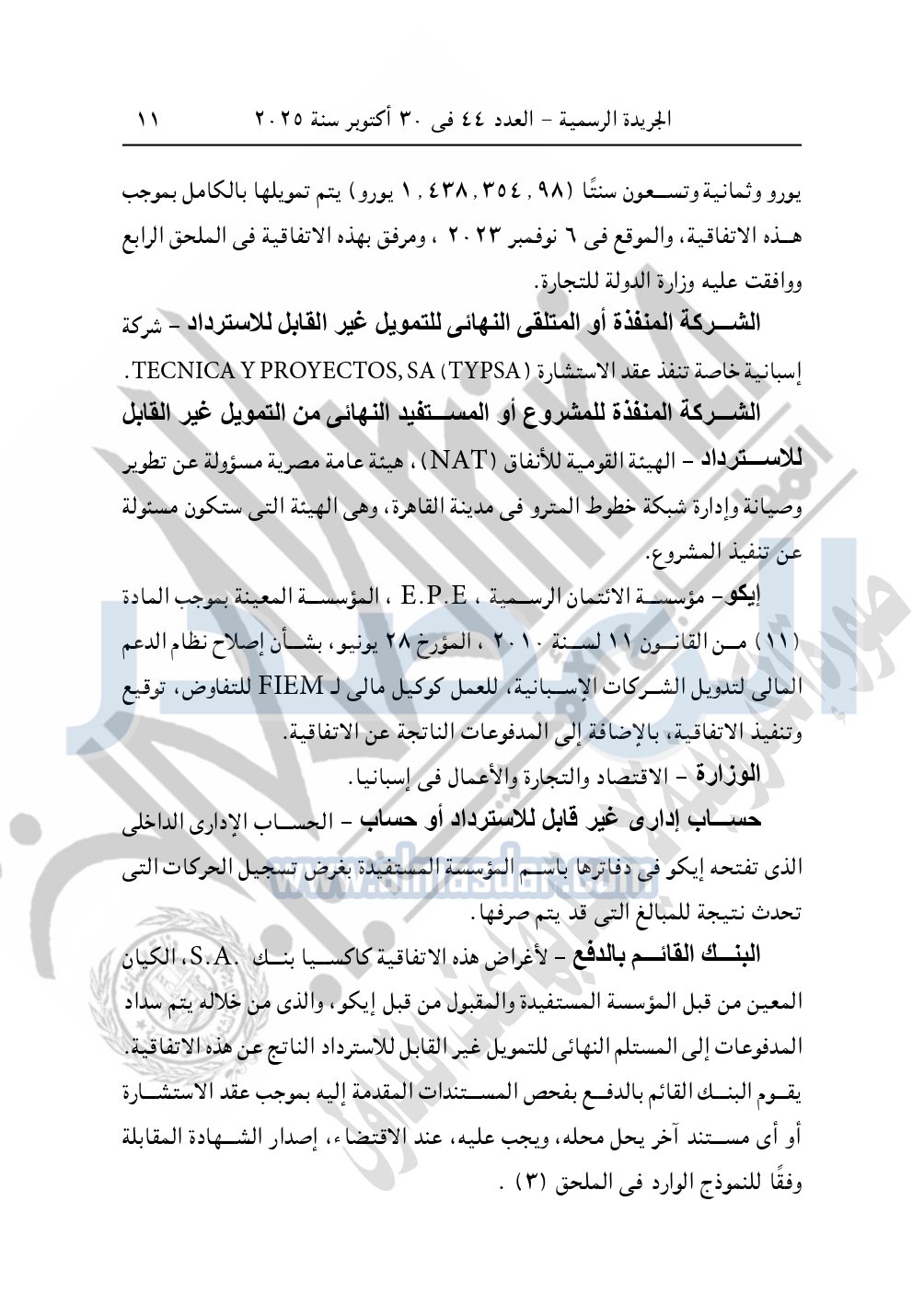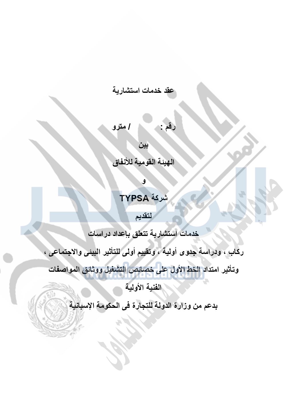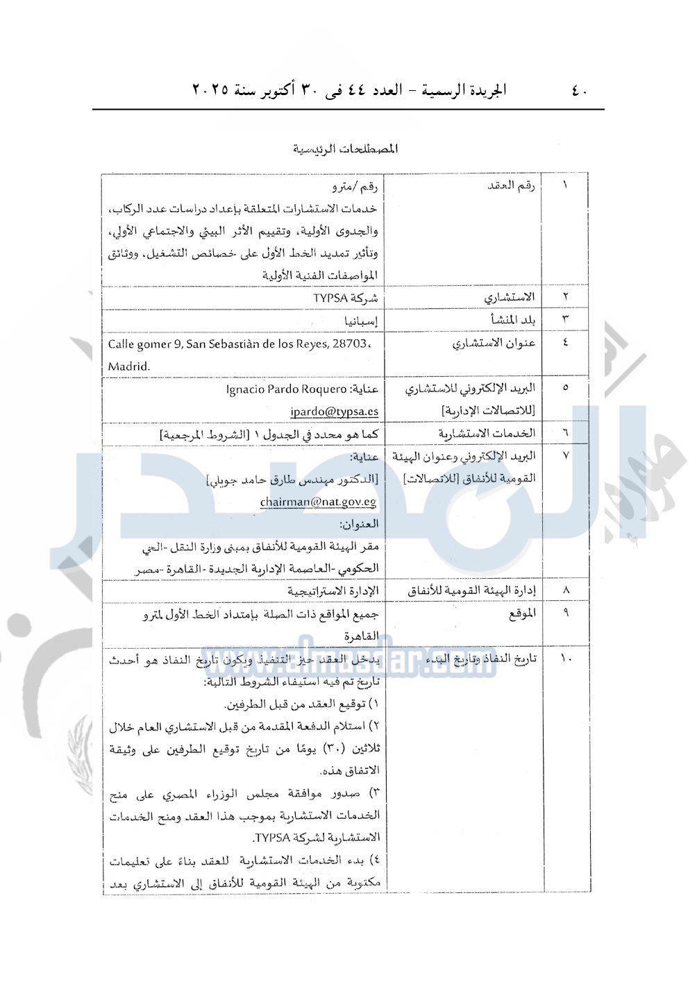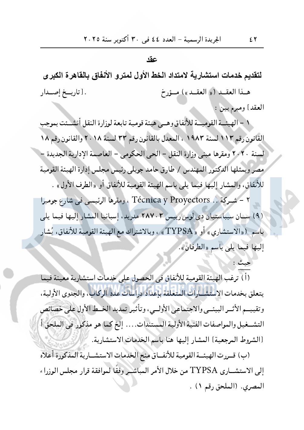 نشرت الجريدة الرسمية، في العدد 44 في 30 أكتوبر سنة 2025، قرار رئيس جمهورية مصر العربية، رقم 145 لسنة 2025، بشأن الموافقة على الاتفاق التمويلي للمنحة غير القابلة للاسترداد لتمويل «دراسة الجدوى الأولية لمشروع امتداد الخط الأول لمترو القاهرة "المرج الجديدة - شبين القناطر"» بين حكومة جمهورية مصر العربية والحكومة الإسبانية.