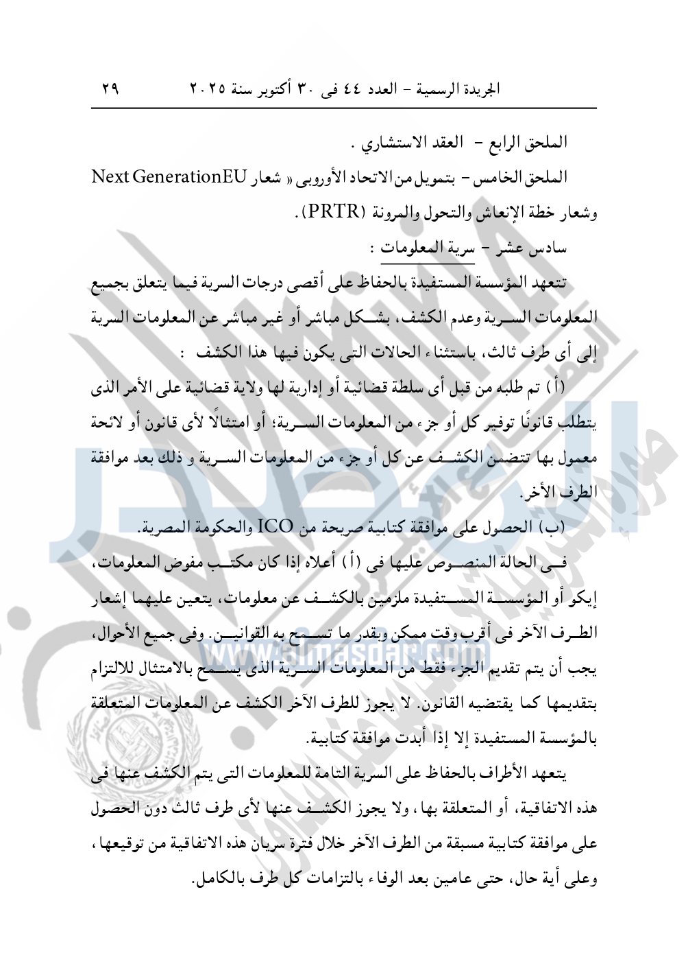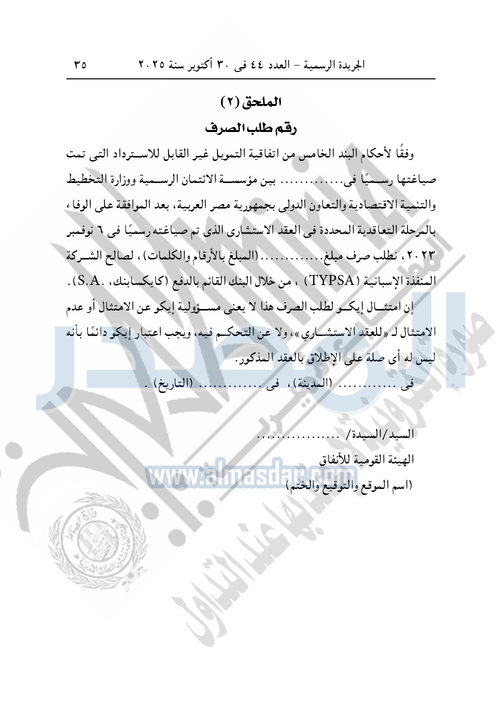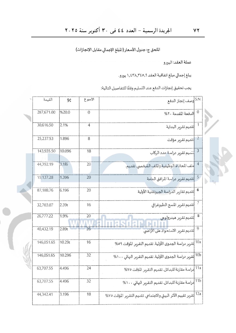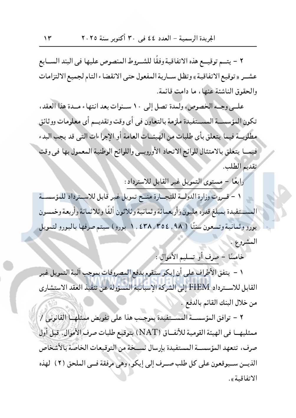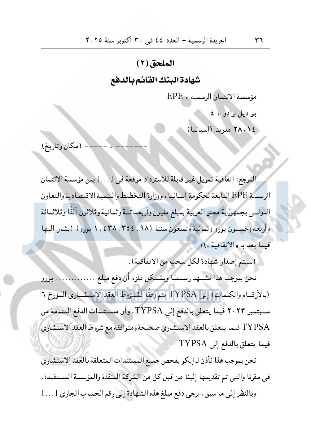نشرت الجريدة الرسمية، في العدد 44 في 30 أكتوبر سنة 2025، قرار رئيس جمهورية مصر العربية، رقم 145 لسنة 2025، بشأن الموافقة على الاتفاق التمويلي للمنحة غير القابلة للاسترداد لتمويل «دراسة الجدوى الأولية لمشروع امتداد الخط الأول لمترو القاهرة "المرج الجديدة - شبين القناطر"» بين حكومة جمهورية مصر العربية والحكومة الإسبانية.