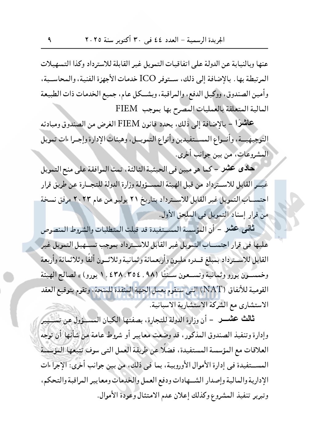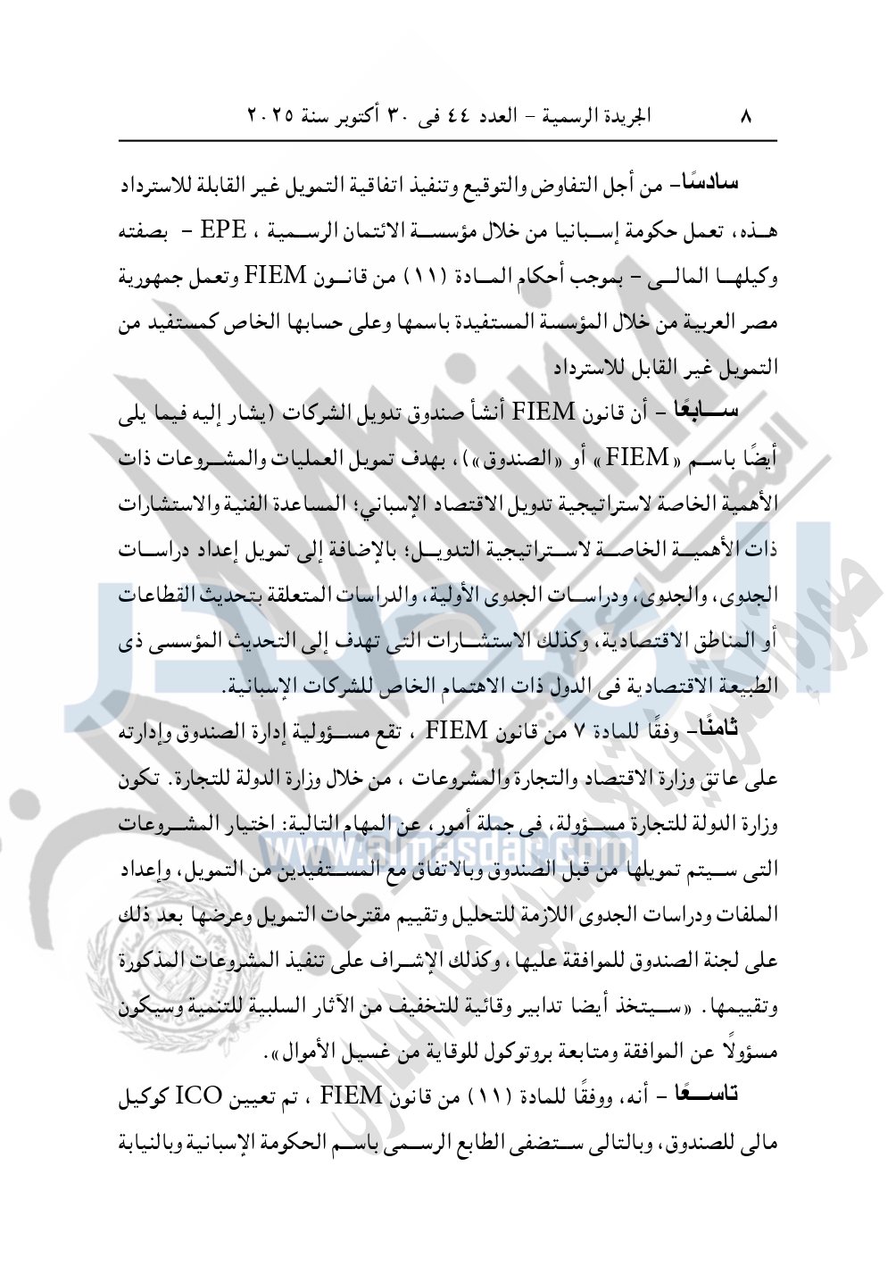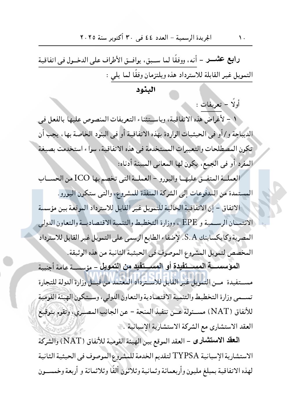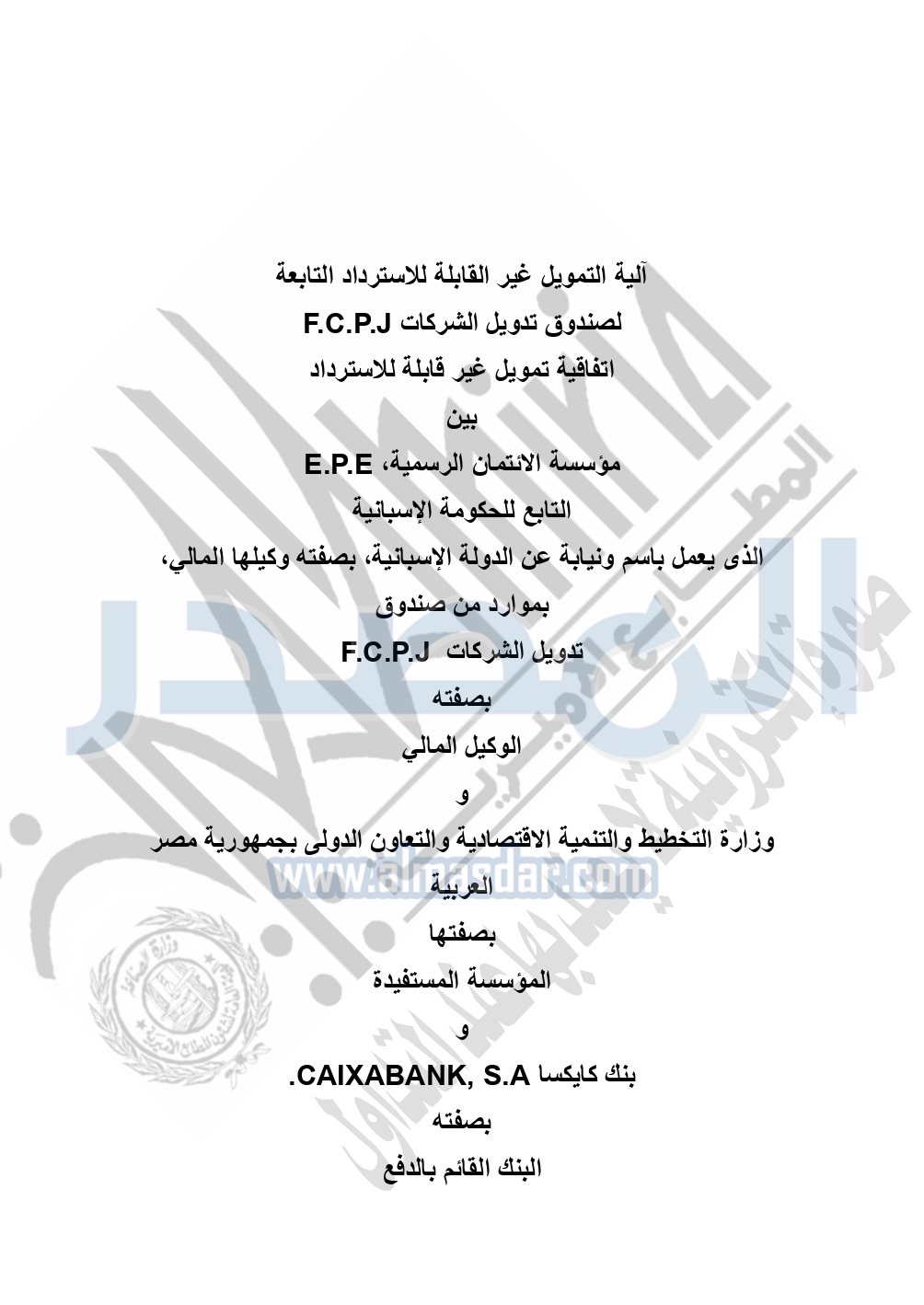 أوافق على الاتفاق التمويلي للمنحة غير القابلة للاسترداد لتمويل «دراسة الجدوى الأولية لمشروع امتداد الخط الأول لمترو القاهرة "المرج الجديدة - شبين القناطر"» بين حكومة جمهورية مصر العربية والحكومة الإسبانية، وذلك مع التحفظ بشرط التصديق.