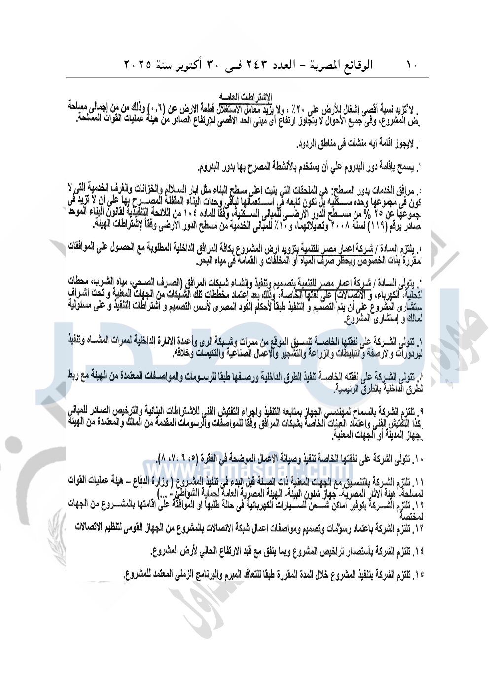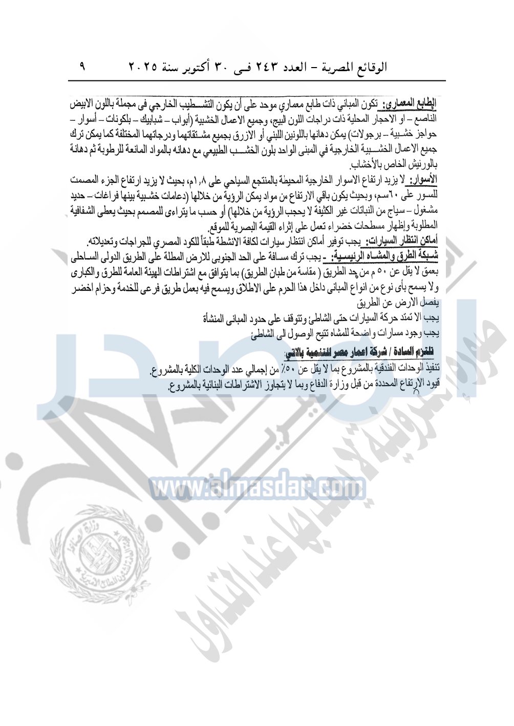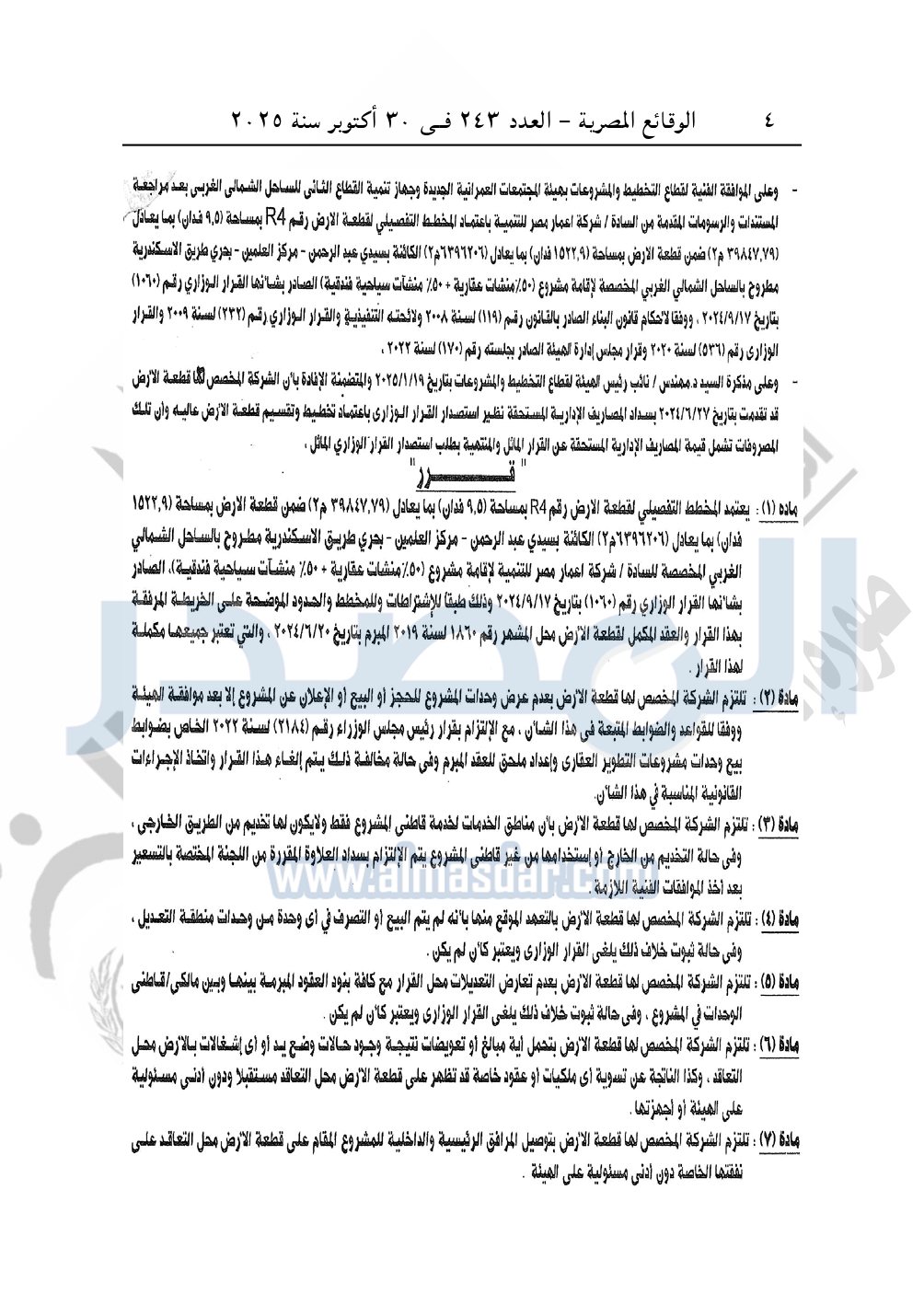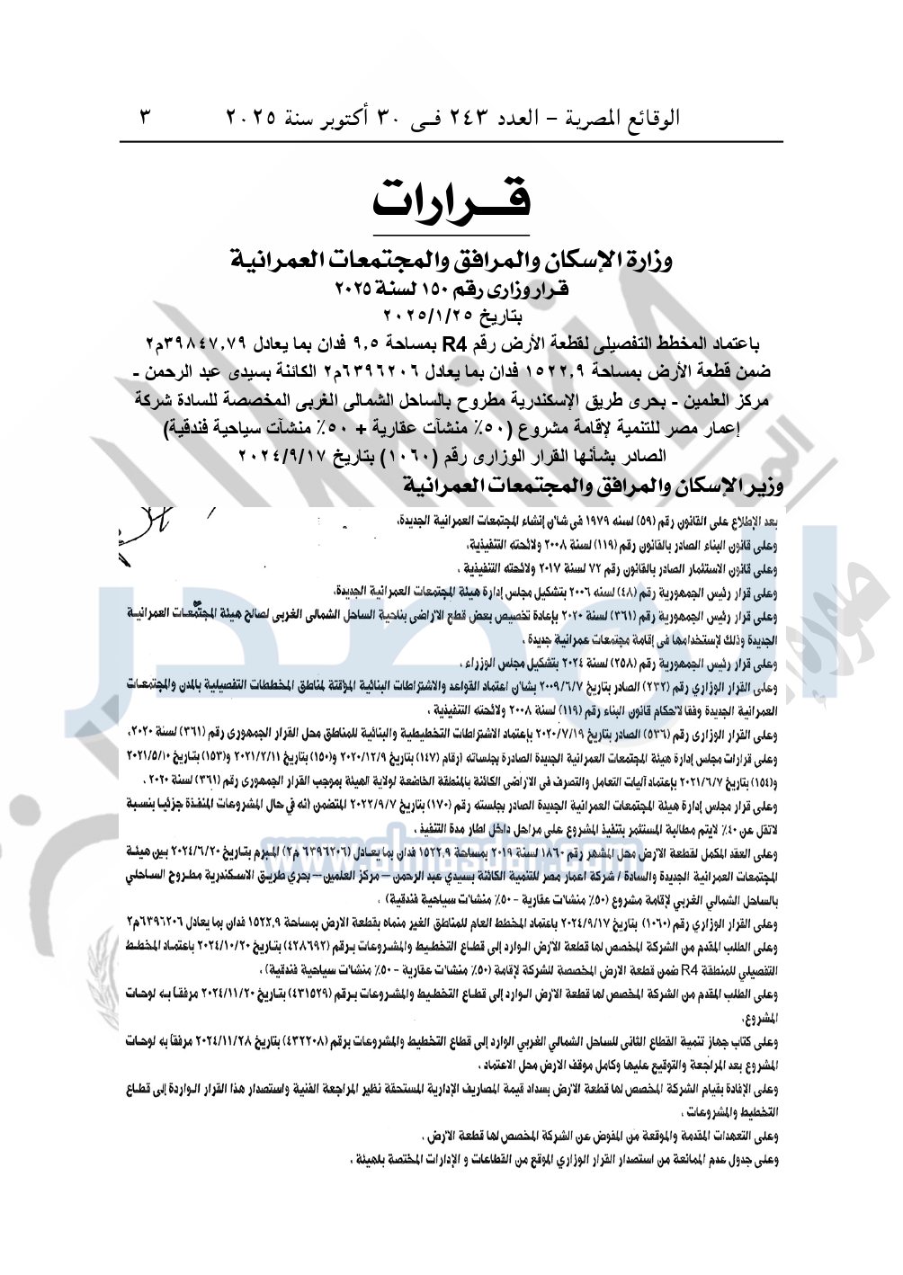 نشرت الوقائع المصرية، في العدد 243 في 30 أكتوبر سنة 2025، قرار وزارة الإسكان والمرافق والمجتمعات العمرانية، رقم 150 لسنة 2025، بتاريخ 25-1-2025، بشأن اعتماد المخطط التفصيلى لقطعة الأرض رقم R4 بمساحة 9.5 فدان بما يعادل 39847.79م2 ضمن قطعة الأرض بمساحة 1522.9 فدان بما يعادل 639620م2 الكائنة بسيدى عبد الرحمن - مركز العلمين - بحرى طريق الإسكندرية مطروح بالساحل الشمالى الغربى المخصصة لـ شركة إعمار مصر للتنمية لإقامة مشروع "50 منشأت عقارية + 50% منشآت سياحية فندقية" الصادر بشأنها القرار الوزارى رقم "1060" بتاريخ 17-9-2024.