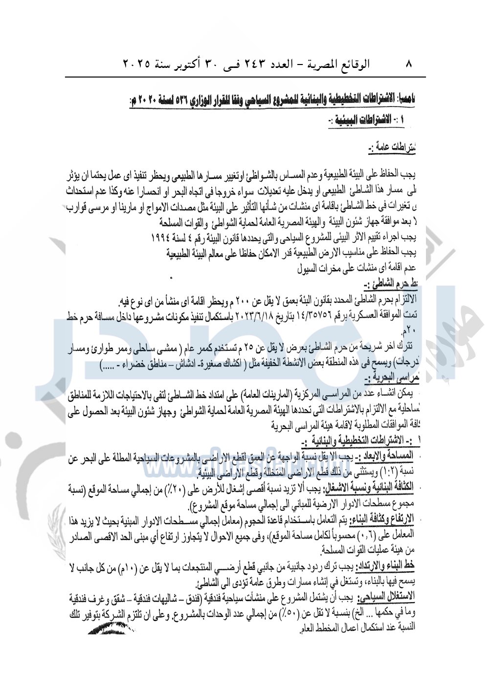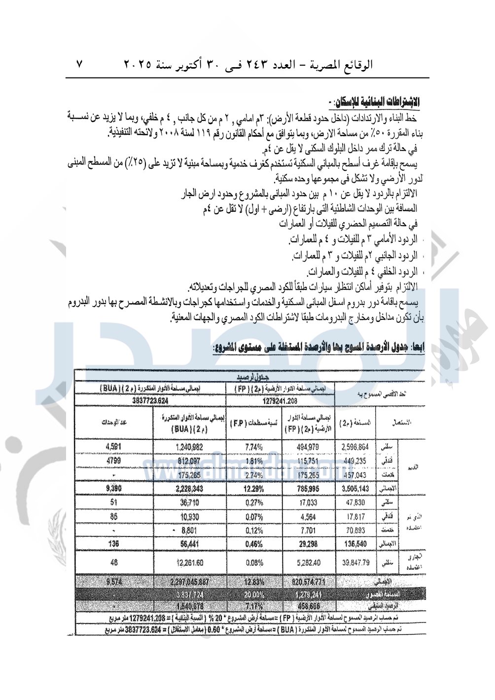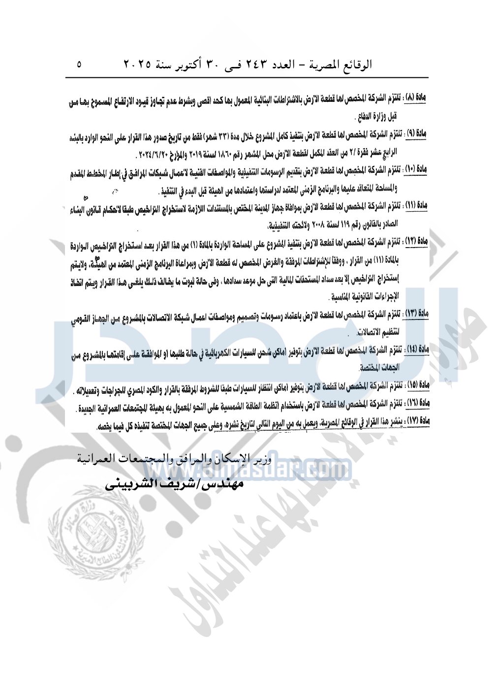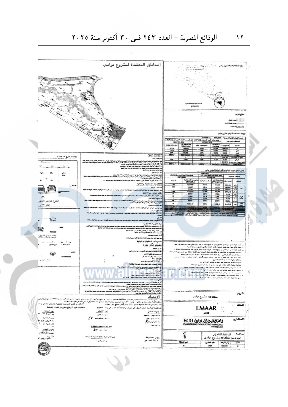 نشرت الوقائع المصرية، في العدد 243 في 30 أكتوبر سنة 2025، قرار وزارة الإسكان والمرافق والمجتمعات العمرانية، رقم 150 لسنة 2025، بتاريخ 25-1-2025، بشأن اعتماد المخطط التفصيلى لقطعة الأرض رقم R4 بمساحة 9.5 فدان بما يعادل 39847.79م2 ضمن قطعة الأرض بمساحة 1522.9 فدان بما يعادل 639620م2 الكائنة بسيدى عبد الرحمن - مركز العلمين - بحرى طريق الإسكندرية مطروح بالساحل الشمالى الغربى المخصصة لـ شركة إعمار مصر للتنمية لإقامة مشروع "50 منشأت عقارية + 50% منشآت سياحية فندقية" الصادر بشأنها القرار الوزارى رقم "1060" بتاريخ 17-9-2024.