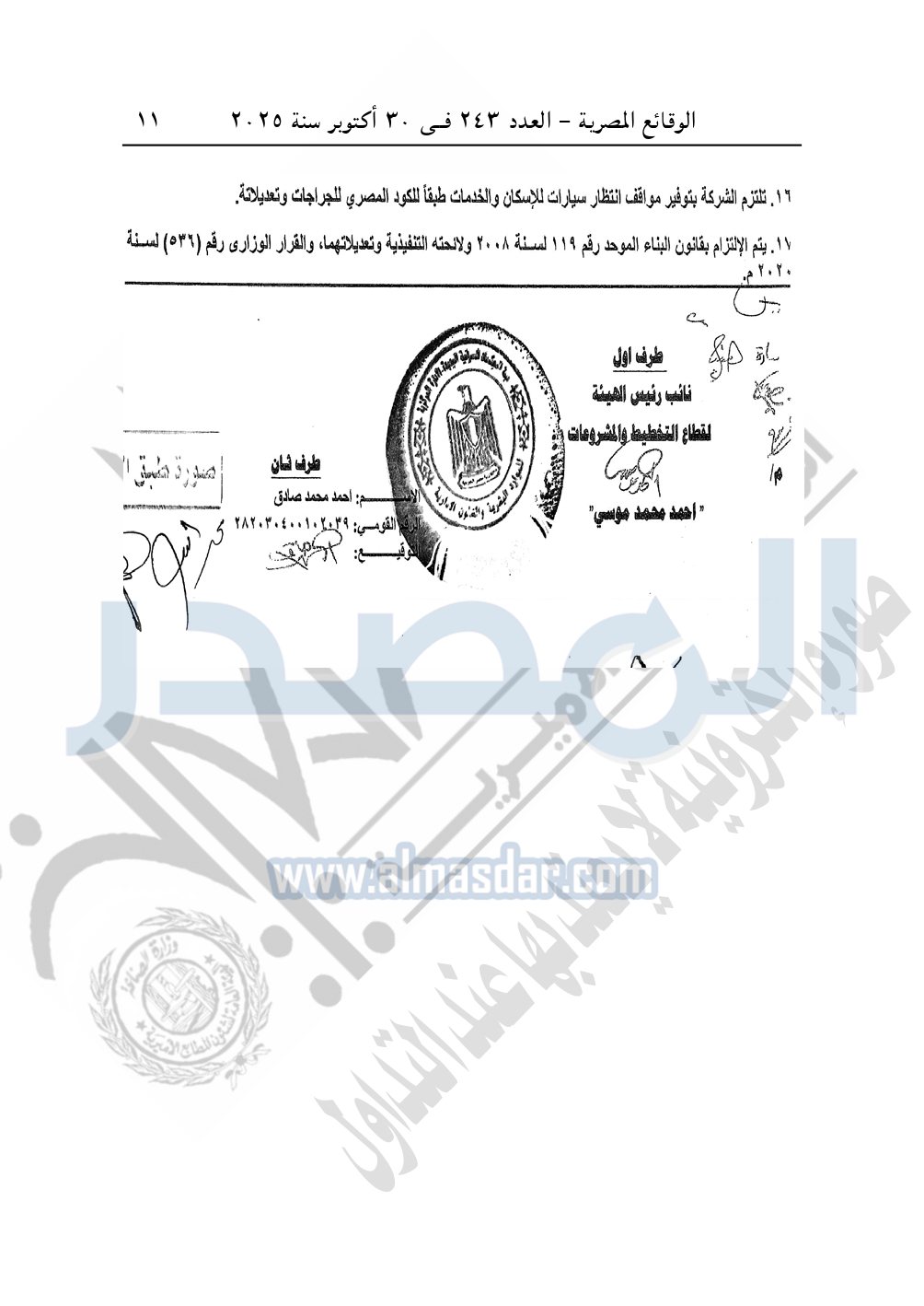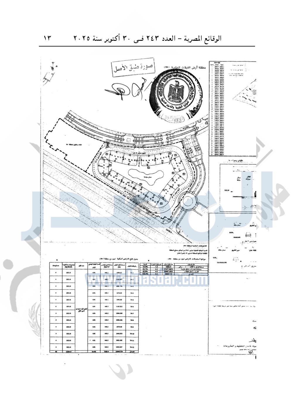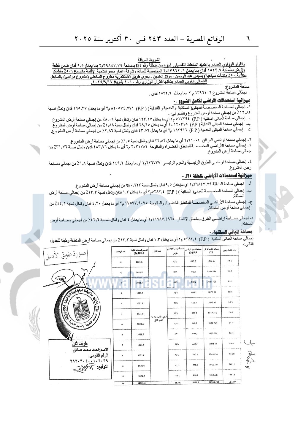 يعتمد المخطط التفصيلى لقطعة الأرض رقم R4 بمساحة 9.5 فدان بما يعادل 39847.79م2 ضمن قطعة الأرض بمساحة 1522.9 فدان بما يعادل 639620م2 الكائنة بسيدى عبد الرحمن - مركز العلمين - بحرى طريق الإسكندرية مطروح بالساحل الشمالى الغربى المخصصة لـ شركة إعمار مصر للتنمية لإقامة مشروع "50 منشأت عقارية + 50% منشآت سياحية فندقية" الصادر بشأنها القرار الوزارى رقم "1060" بتاريخ 17-9-2024، وذلك طبقا للإشتراطات وللمخطط والحدود الموضحة على الخريطة المرفقة بهذا القرار والعقد المكمل لقطعة الأرض محل المشهر رقم 1860 لسنة 2019 المبرم بتاريخ 20-6-2024، والتي تعتبر جميعها مكملة لهذا القرار.
