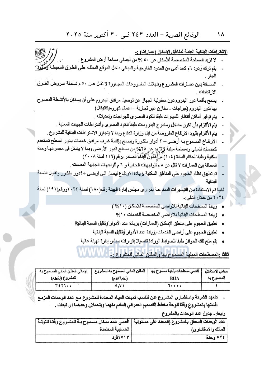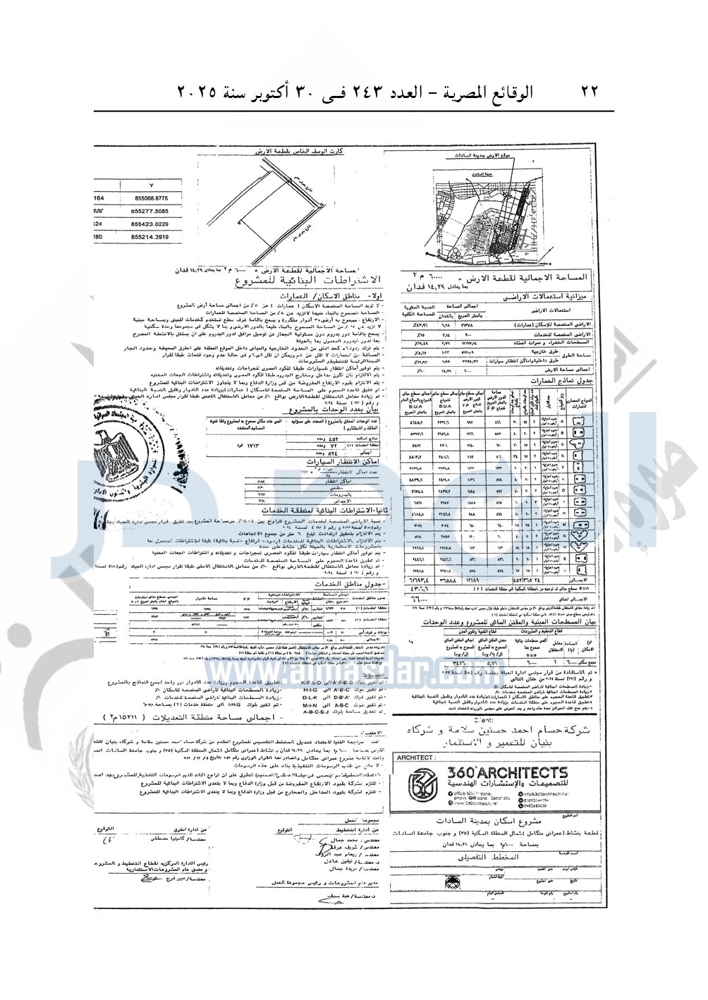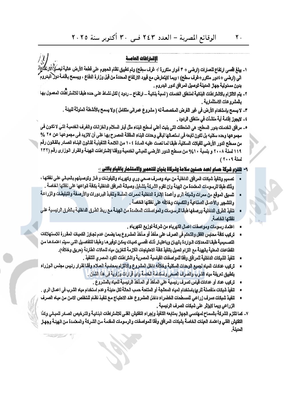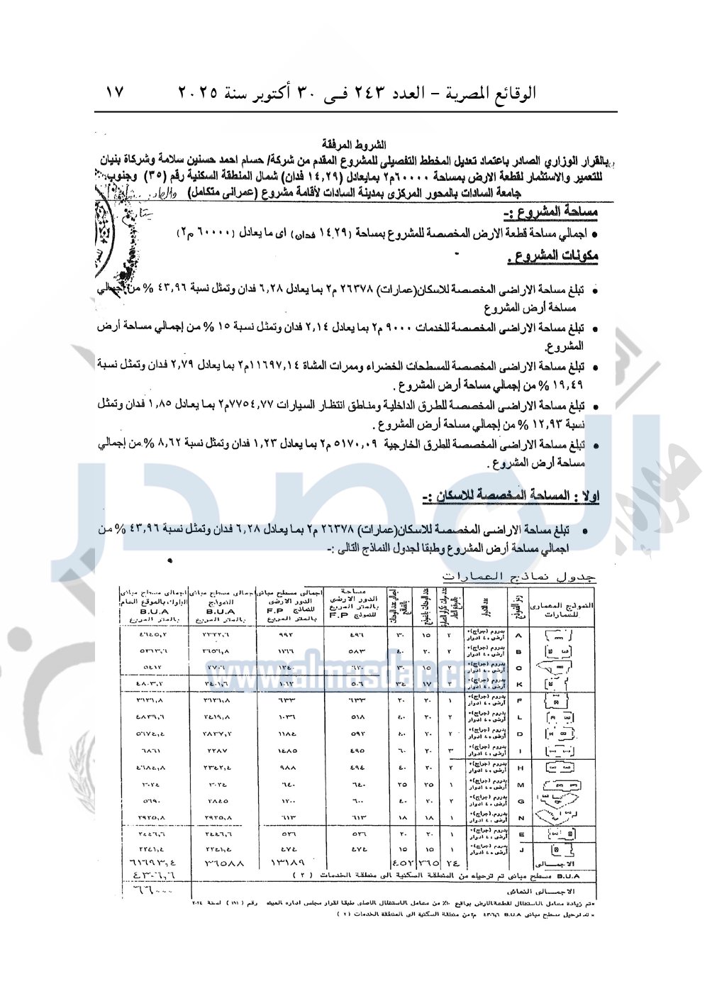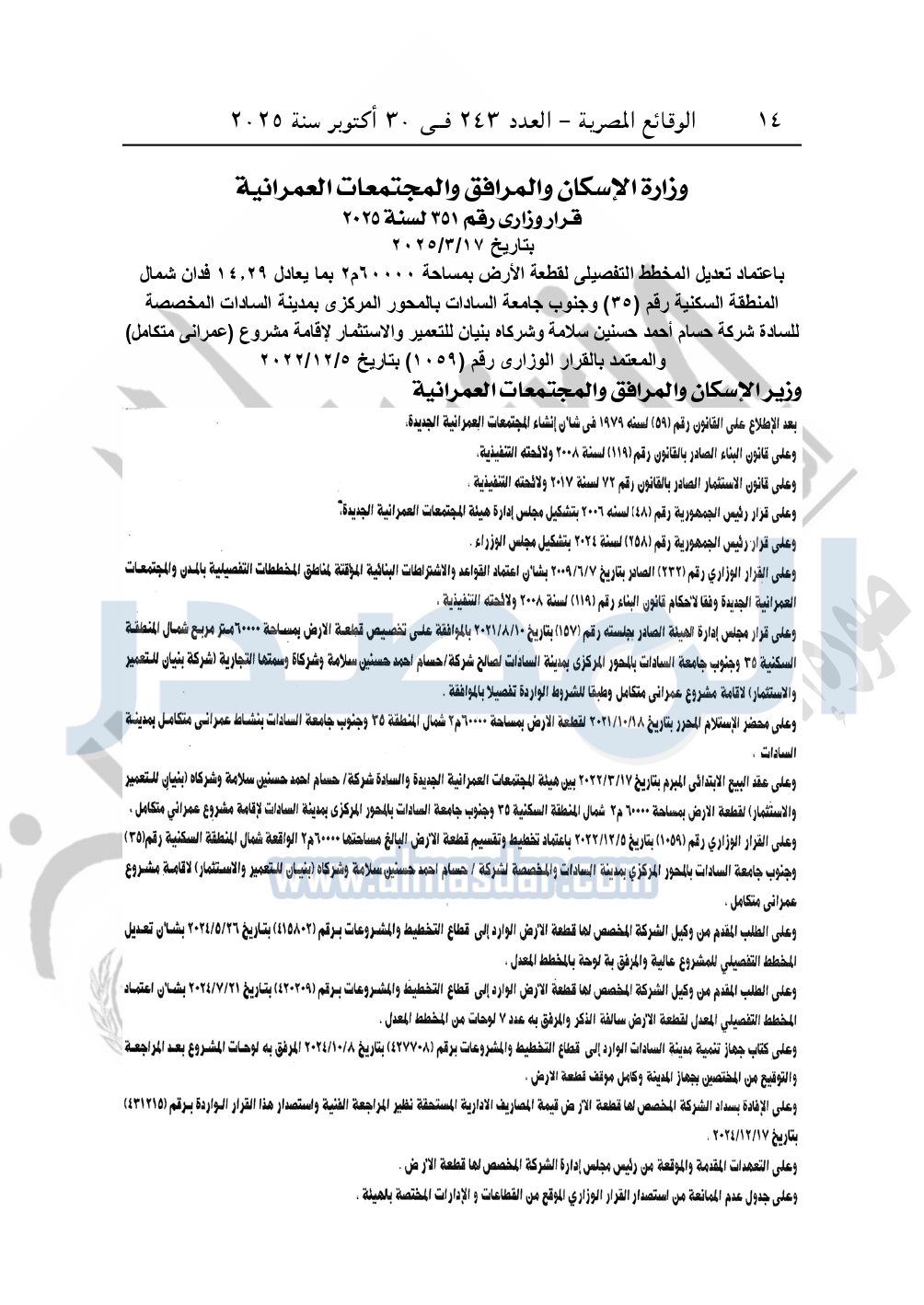نشرت الوقائع المصرية، في العدد 243 في 30 أكتوبر سنة 2025، قرار وزارة الإسكان والمرافق والمجتمعات العمرانية، رقم 351 لسنة 2025، بتاريخ 17-3-2025، بشأن إعتماد تعديل المخطط التفصيلى لقطعة الأرض بمساحة 60000م2 بما يعادل 14.29 فدان شمال المنطقة السكنية رقم "35" وجنوب جامعة السادات بالمحور المركزى بمدينة السادات المخصصة لـ شركة حسام أحمد حسنين سلامة وشركاه بنيان للتعمير والاستثمار لإقامة مشروع "عمراني متكامل" والمعتمد بالقرار الوزارى رقم "1059" بتاريخ 5-12-2022.