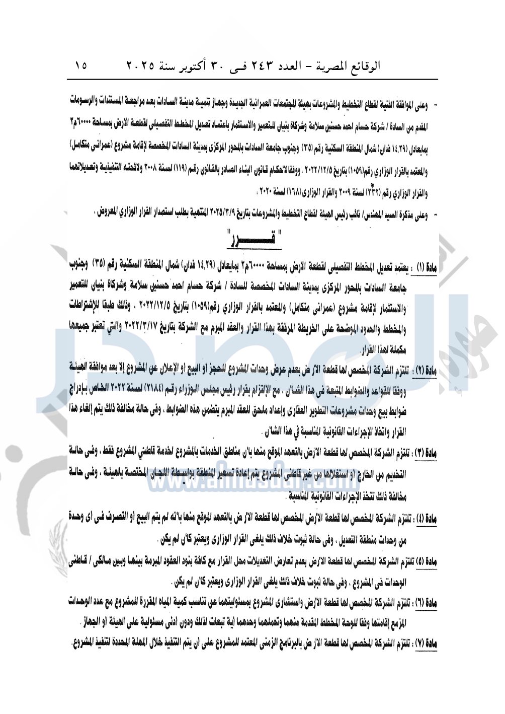 يعتمد تعديل المخطط التفصيلى لقطعة الأرض بمساحة 60000م2 بما يعادل 14.29 فدان شمال المنطقة السكنية رقم "35" وجنوب جامعة السادات بالمحور المركزى بمدينة السادات المخصصة لـ شركة حسام أحمد حسنين سلامة وشركاه بنيان للتعمير والاستثمار لإقامة مشروع "عمراني متكامل" والمعتمد بالقرار الوزارى رقم "1059" بتاريخ 5-12-2022، وذلك طبقا للإشتراطات والمخطط والحدود الموضحة على الخريطة المرفقة بهذا القرار والعقد المبرم مع الشركة بتاريخ 17-3-2022 والتي تعتبر جميعها مكملة لهذا القرار.