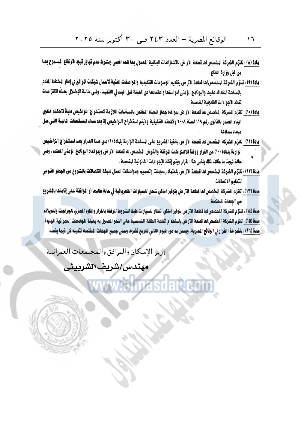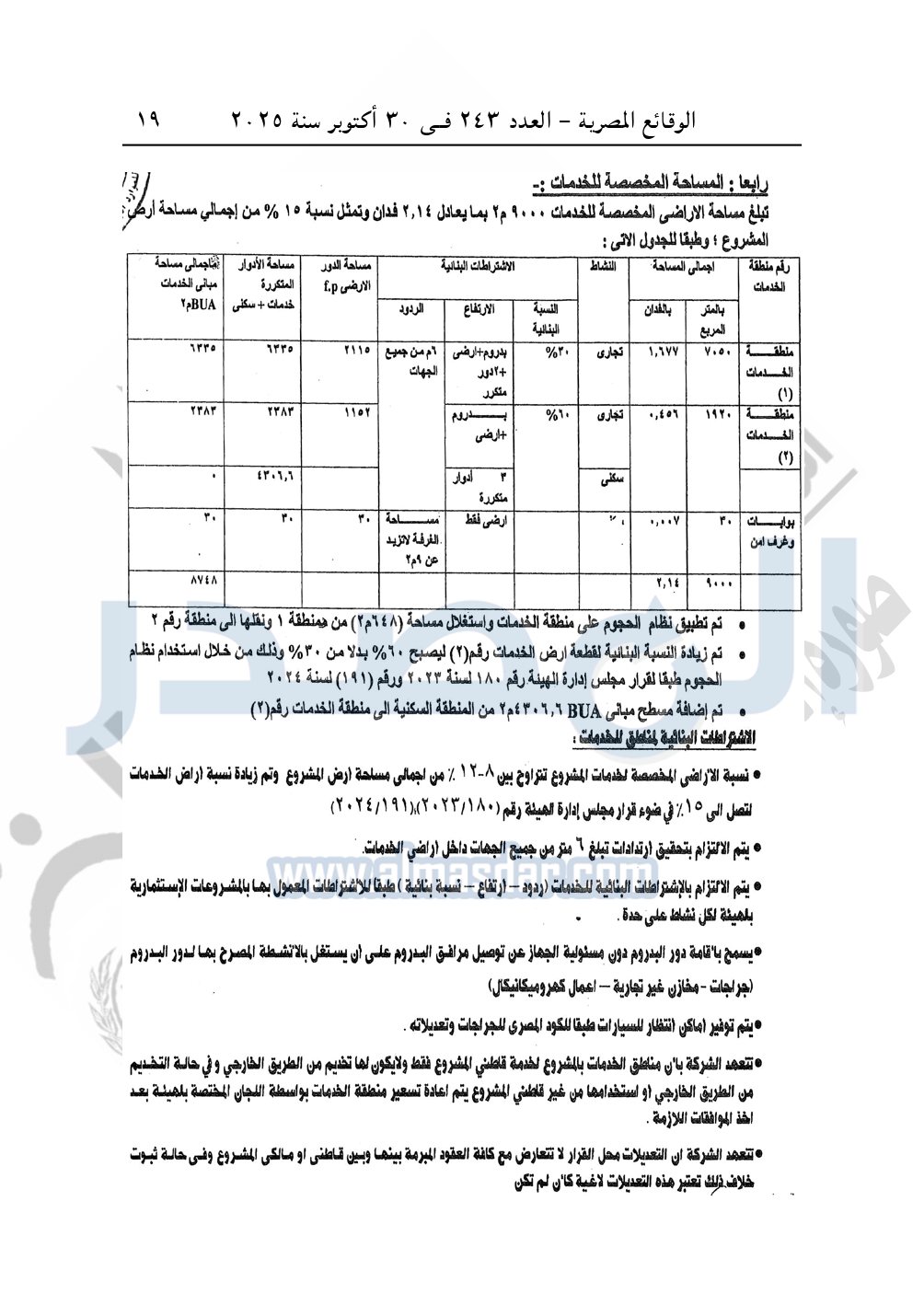 تلتزم الشركة المخصص لها قطعة الارض بعدم تعارض التعديلات محل القرار مع كافة بنود العقود المبرمة بينها وبين مالكي - قاطنى الوحدات في المشروع ، وفى حالة ثبوت خلاف ذلك يلغى القرار الوزاري ويعتبر كان لم يكن.