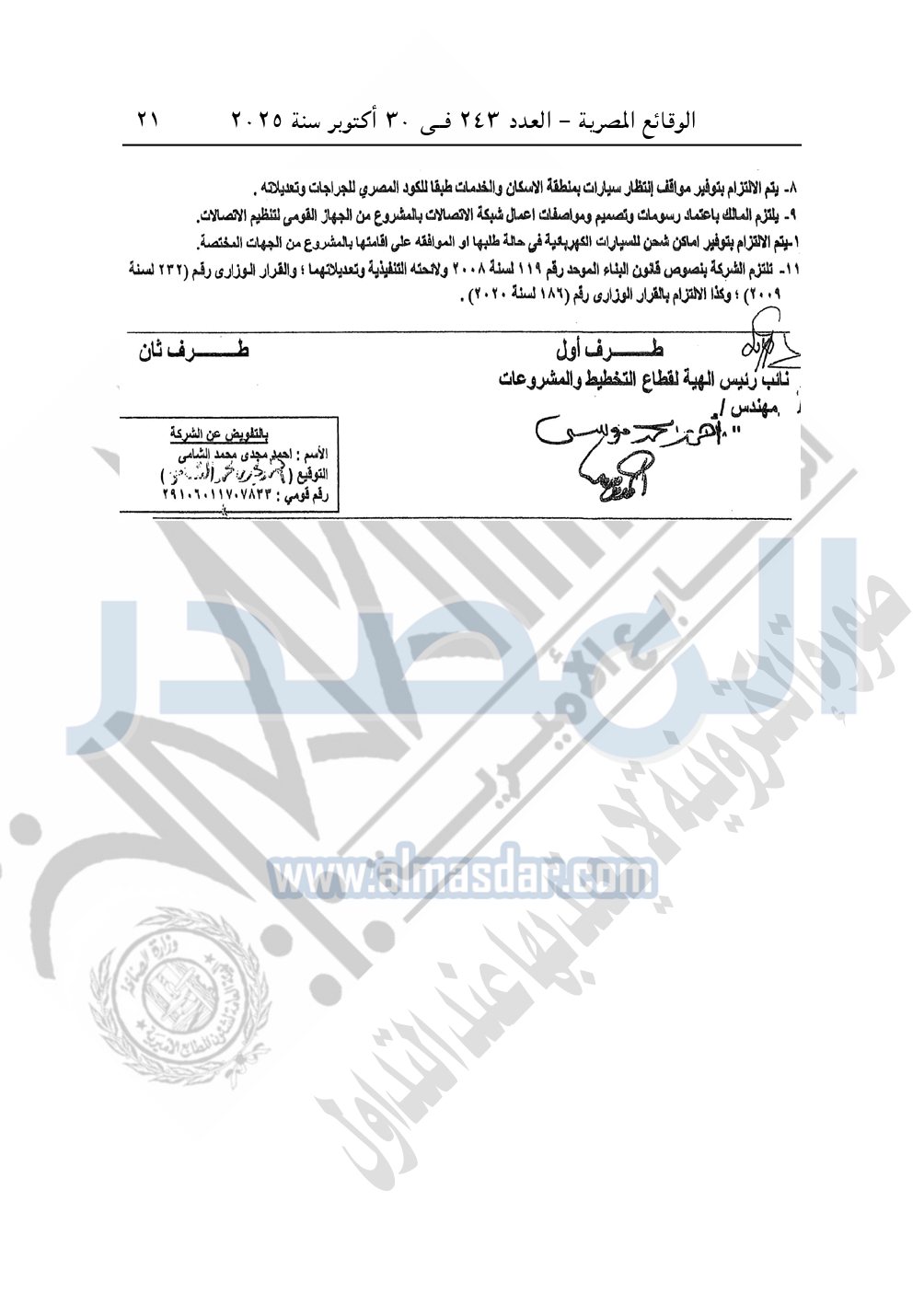 تلتزم الشركة المخصص لها قطعة الأرض واستشارى المشروع بمسئوليتهما عن تناسب كمية المياه المقررة للمشروع مع عدد الوحدات المزمع إقامتها وفقا للوحة المخطط المقدمة منهما وتحملهما وحدهما أية تبعات لذلك ودون أدنى مسئولية على الهيئة أو الجهاز.