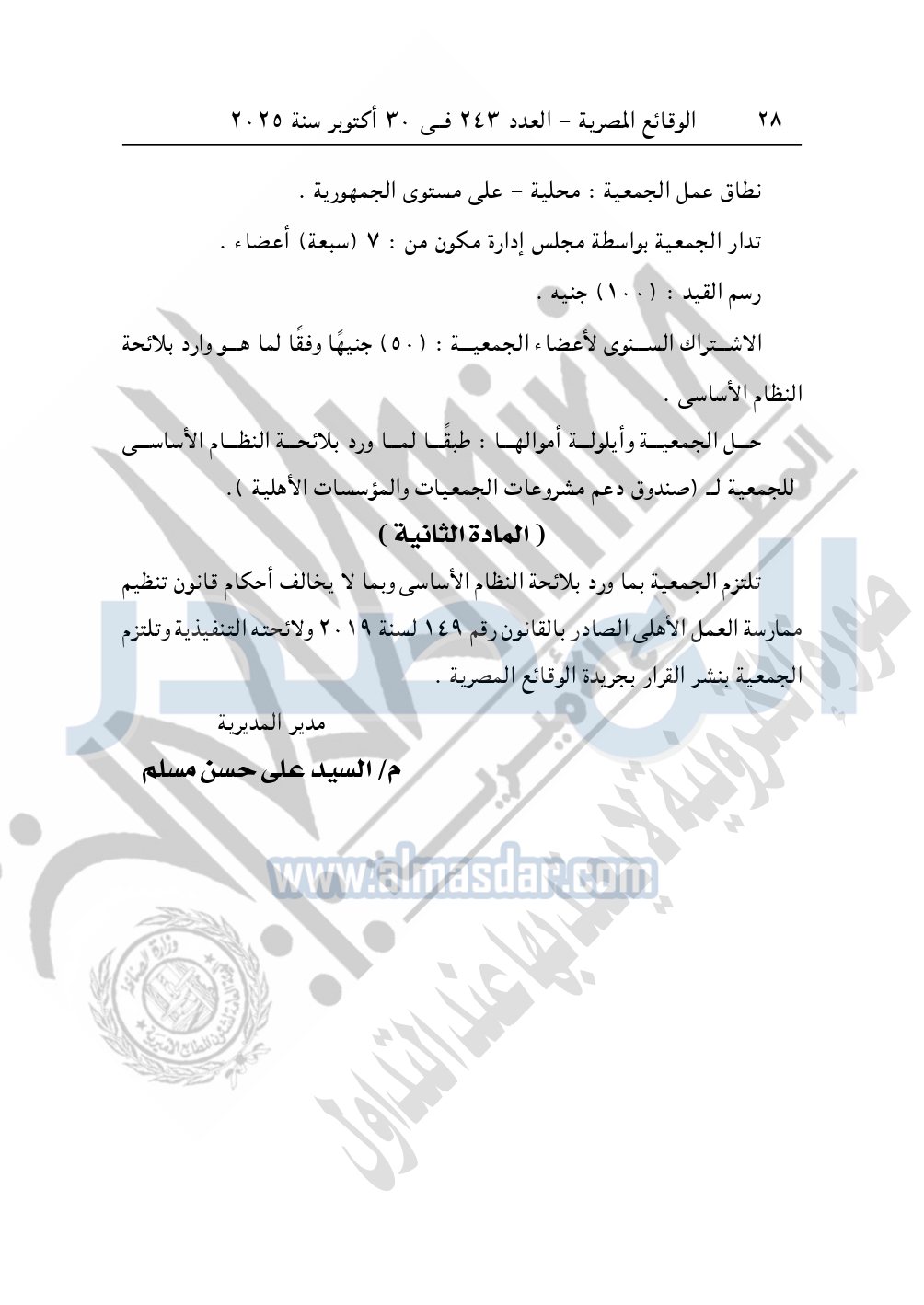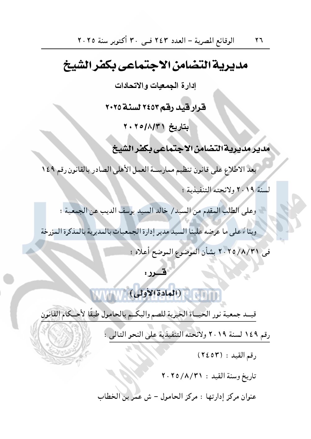 نشرت الوقائع المصرية في العدد 243، بتاريخ 30 أكتوبر 2025، قرار مديرية التضامن الاجتماعي بكفر الشيخ، قيد رقم 2453 لسنة 2025، بتاريخ 31-8-2025، بشأن قيد جمعية نور الحياة الخيرية للصم والبكم بالحامول.