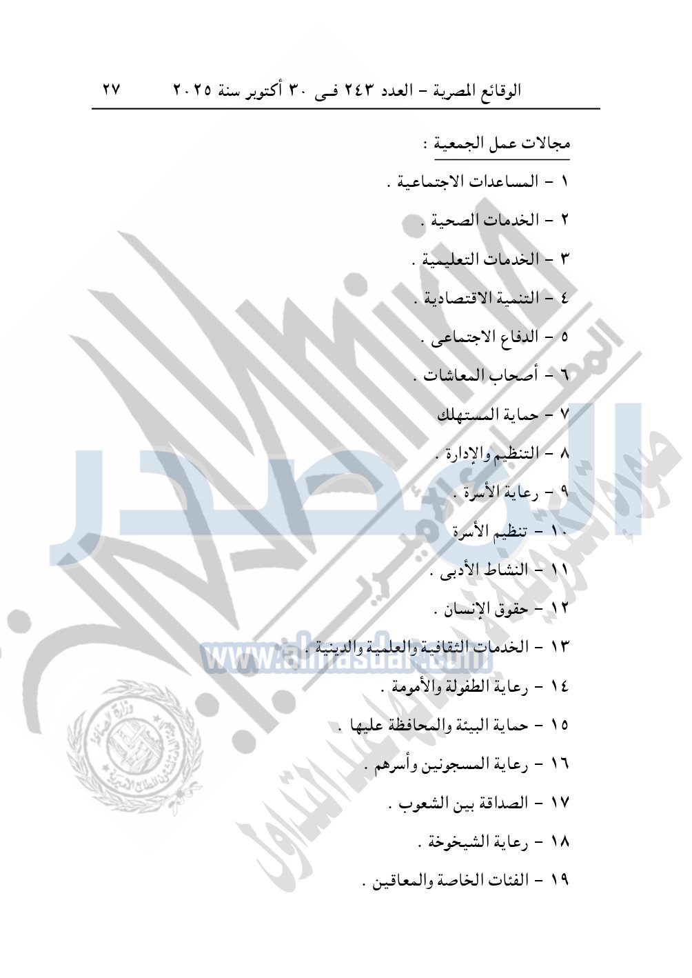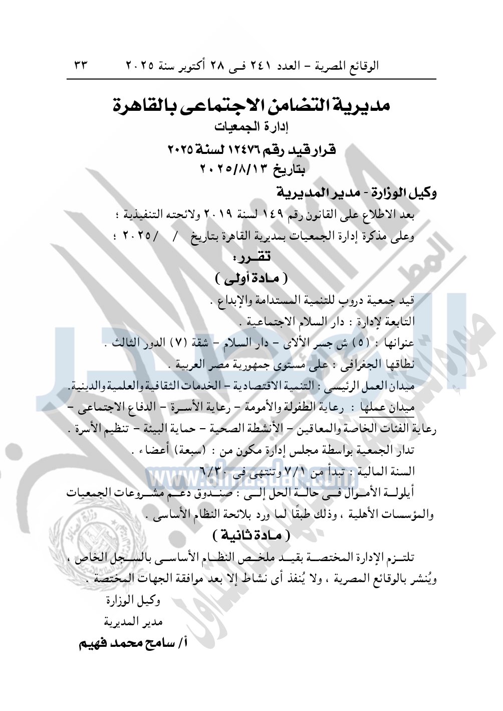كما نشرت الوقائع المصرية في العدد 241، بتاريخ 28 أكتوبر 2025، قرار مديرية التضامن الاجتماعي بالقاهرة، قيد رقم 12476 لسنة 2025، بتاريخ 13-8-2025، بشأن قيد جمعية دروب للتنمية المستدامة والإبداع.