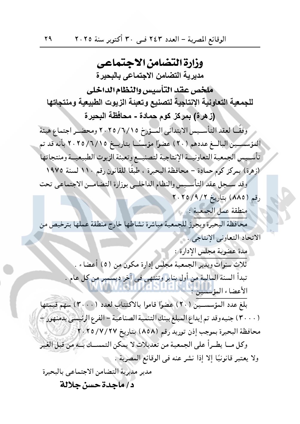 نشرت الوقائع المصرية في العدد 243، بتاريخ 30 أكتوبر 2025، قرار وزارة التضامن الاجتماعي، مديرية التضامن الاجتماعي بالبحيرة، بشأن ملخص عقد التأسيس والنظام الداخلى للجمعية التعاونية الإنتاجية لتصنيع وتعبئة الزيوت الطبيعية ومنتجاتها "زهرة" بمركز كوم حمادة - محافظة البحيرة.